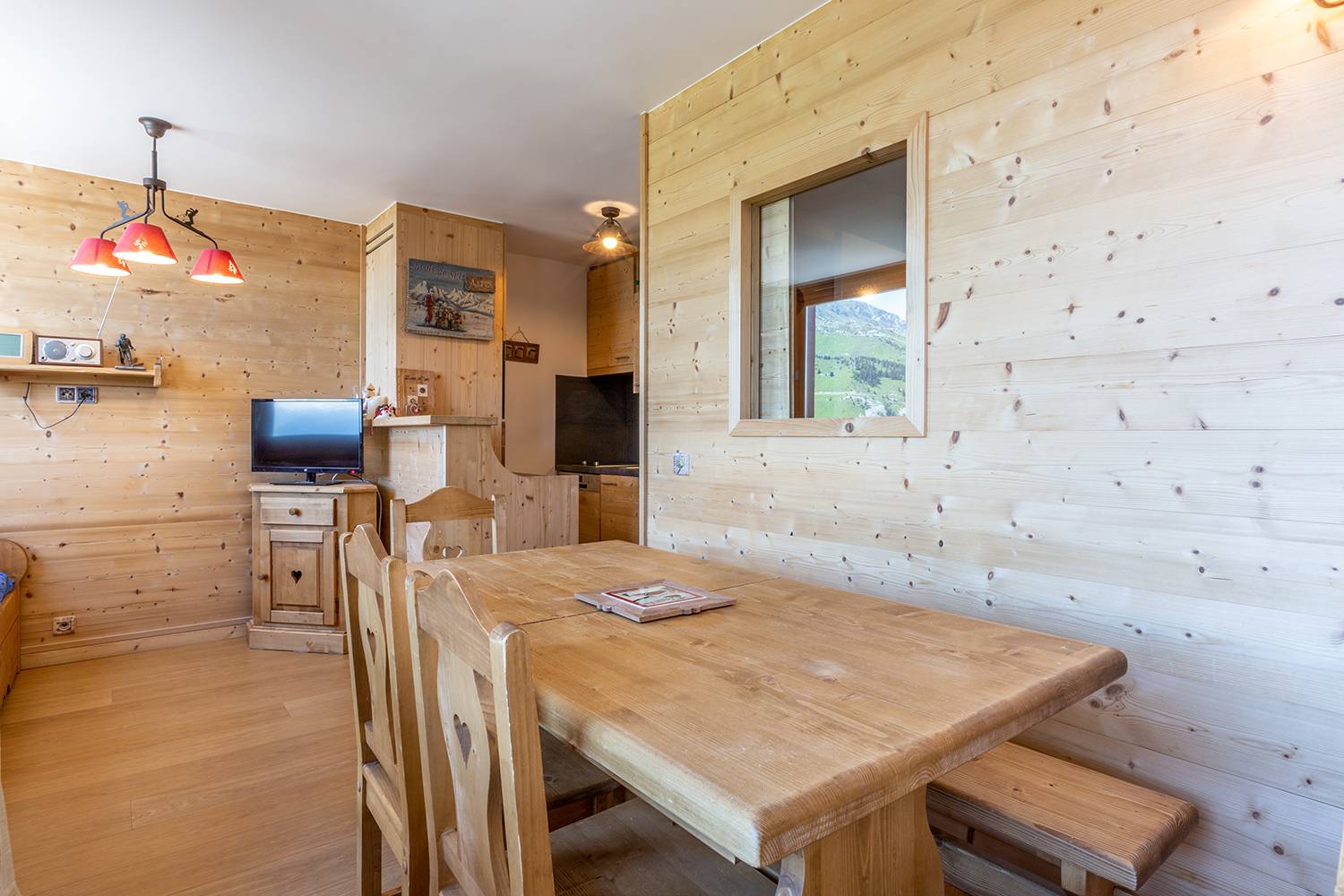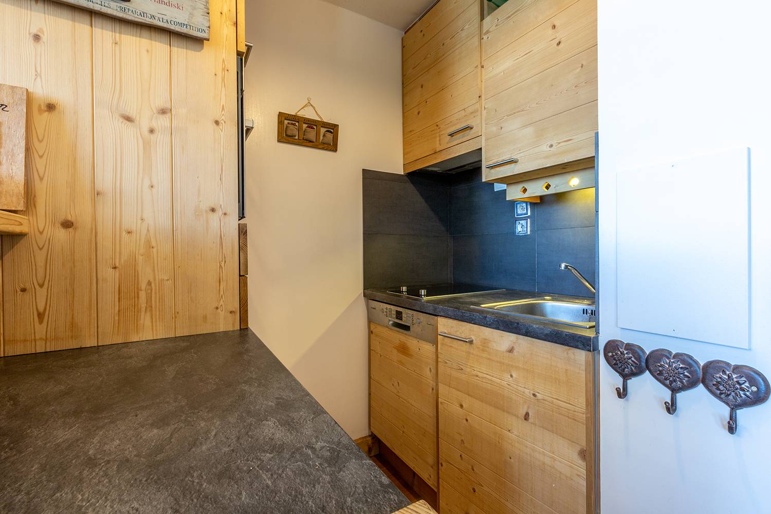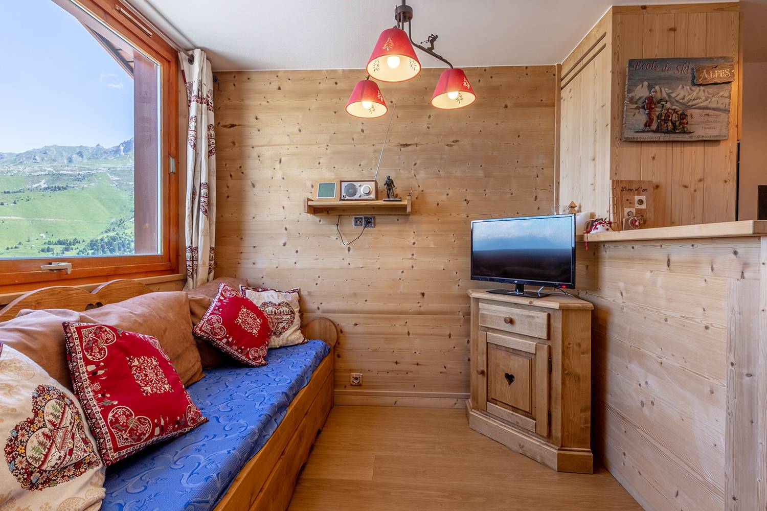 Agréable 2 pièces d'environ 35m² avec coin montagne. Équipé pour 5/6 personnes. Cet appartement est de très bon confort, aménagé et décoré avec beaucoup de goût. La chambre et le coin séjour sont lambrissés. Le séjour est équipé d'une banquette lit et d'un lit gigogne (80x190). La cuisine est neuve, équipée d'un four, réfrigérateur, lave-vaisselle, hotte, plaque vitrocéramique, bouilloire, cafetière.