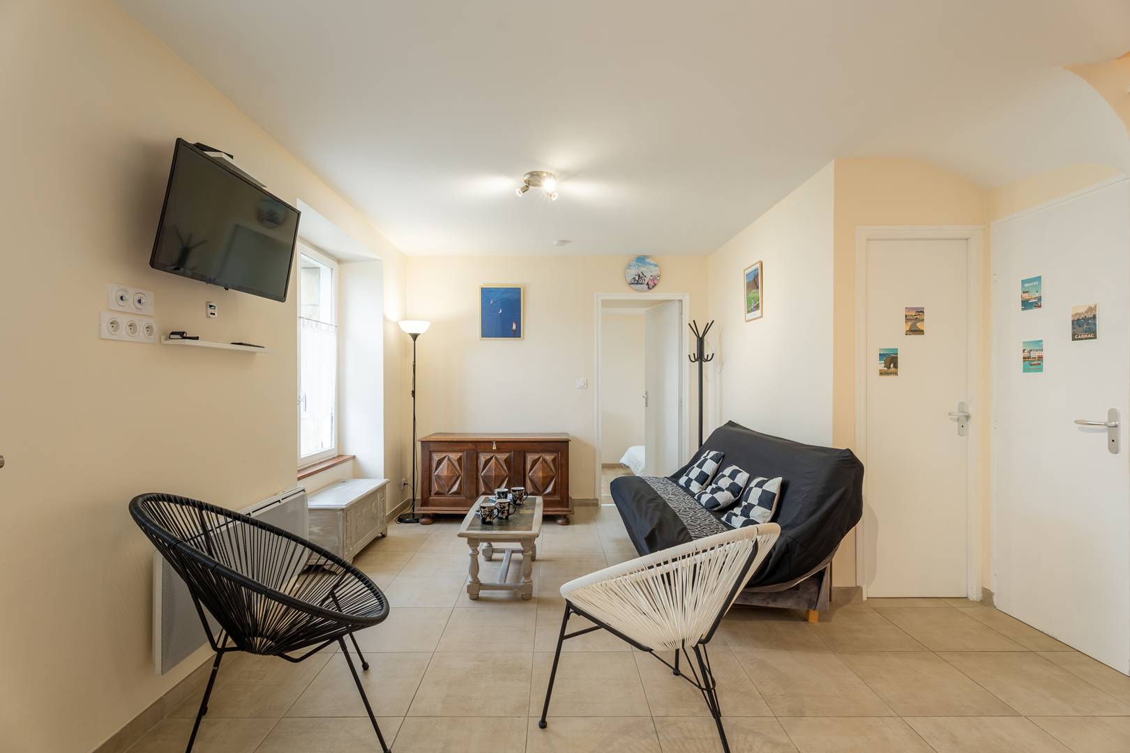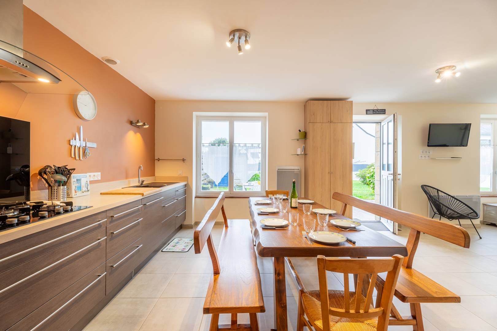 - Entrée directe depuis terrasse sur grande pièce de vie : Séjour / Salon (canapé, TV) et salle à manger (grande table familiale)