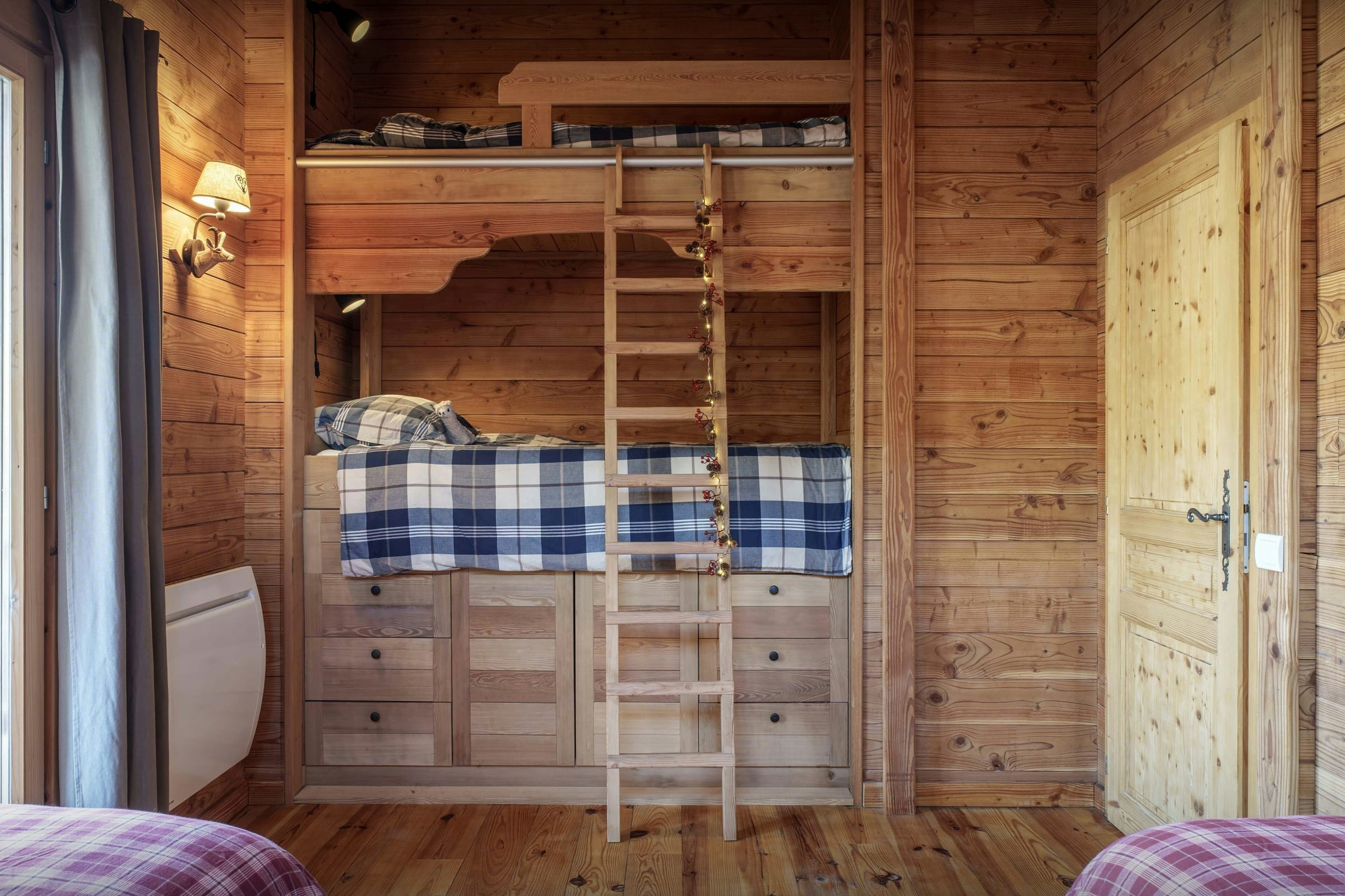Les chambres aménagées sous le toit offrent une ambiance chaleureuse, notamment le dortoir, pensé pour quatre enfants ou adolescents. Le chalet dispose d’ailleurs d’un bon ratio entre chambres et salles de bains / toilettes.