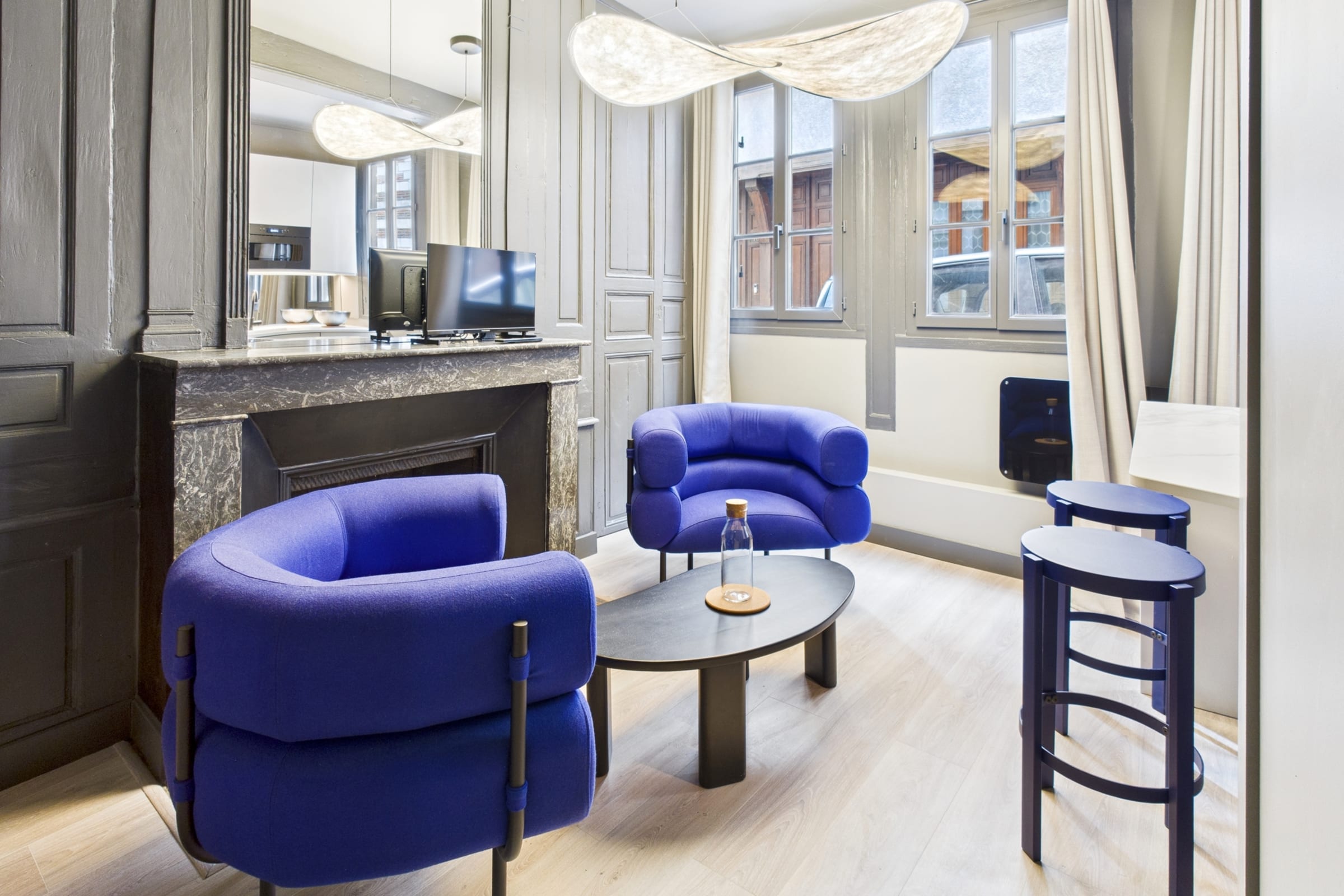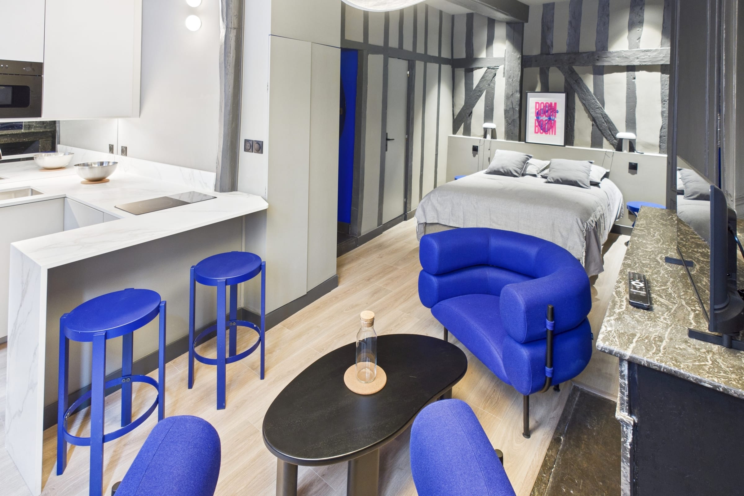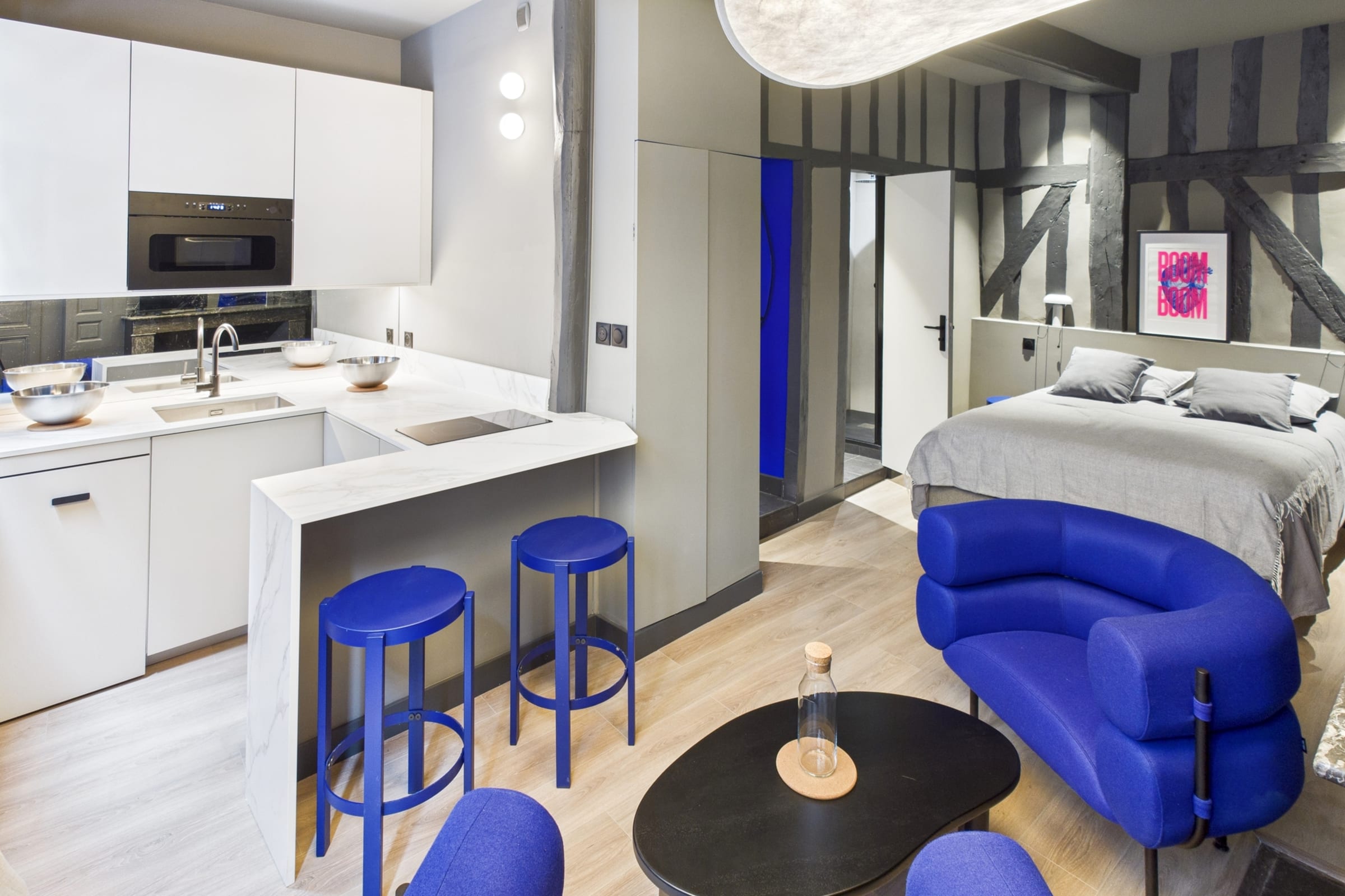 ✨ Studio atypique au design soigné, sublimé par un mobilier bleu Majorelle, pour un séjour plein de charme.