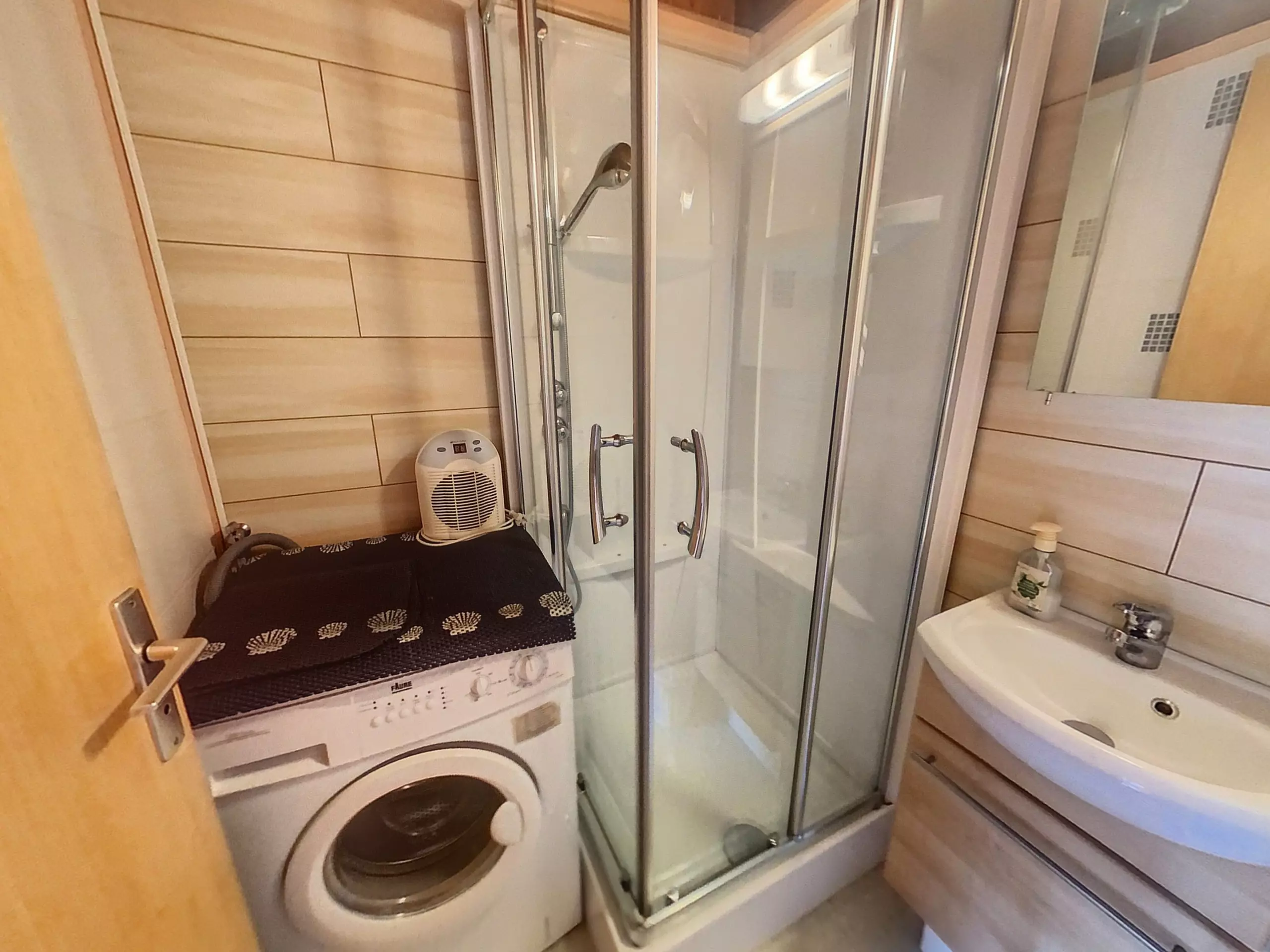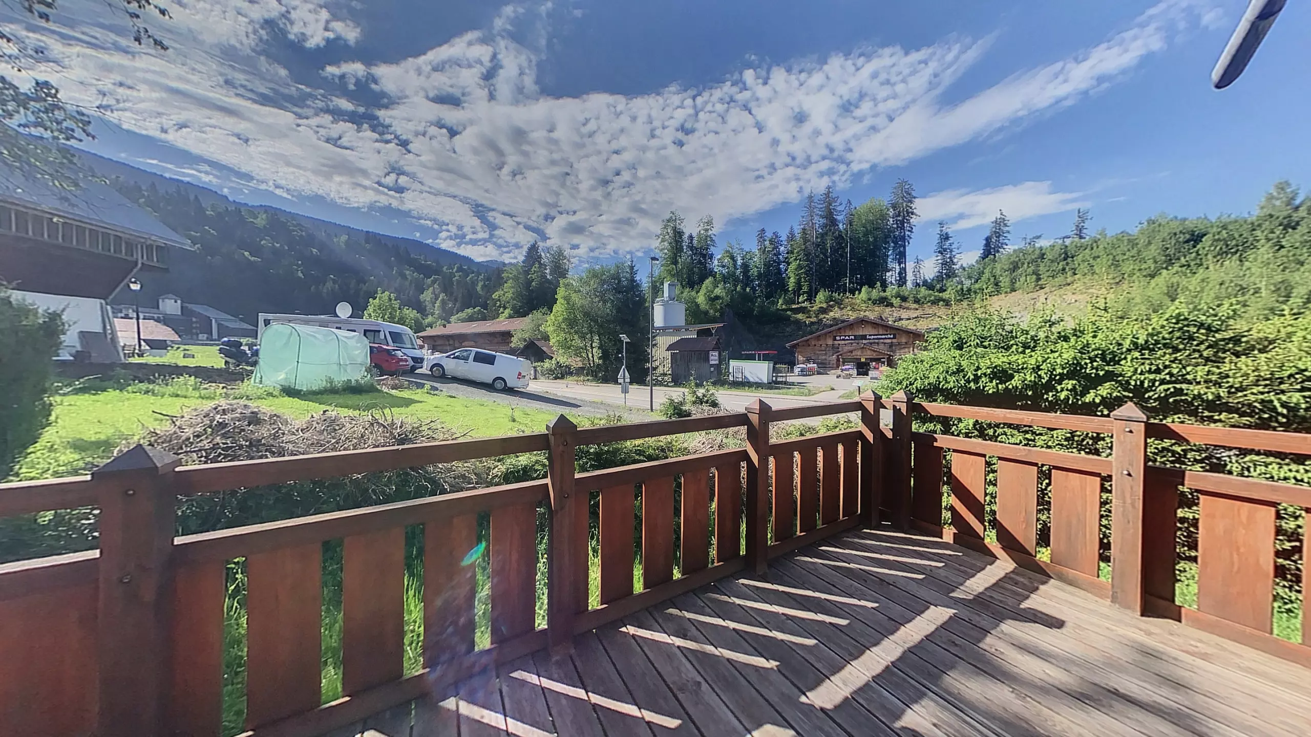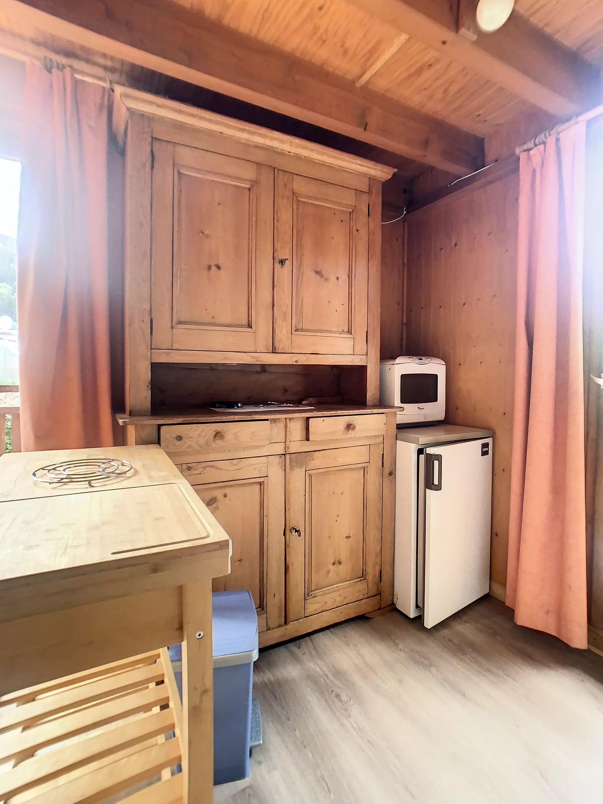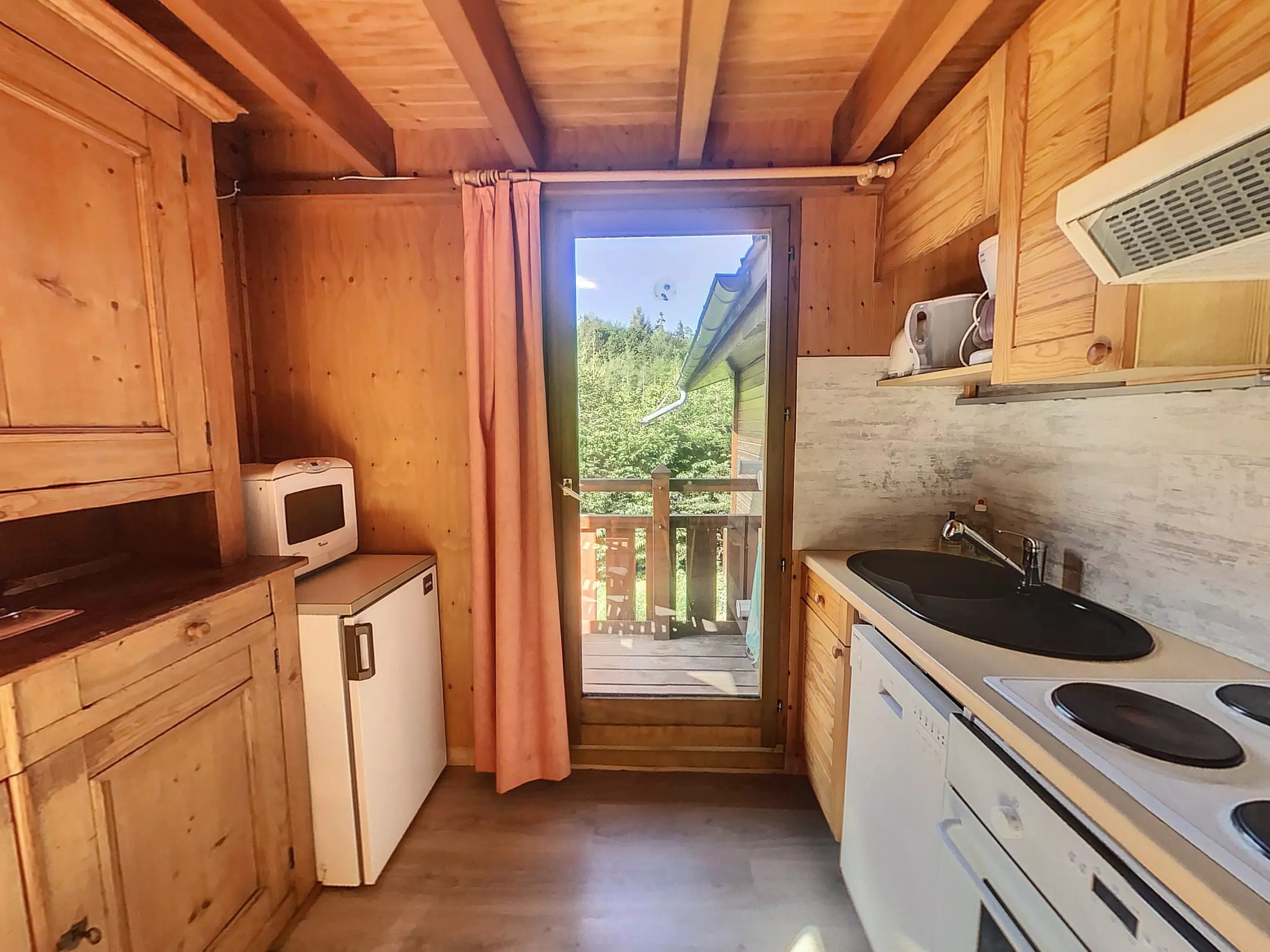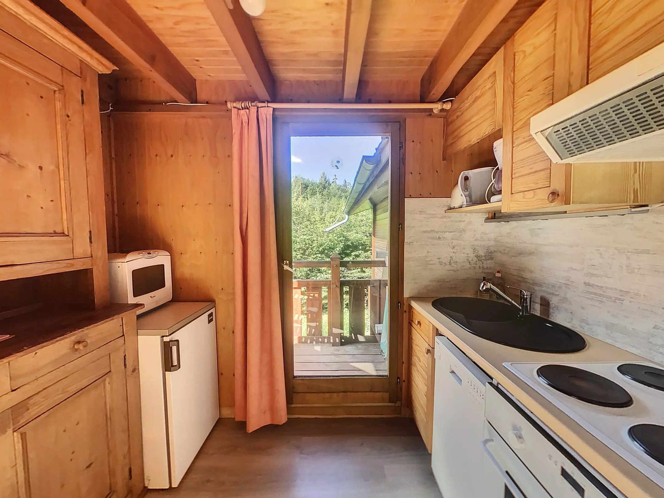 Disposant d'une terrasse idéale pour les jours ensoleillés, le chalet se compose d'un séjour avec cuisine ouverte, d'une salle de douche, d'une mezzanine sous pente, et de WC séparés.