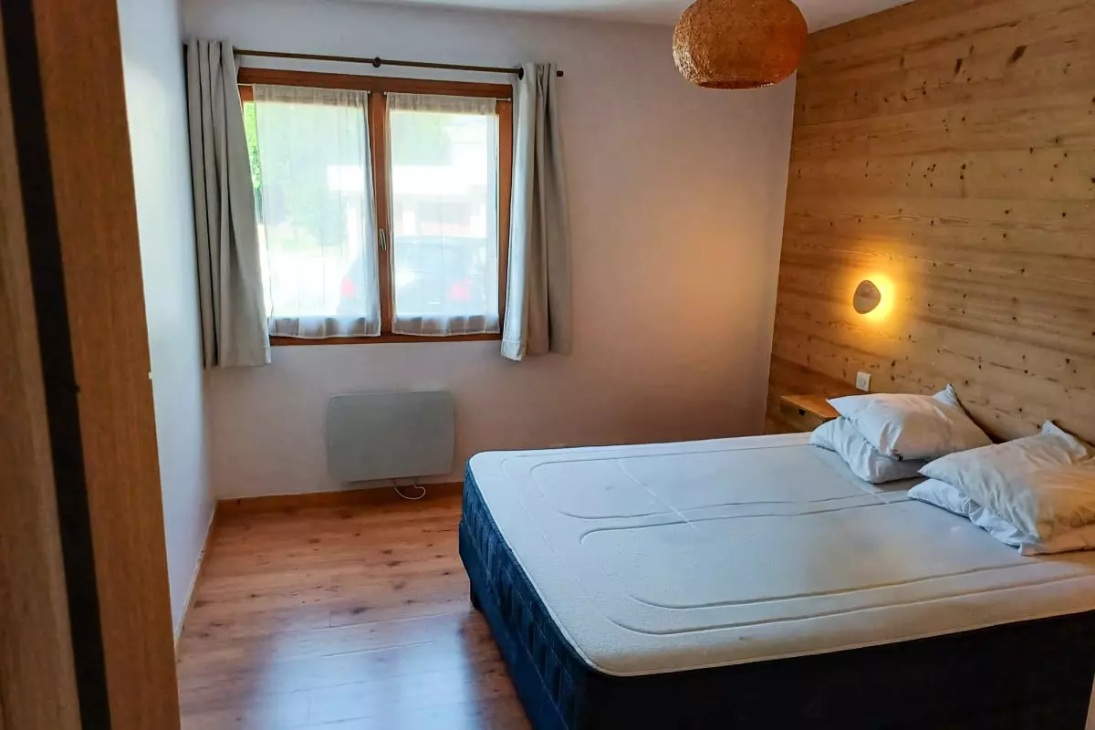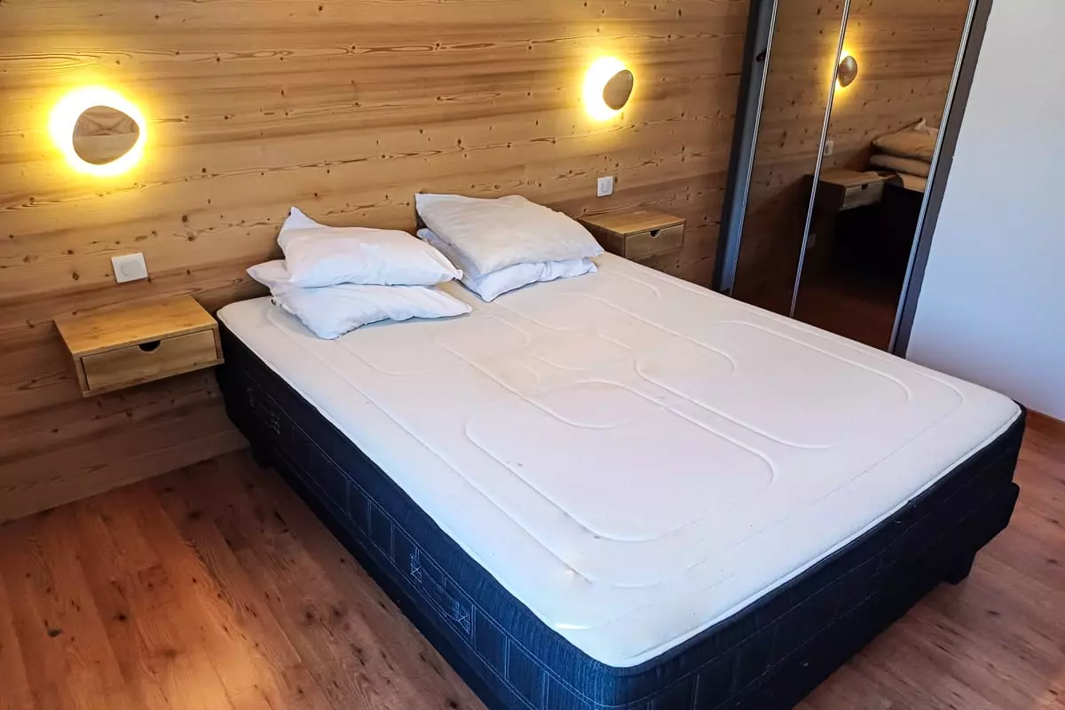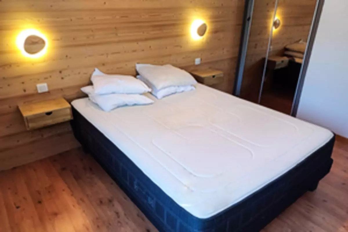 -La première : lit double 160x200cm avec un grand placard avec miroir et penderie.