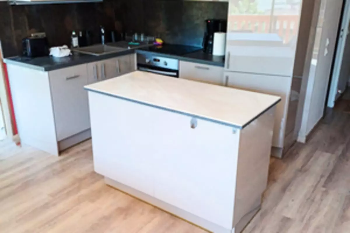 Cuisine entièrement équipée avec ilot central donnant sur la salle à manger et sur le 1er balcon.