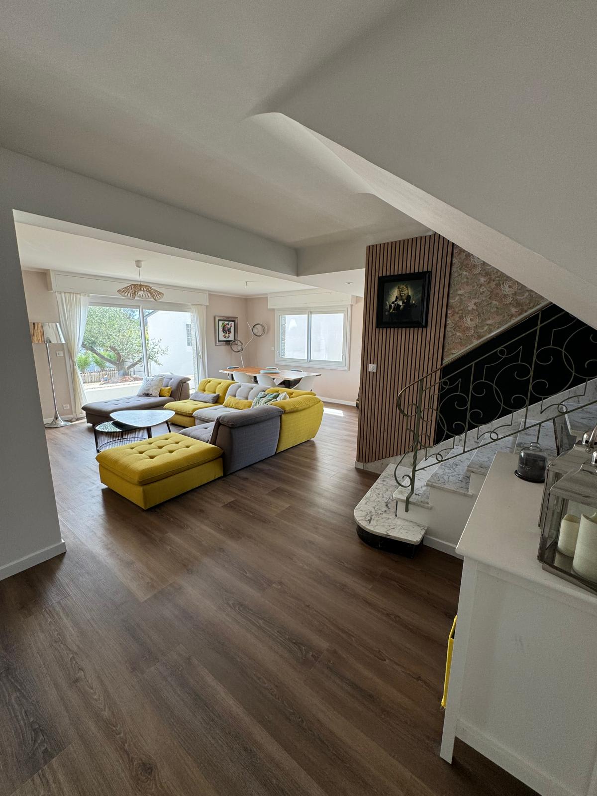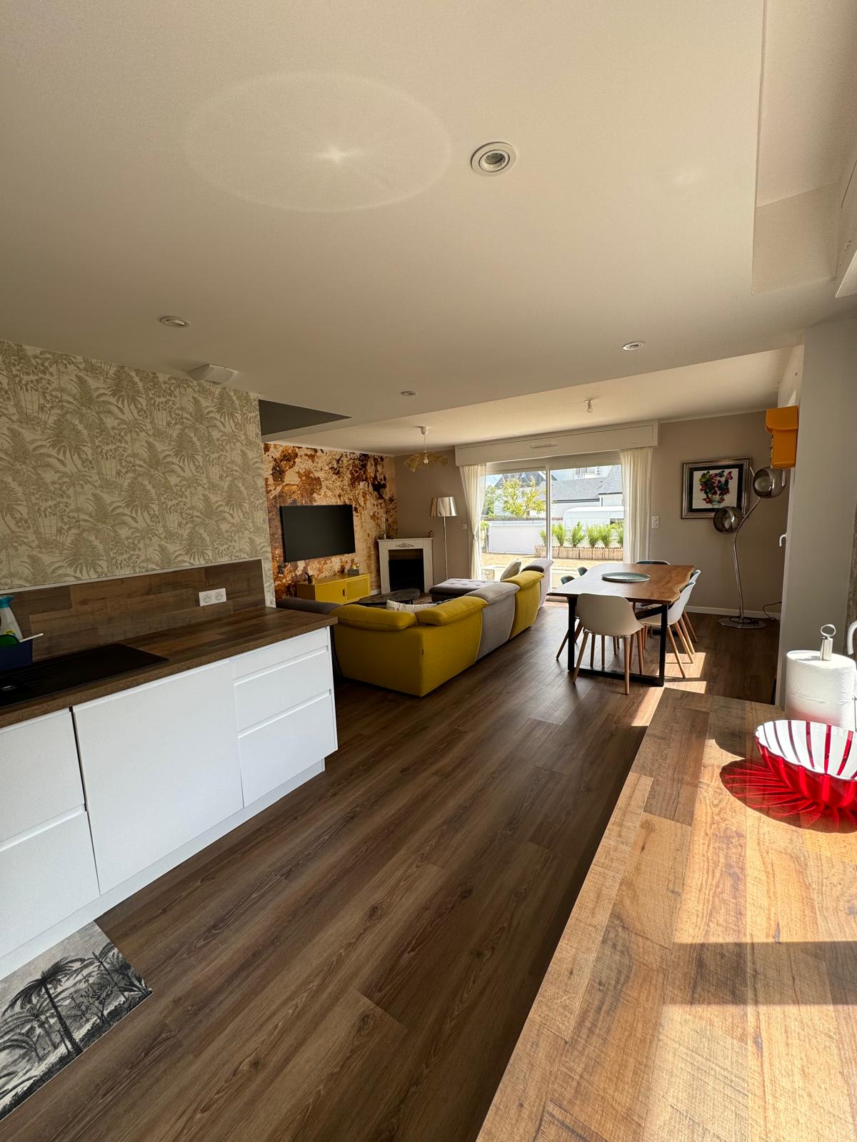 Grande pièce de vie conviviale avec salon, salle à manger et cuisine ouverte