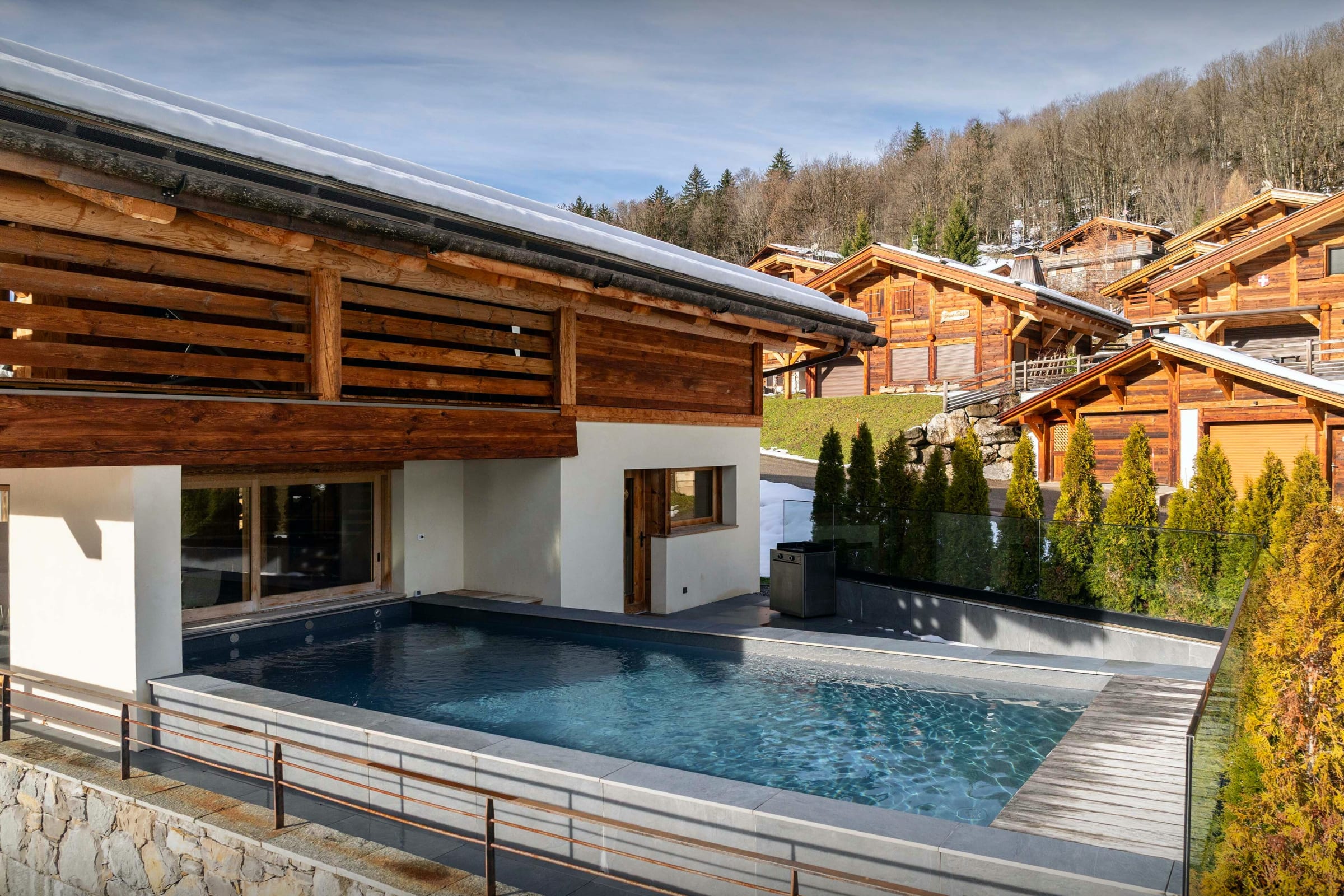 Les baies vitrées de cette vaste pièce de vie laissent entrer le paysage. À l’extérieur, sa piscine chauffée offrira d’agréables moments de détente face aux montagnes, été comme hiver.