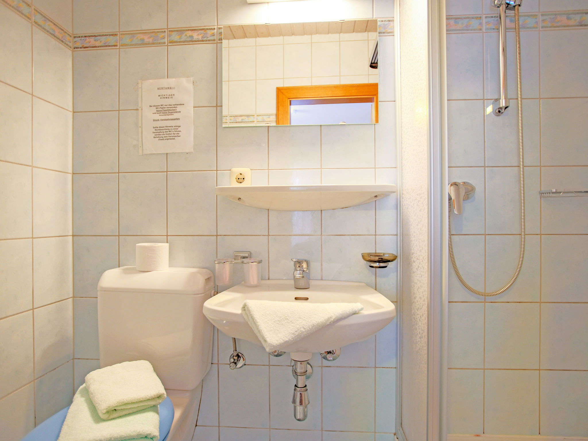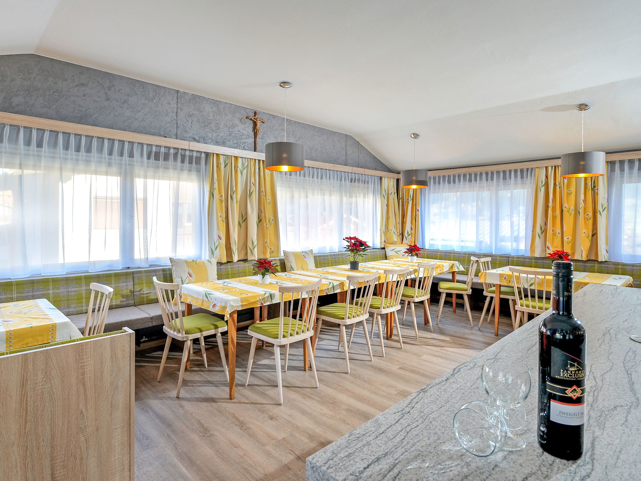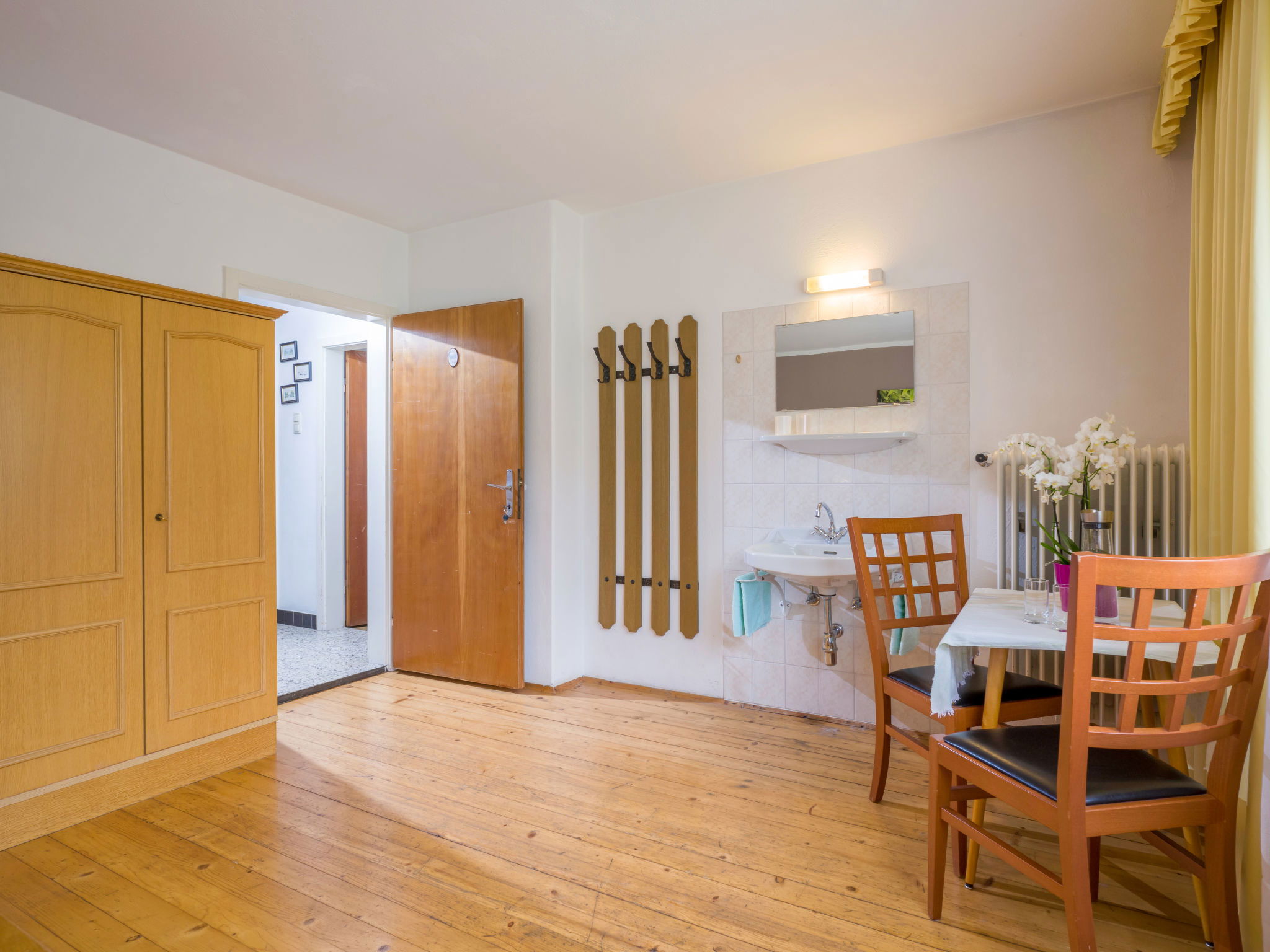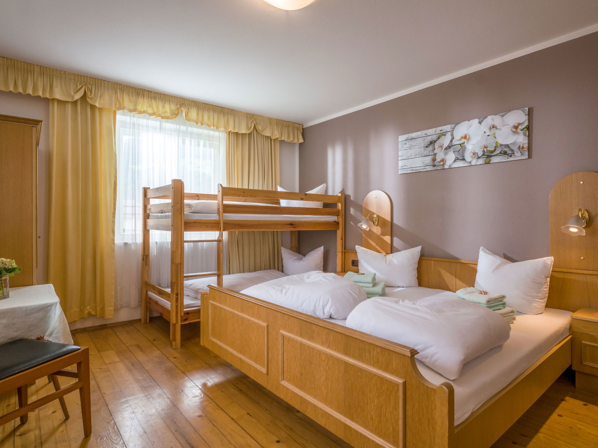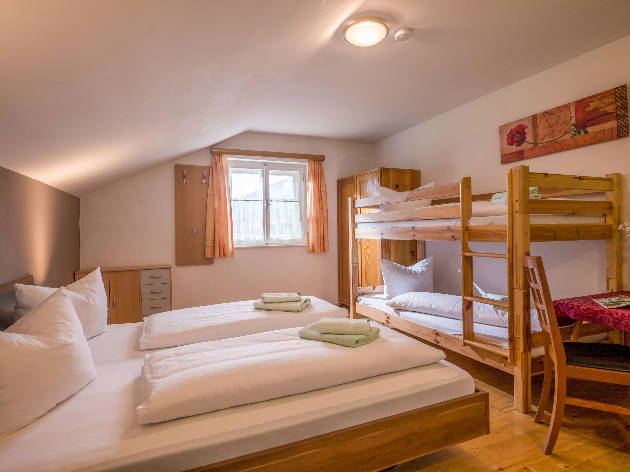 "Apart Anneliese", maison 10 pièces 270 m2 sur 3 niveaux. Aménagement fonctionnel et confortable: 1 chambre double avec lavabo et douche/WC. 1 chambre avec 1 x 2 lits superposés, 1 lit double et lavabo. Douche/WC, WC séparé. À l'étage inférieur: 1 chambre double avec lavabo et douche. Sortie sur le balcon. 1 chambre double avec lavabo et douche. Sortie sur le balcon. 1 chambre double avec lavabo et douche/WC. Sortie sur le balcon. 1 chambre avec 1 x 2 lits superposés, lavabo. Sortie sur le balcon. Grande cuisine ouverte (4 plaques de cuisson, four, bouilloire électrique, micro-ondes, cafetière électrique) avec table pour les repas, TV (satellite) (écran plat), chauffage électrique. WC séparé. À l'étage supérieur: 1 chambre double avec lavabo. 1 chambre avec 1 x 2 lits superposés, 1 lit double et lavabo. 1 chambre double. Douche, WC séparé. Maximum 3 animaux/ chiens autorisés. Service petits pains possible. En hiver petit déjeuner buffet sur demande, 12€ par personne.