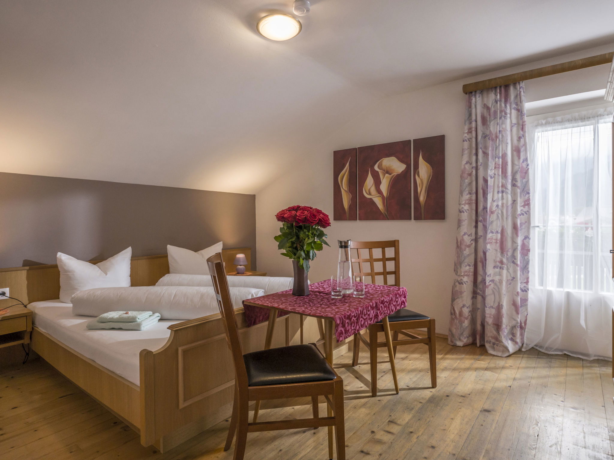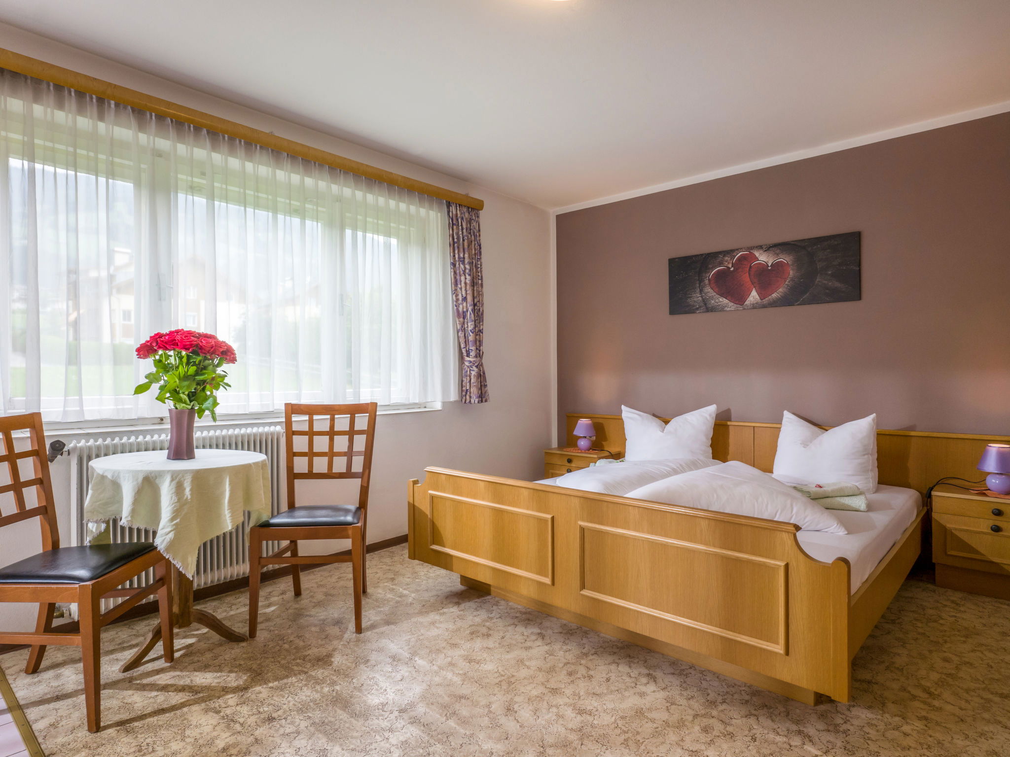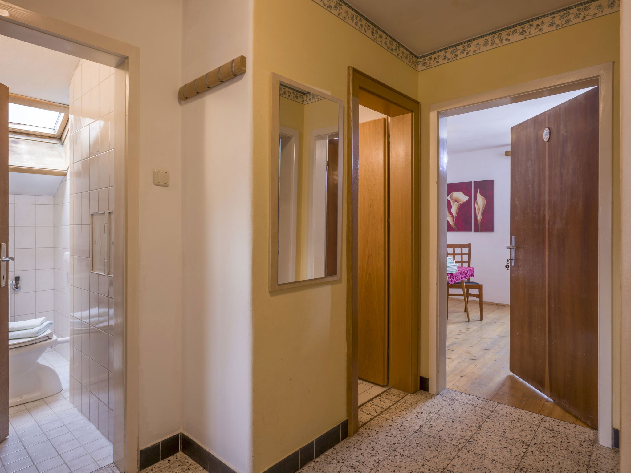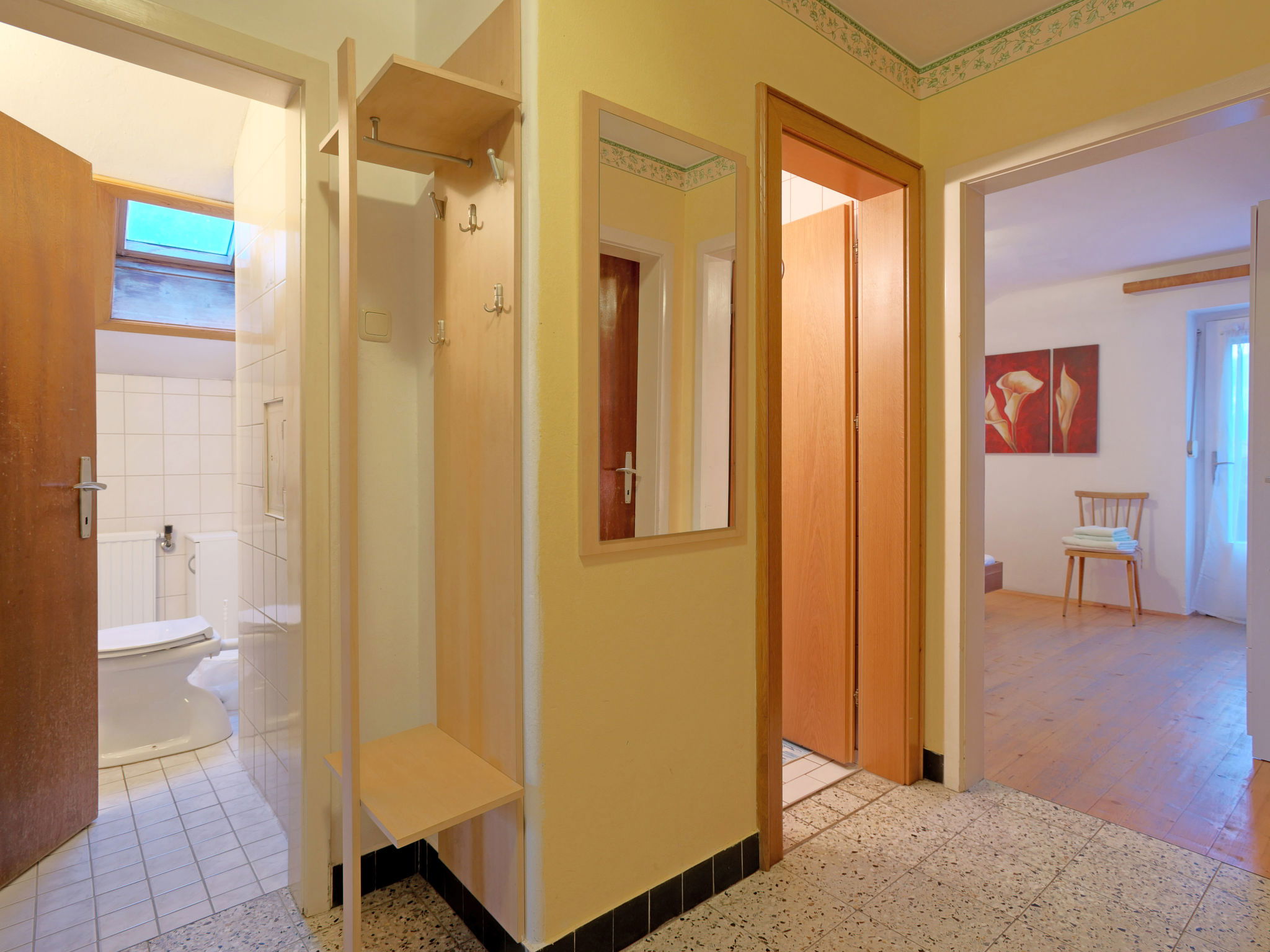 "Apart Anneliese", maison 10 pièces 270 m2 sur 3 niveaux. Aménagement fonctionnel et confortable: 1 chambre double avec lavabo et douche/WC. 1 chambre avec 1 x 2 lits superposés, 1 lit double et lavabo. Douche/WC, WC séparé. À l'étage inférieur: 1 chambre double avec lavabo et douche. Sortie sur le balcon. 1 chambre double avec lavabo et douche. Sortie sur le balcon. 1 chambre double avec lavabo et douche/WC. Sortie sur le balcon. 1 chambre avec 1 x 2 lits superposés, lavabo. Sortie sur le balcon. Grande cuisine ouverte (4 plaques de cuisson, four, bouilloire électrique, micro-ondes, cafetière électrique) avec table pour les repas, TV (satellite) (écran plat), chauffage électrique. WC séparé. À l'étage supérieur: 1 chambre double avec lavabo. 1 chambre avec 1 x 2 lits superposés, 1 lit double et lavabo. 1 chambre double. Douche, WC séparé. Maximum 3 animaux/ chiens autorisés. Service petits pains possible. En hiver petit déjeuner buffet sur demande, 12€ par personne.