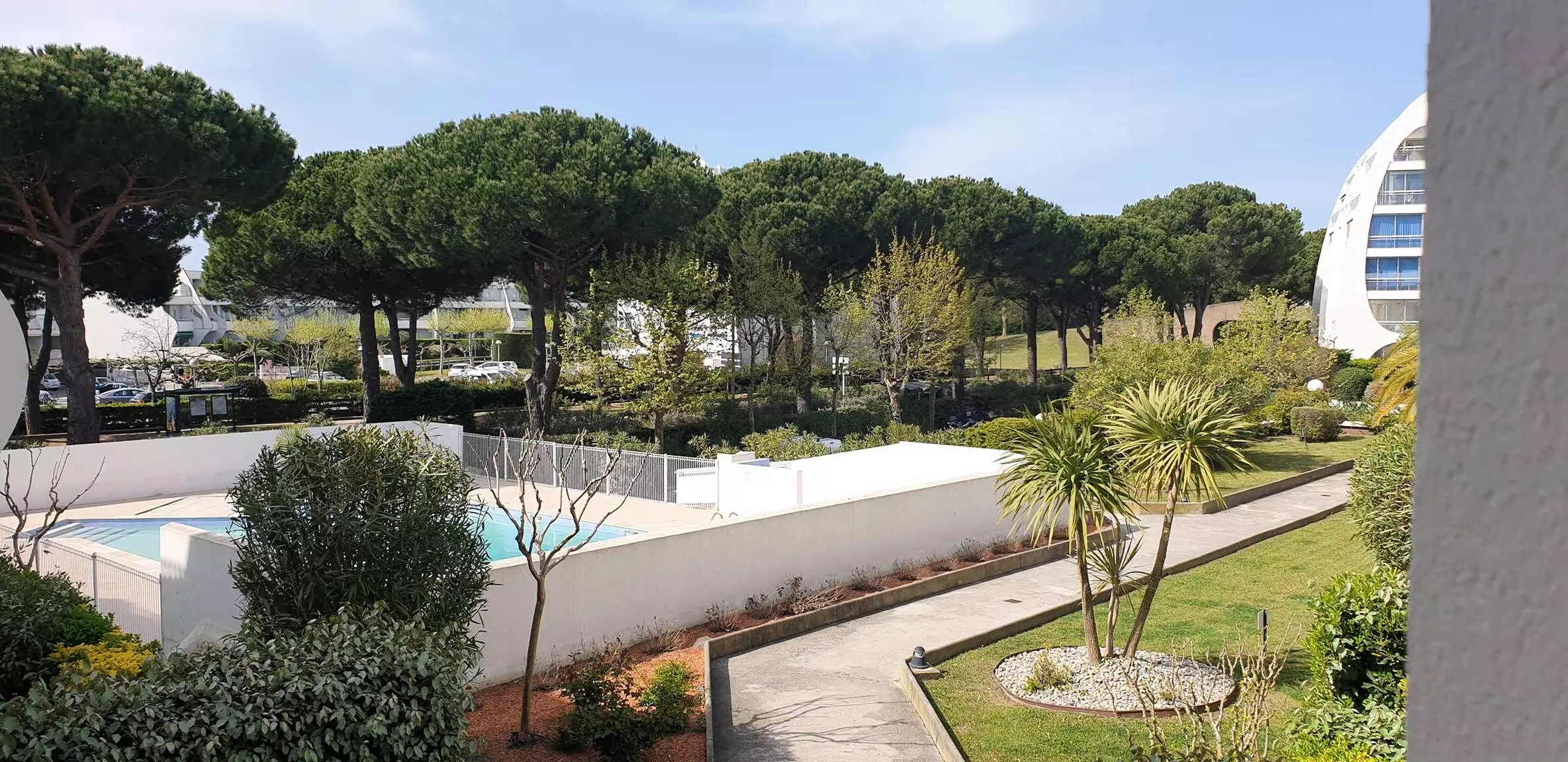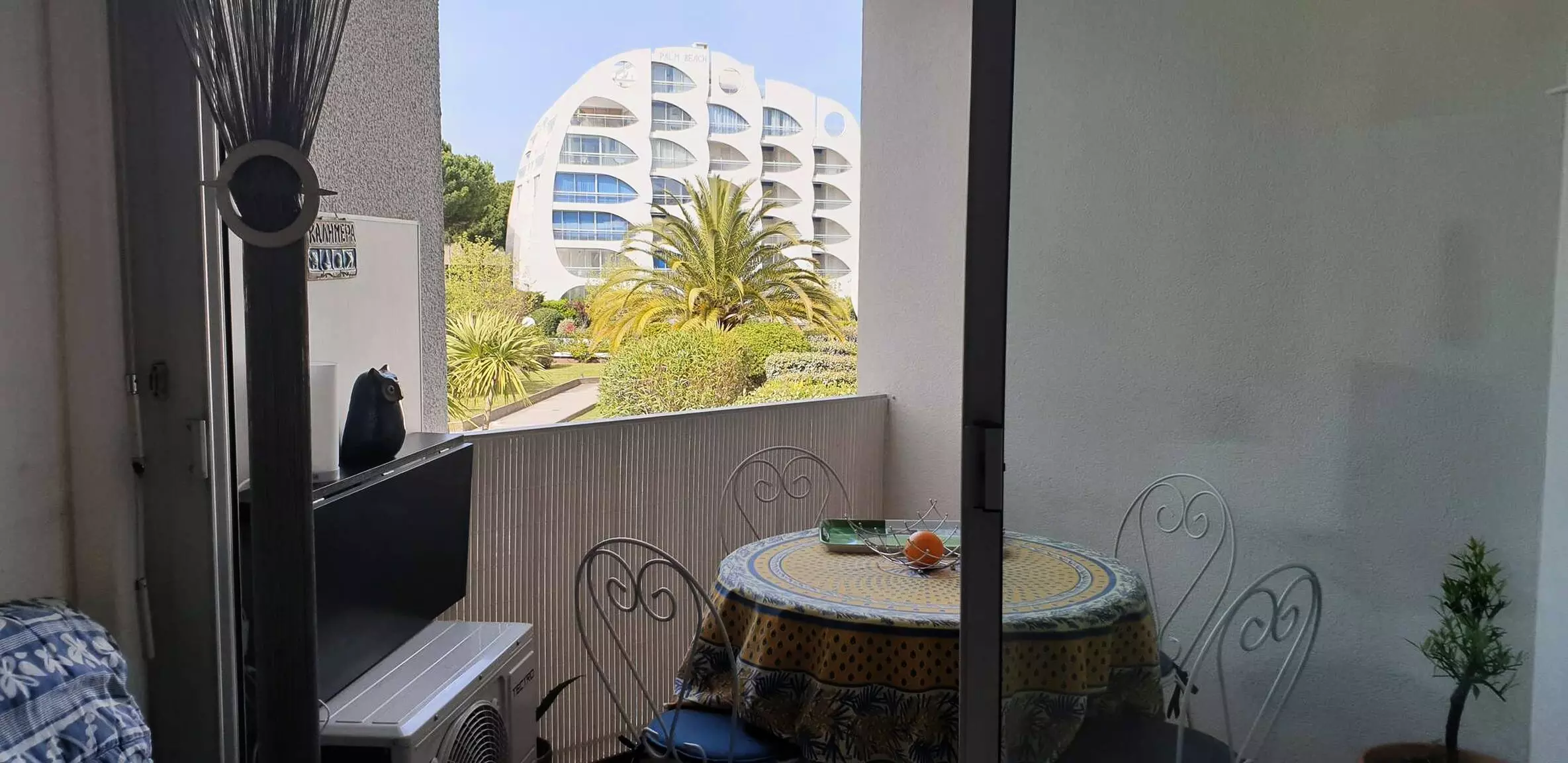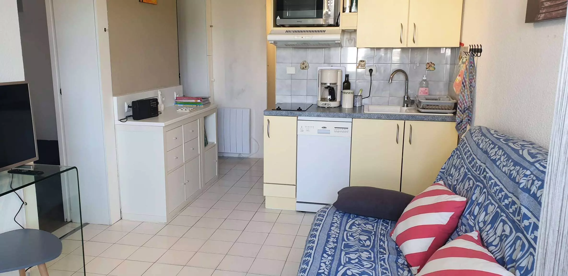 Le Groupe Neptune Immobilier vous propose en location vacances cet appartement 2 pièces cabine au premier étage d'une résidence sécurisé, climatisé, situé quartier du couchant et à une dizaine minutes à pied de la plage. Il est composé d'une entrée, d'un wc indépendant, d'une salle d'eau avec douche, lavabo une vasque et machine à laver. D'une kitchenette comprenant un micro-ondes, un lave vaisselle, une cafetière, un grille pain, une bouilloire, frigo et congélateur. D'un séjour avec télévision. Une première chambre avec 2 lits superposés (90), une deuxième chambre cabine avec lit double (140). Pour finir une terrasse avec chaises et table pour profiter de l’extérieur. Piscine collective