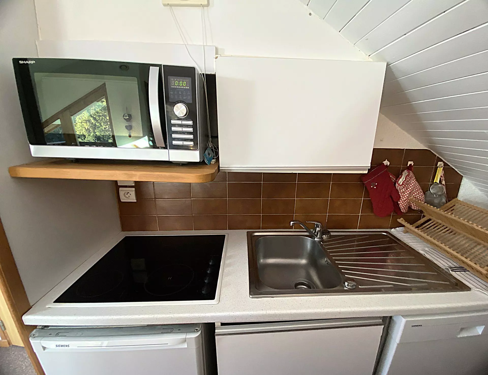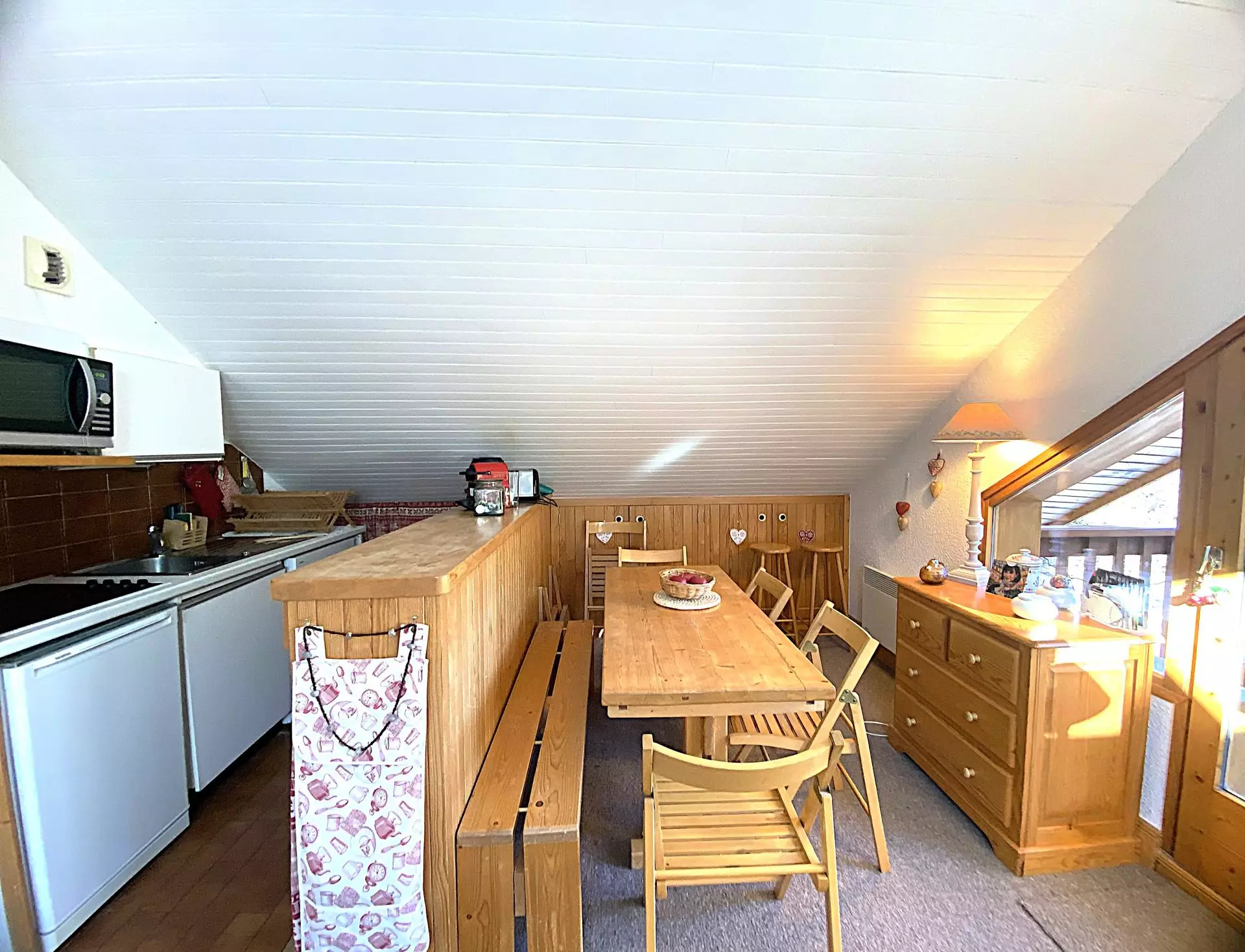 Il est équipé de plaques électriques, d'un micro-ondes, d'un lave vaisselle et d'un réfrigérateur.