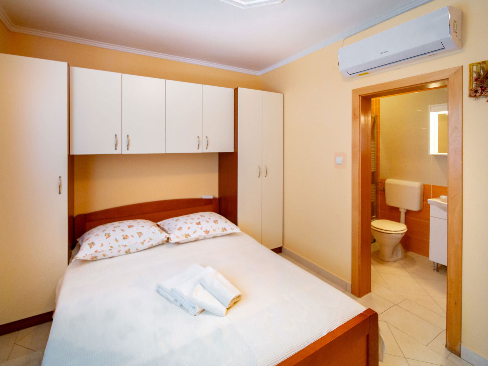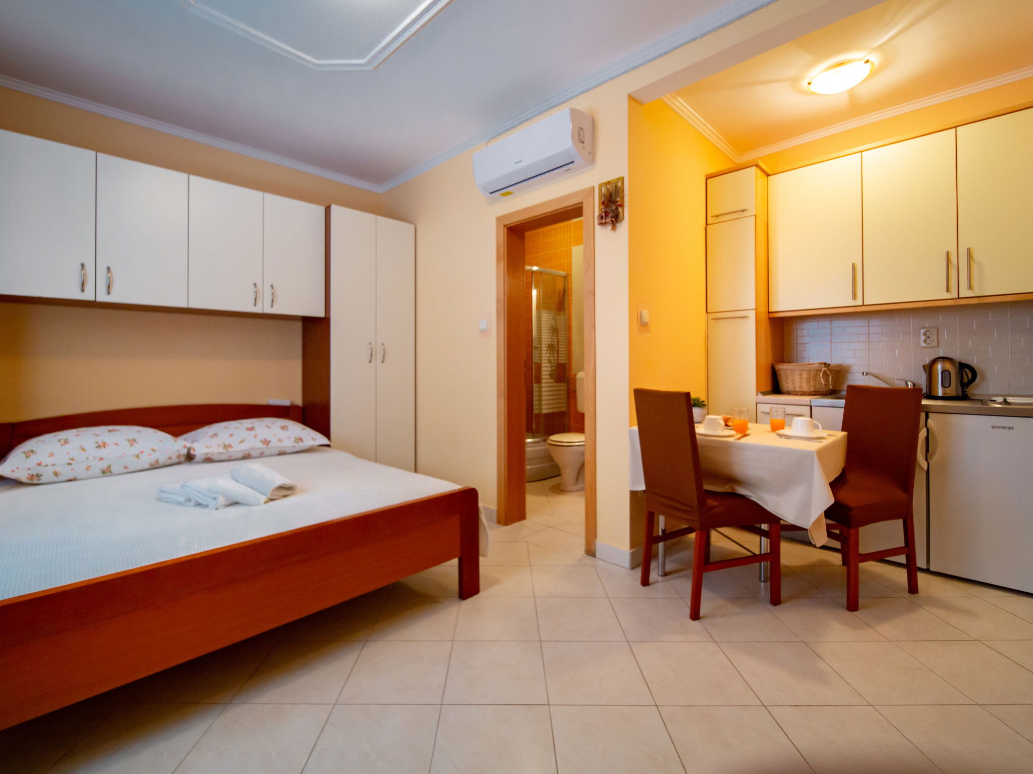 Studio 25 m2, au rez-de-chaussée. Séjour/salle à manger avec 1 lit double (2 x 80 cm, longueur 200 cm), TV (satellite) et air-conditionné. Cuisine ouverte (2 plaques de cuisson, grille-pain, bouilloire électrique, micro-ondes, cafetière électrique). Douche/WC. Pas de chauffage. Terrasse 10 m2. Meubles de terrasse. A disposition: sèche-cheveux. Internet (Connexion WIFI, gratuit). Veuillez noter: maison non-fumeur. Maximum 1 animal/ chien autorisé.