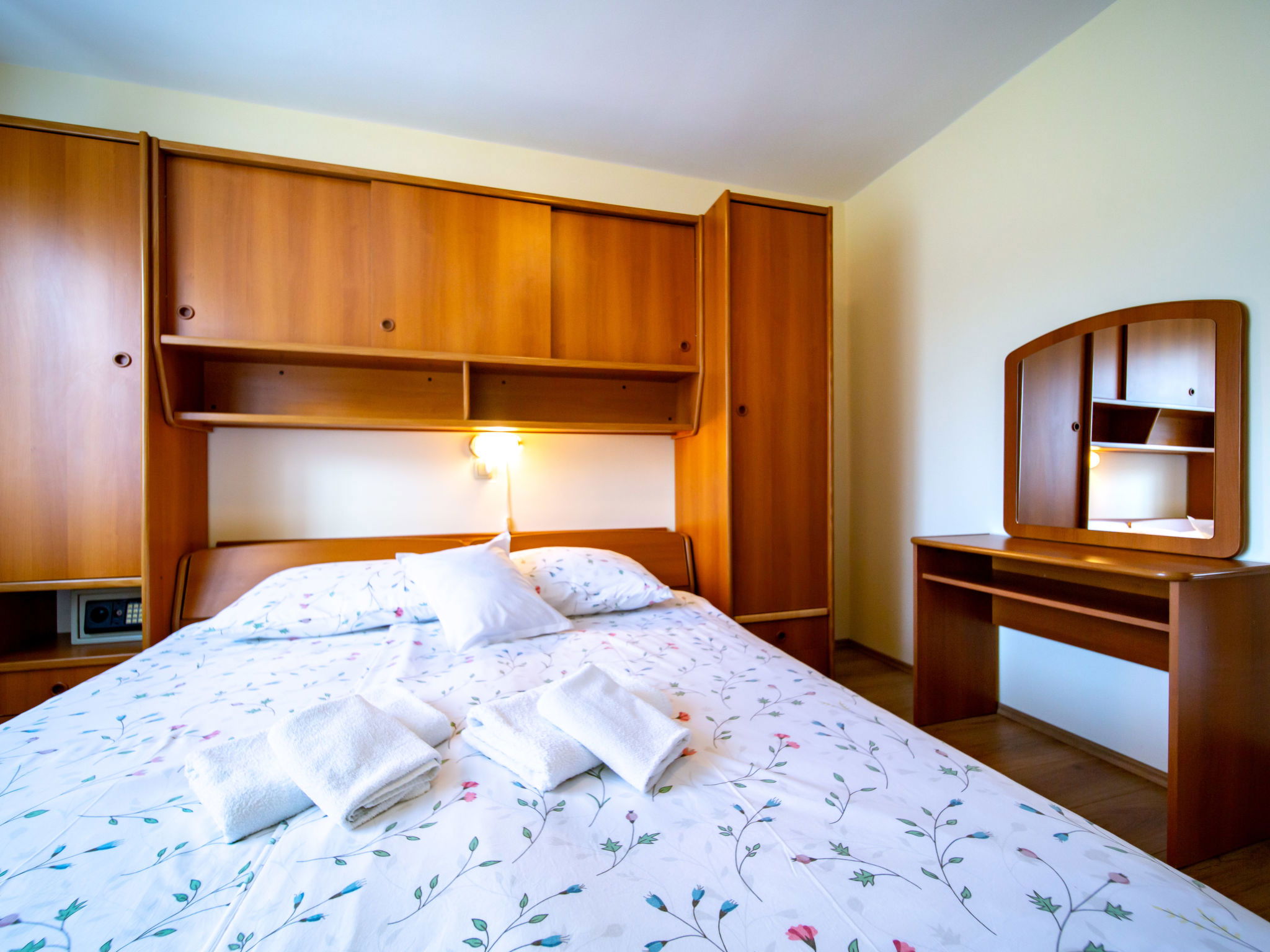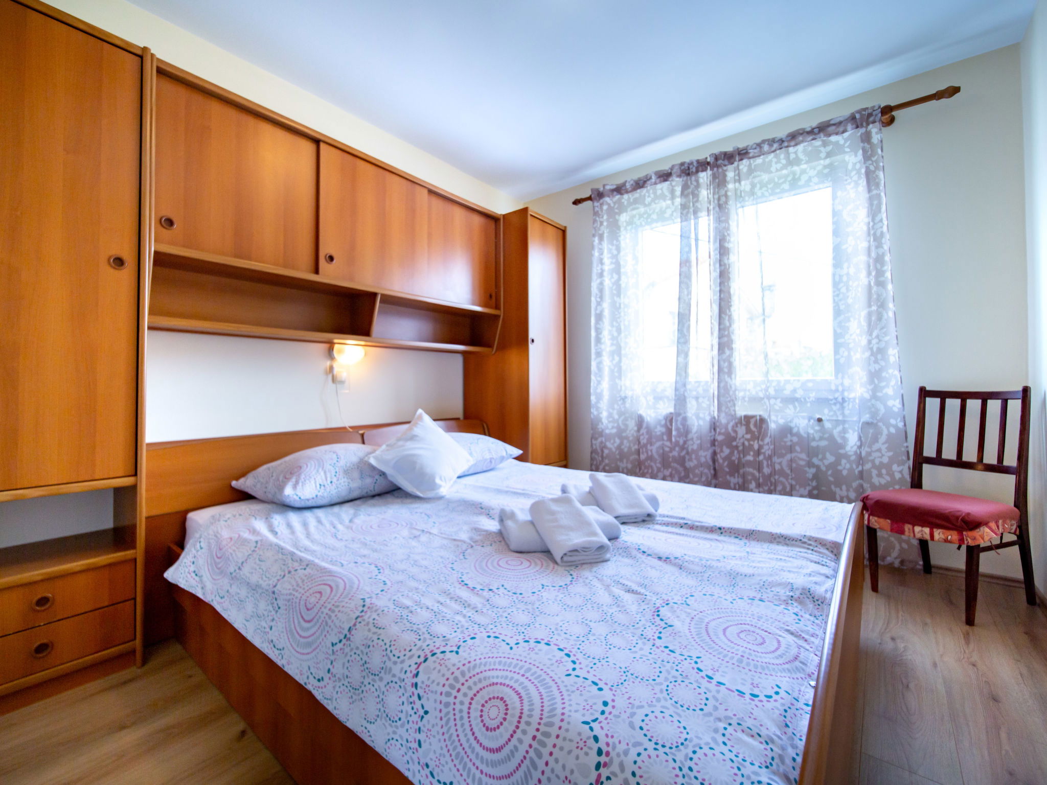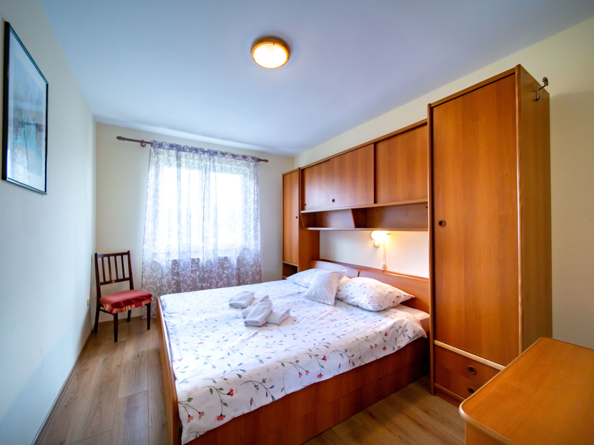 Appartement de 3 pièces 60 m2 au 1er étage. Séjour/salle à manger avec TV (satellite). 2 chambres, chaque chambre avec: 1 lit double (2 x 90 cm, longueur 200 cm). Cuisine ouverte (2 plaques de cuisson, four, lave-vaisselle, 2 feux, grille-pain, bouilloire électrique, micro-ondes, congélateur, cafetière électrique) avec air-conditionné. Sortie sur la terrasse. Bain/WC. Pas de chauffage. Terrasse 12 m2, couverte. Meubles de terrasse. A disposition: coffre-fort, sèche-cheveux. Internet (Connexion WIFI, gratuit). Veuillez noter: maison non-fumeur. Maximum 1 animal/ chien autorisé.