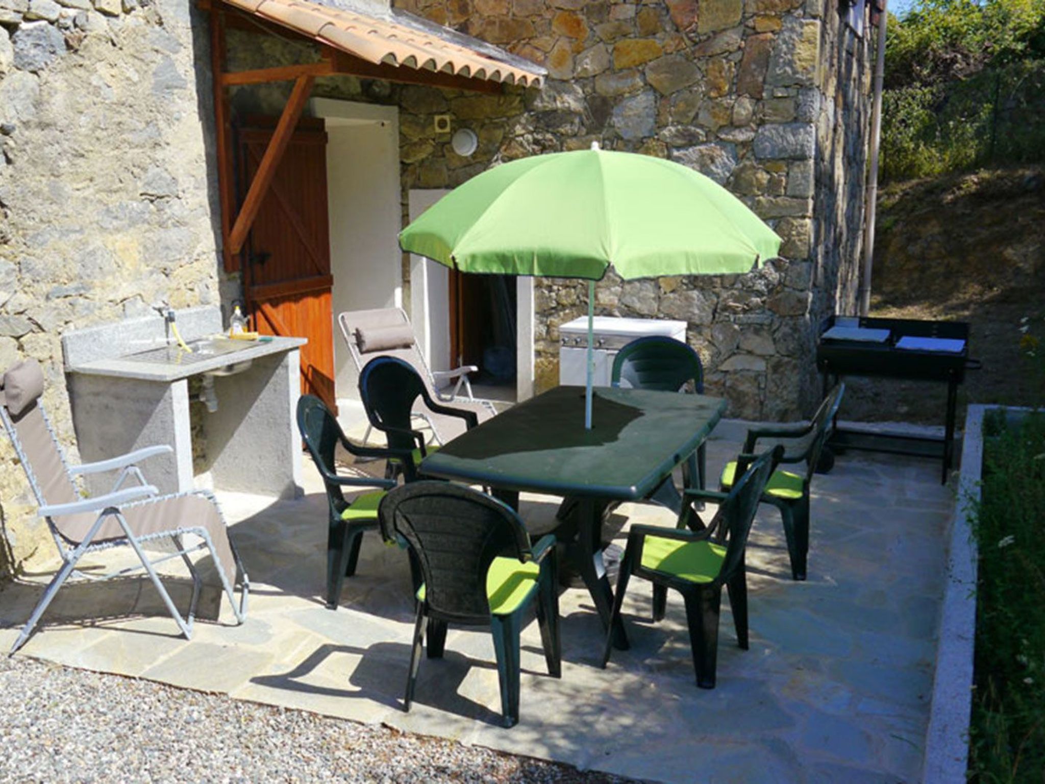 Et à l'arrière, la maison possède une terrasse discrète où l'on peut faire un barbecue, manger et faire de la chaise-longue.