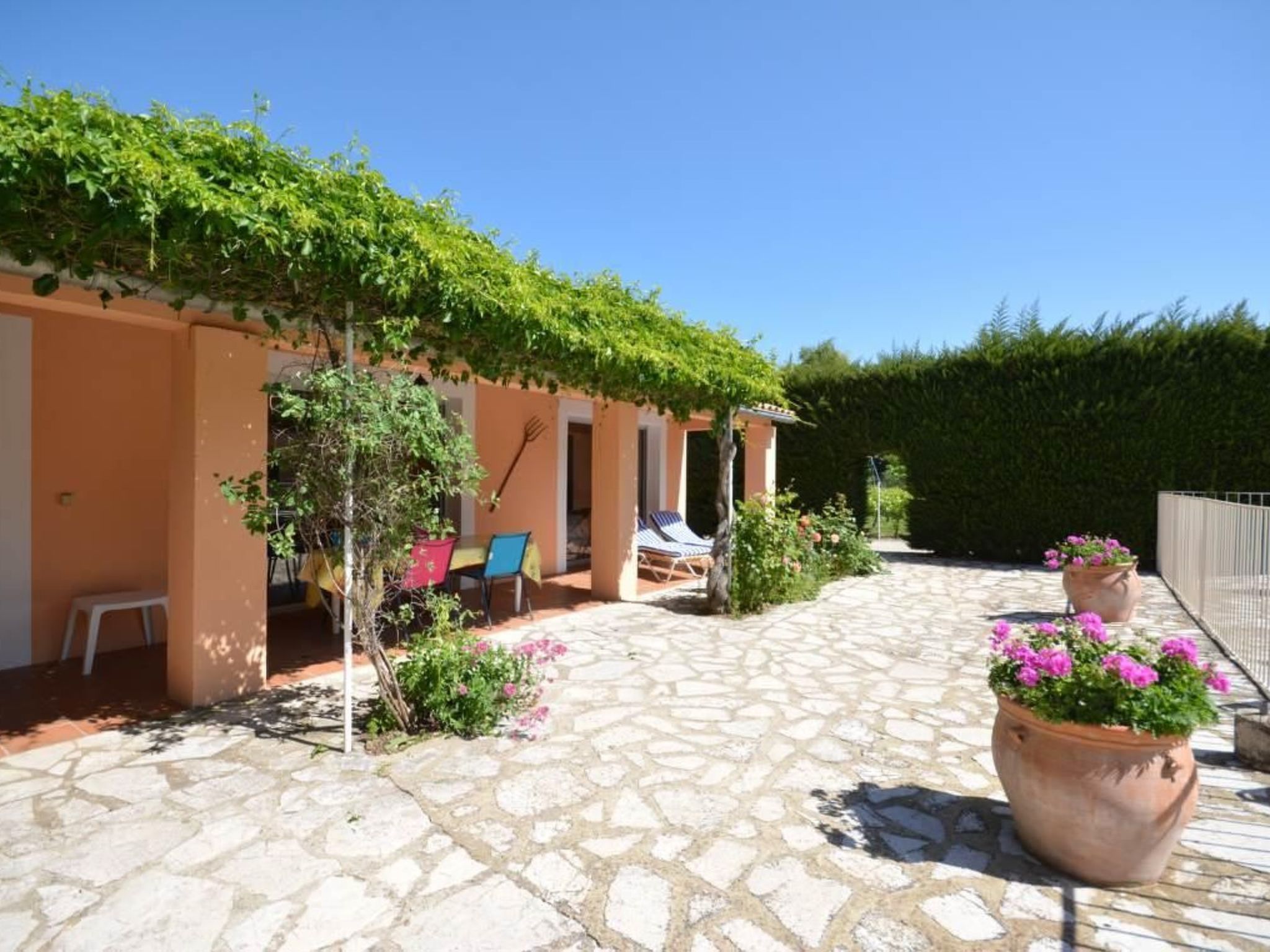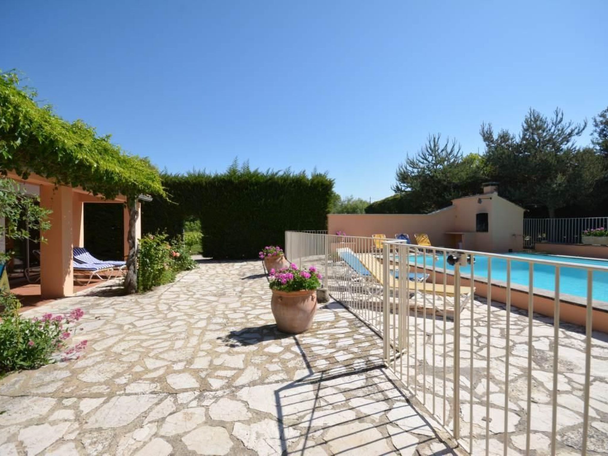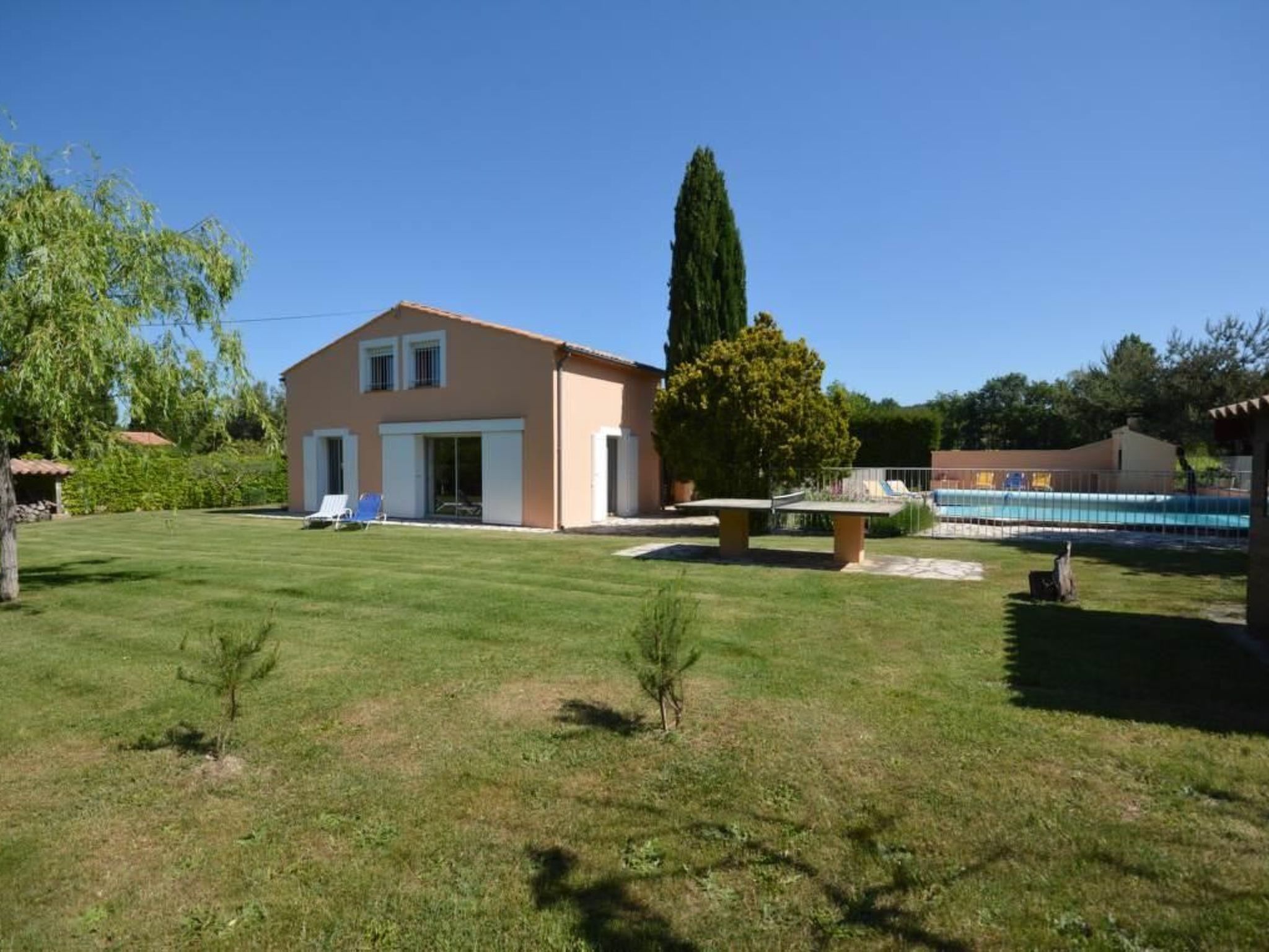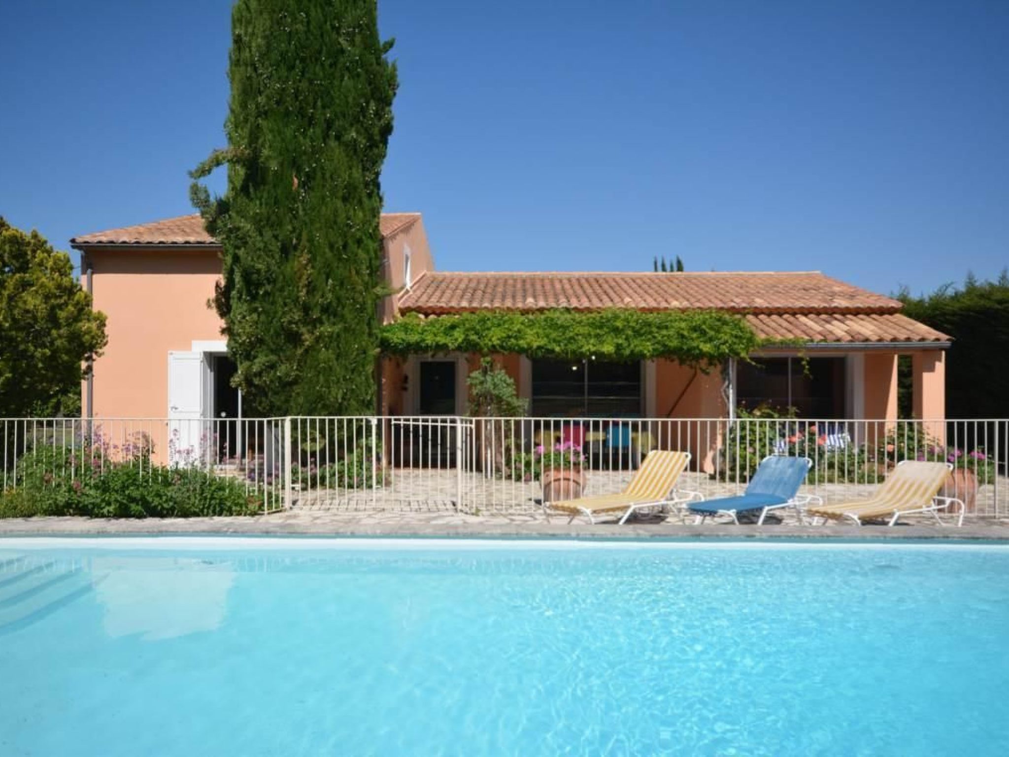 La maison se trouve sur un grand terrain clôturé, avec vue sur le Mont Ventoux. La propriété, y compris son terrain de 1200 m², est exclusivement réservée aux locataires, ce qui signifie que la grande terrasse couverte et la piscine sécurisée (12 x 6 mètres) sont réservées à votre usage exclusif. Une table de ping-pong et un jeu de boules sont également à votre disposition. Mobilier de jardin, chaises longues, barbecue et petite cabane pour les enfants : les hôtes de tous âges trouveront ici de quoi s'amuser et se détendre. Les hôtes peuvent garer leurs véhicules sous un abri voiture avec deux places de parking. De nombreux sentiers de randonnée démarrent juste à côté de la propriété.