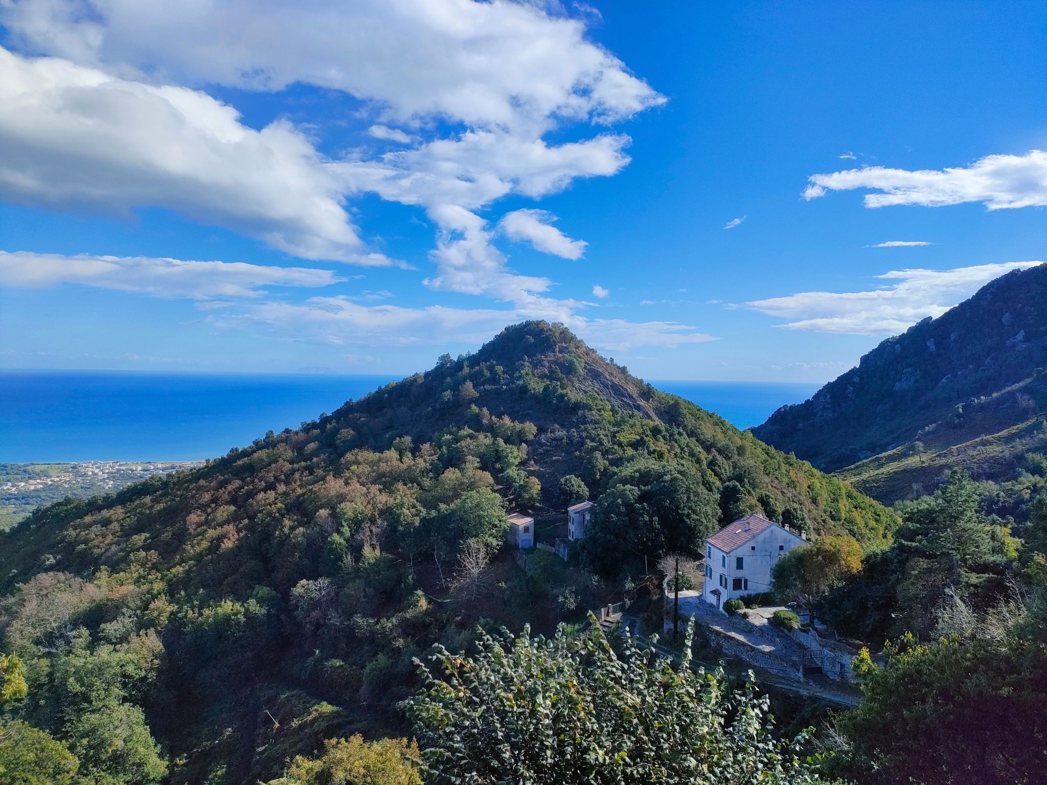 Dans un hameau , véritable balcon sur la mer à 450 m d'altitude face aux îles italiennes d 'Elbe et Montéchristo ; grande maison de village en copropriété avec une autre famille , à 20 mn de la plage .