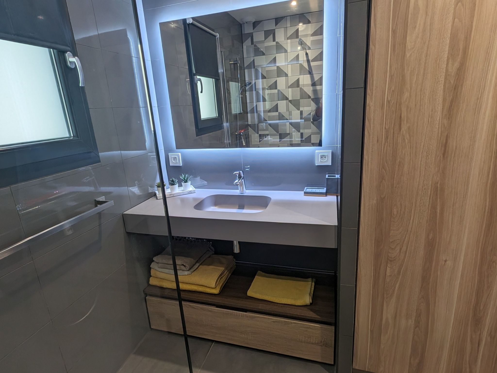 Salle d'Eau Élégante 🚿🧼 : La salle d'eau est équipée d'une magnifique douche et d'un lavabo, avec des serviettes de bain fournies pour votre confort. Les toilettes sont séparées pour plus d'intimité.