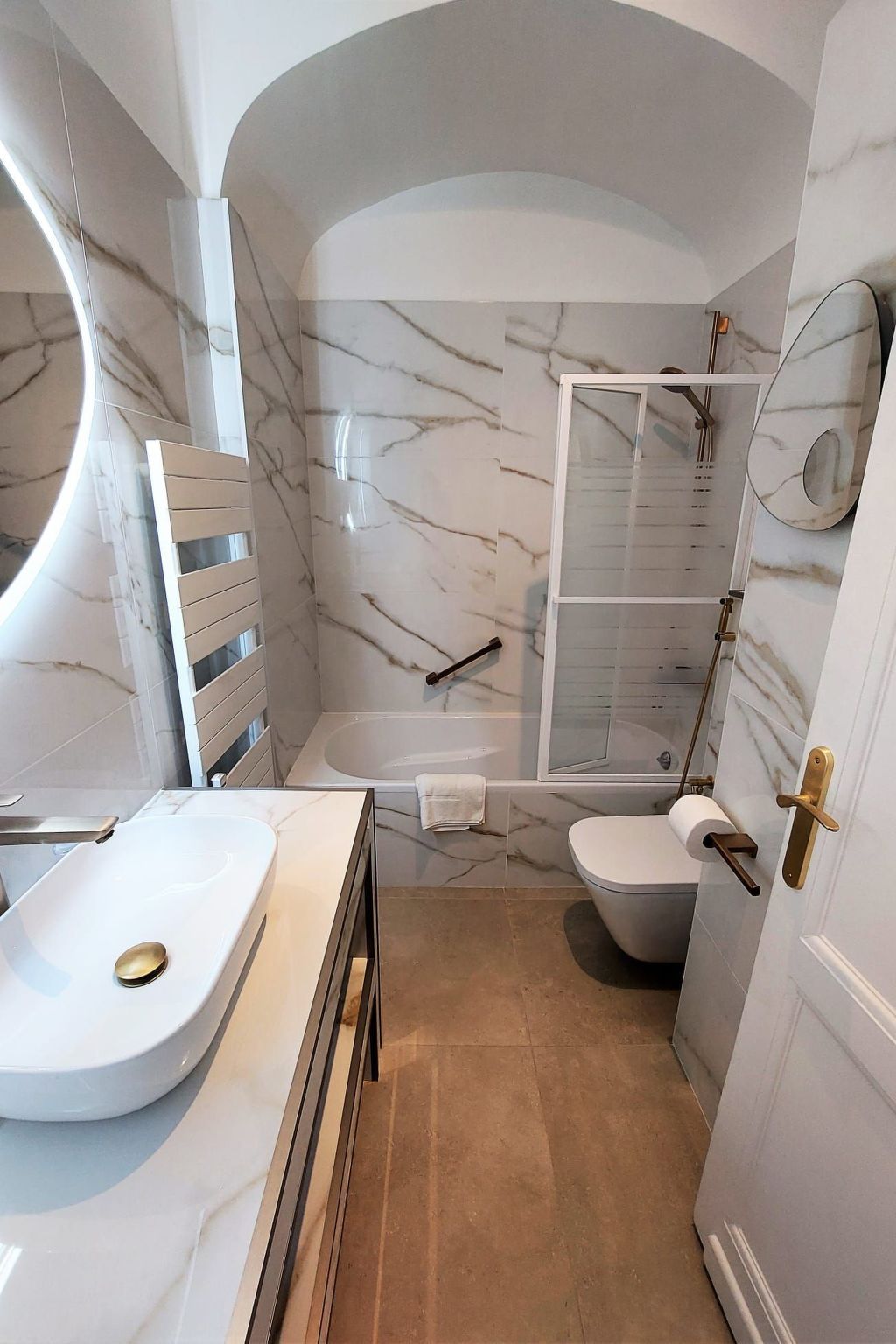 Inside, a carefully decorated 32m² space awaits you, equipped with all modern conveniences. The sleeping accommodation comes with a Super King size Epeda Aerolithe bed for an unrivalled night's sleep and a sofa bed for an extra guest. High-speed Wi-Fi, an LED TV, air conditioning and a compact yet fully equipped kitchenette make your stay both pleasant and effortless. The bathroom, beautifully renovated, offers a relaxing bathtub, a hairdryer and a make-up mirror, while the presence of a washer and dryer offers the convenience of home.