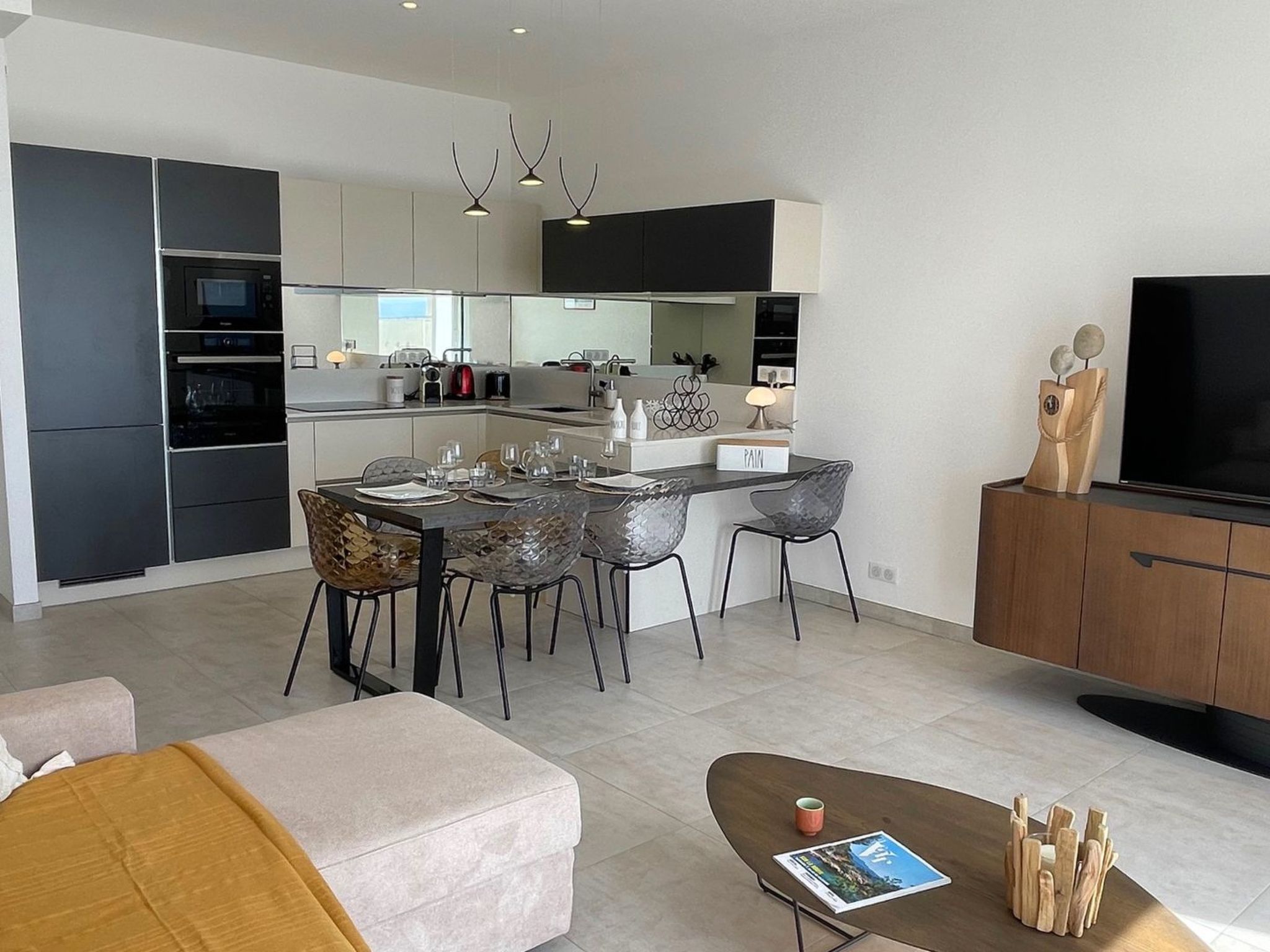 - Pièce à vivre climatisée avec coin salon : canapé convertible (1 personne), télévision, accès terrasse et cuisine ouverte : réfrigérateur, congélateur, four, micro-ondes, cafetière Nespresso, lave-vaisselle, bouilloire, grille pain, vaisselles et ustensiles divers, table et chaises pour 5 convives