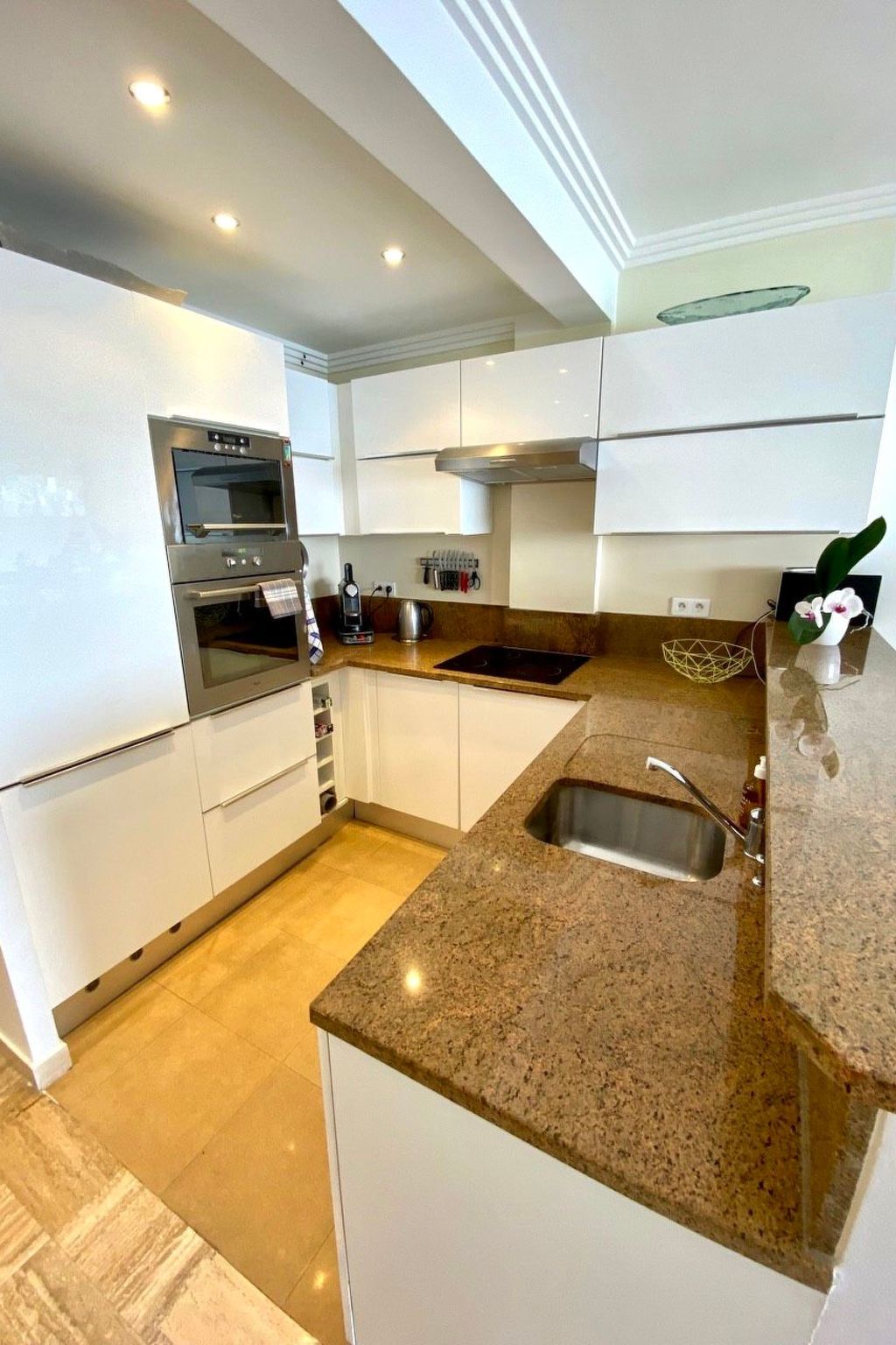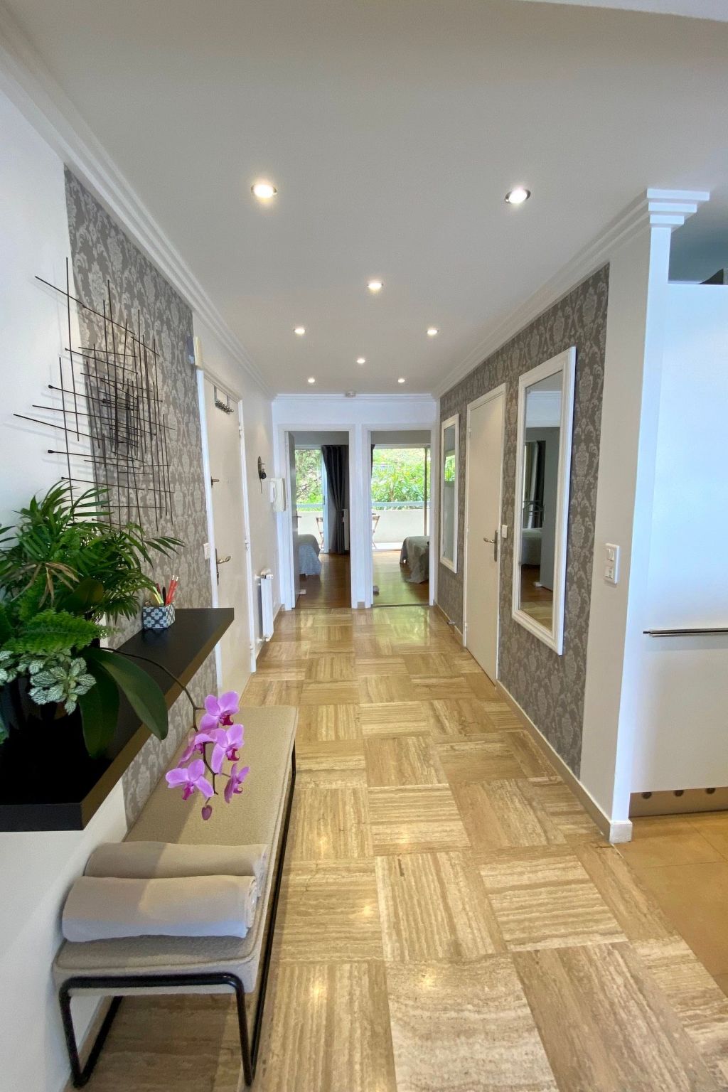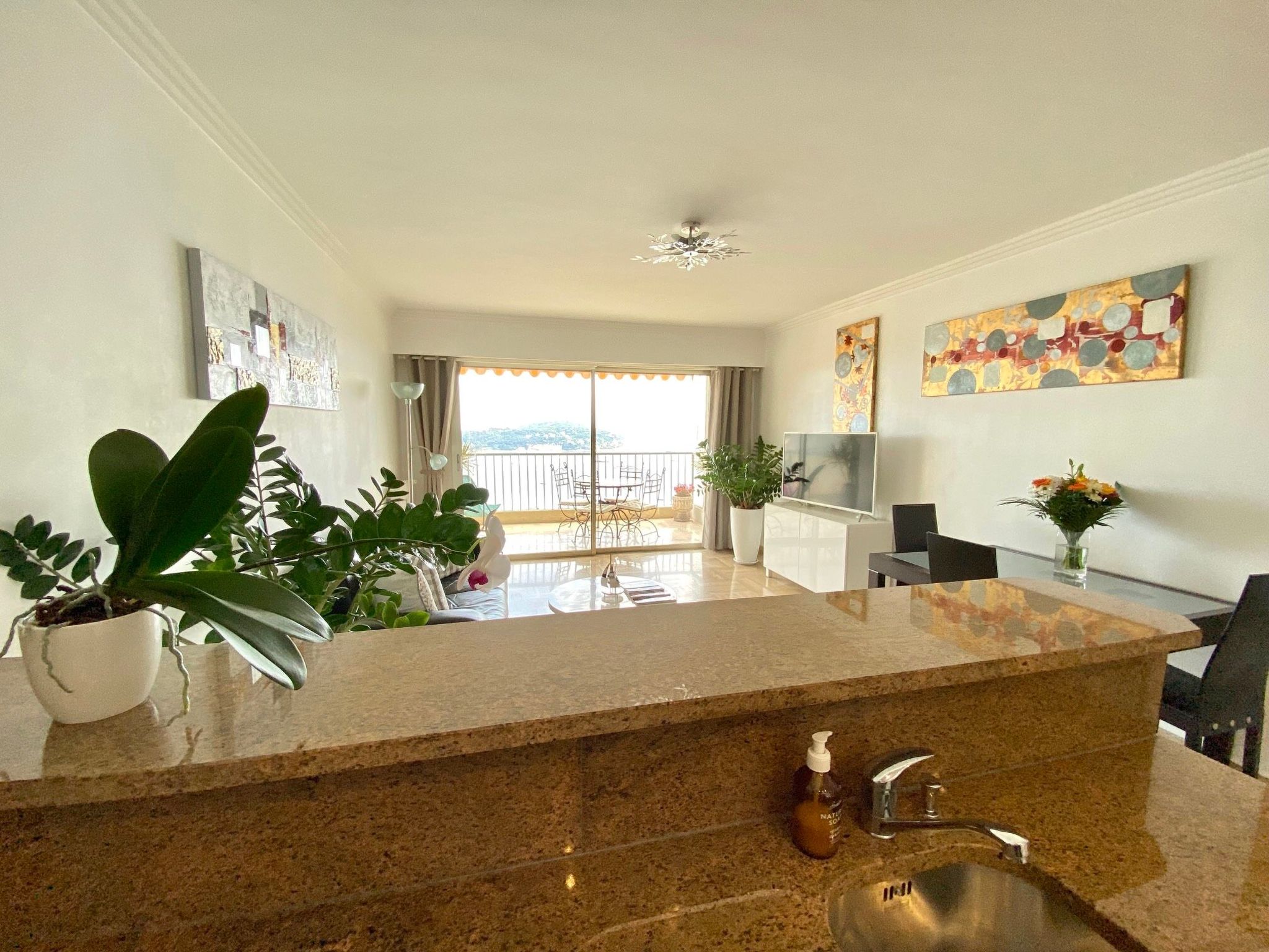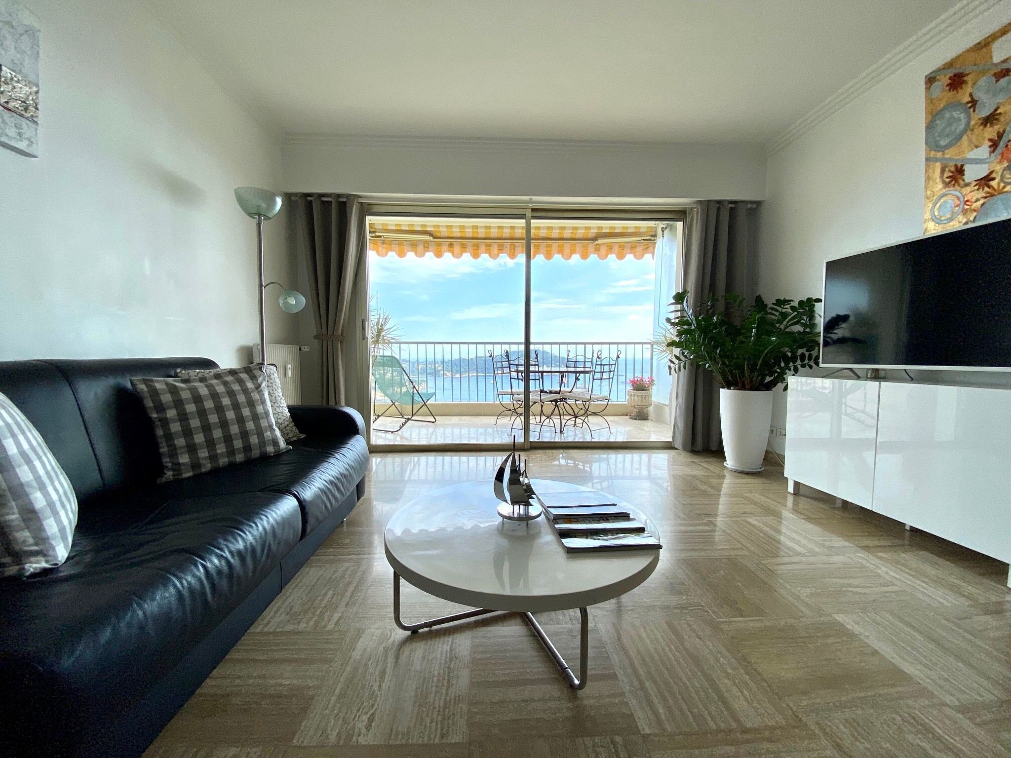 The flat has two terraces (each approx. 10m2) with garden furniture. From the south-facing terrace, you have a unique panorama over the Cap Ferrat peninsula and the bay of Villefranche sur Mer as well as the old town. The complex has a security guard, a communal pool (which is never overcrowded even in summer), a private car park and a Mediterranean park. The entire complex, including the pool and park, is floodlit at night (in case anyone wants to swim a few laps late in the evening). Although the pool is not heated, it can be used from the end of May to the end of September. However, it is open all year round for those who simply want to relax and unwind in the sun by the pool.