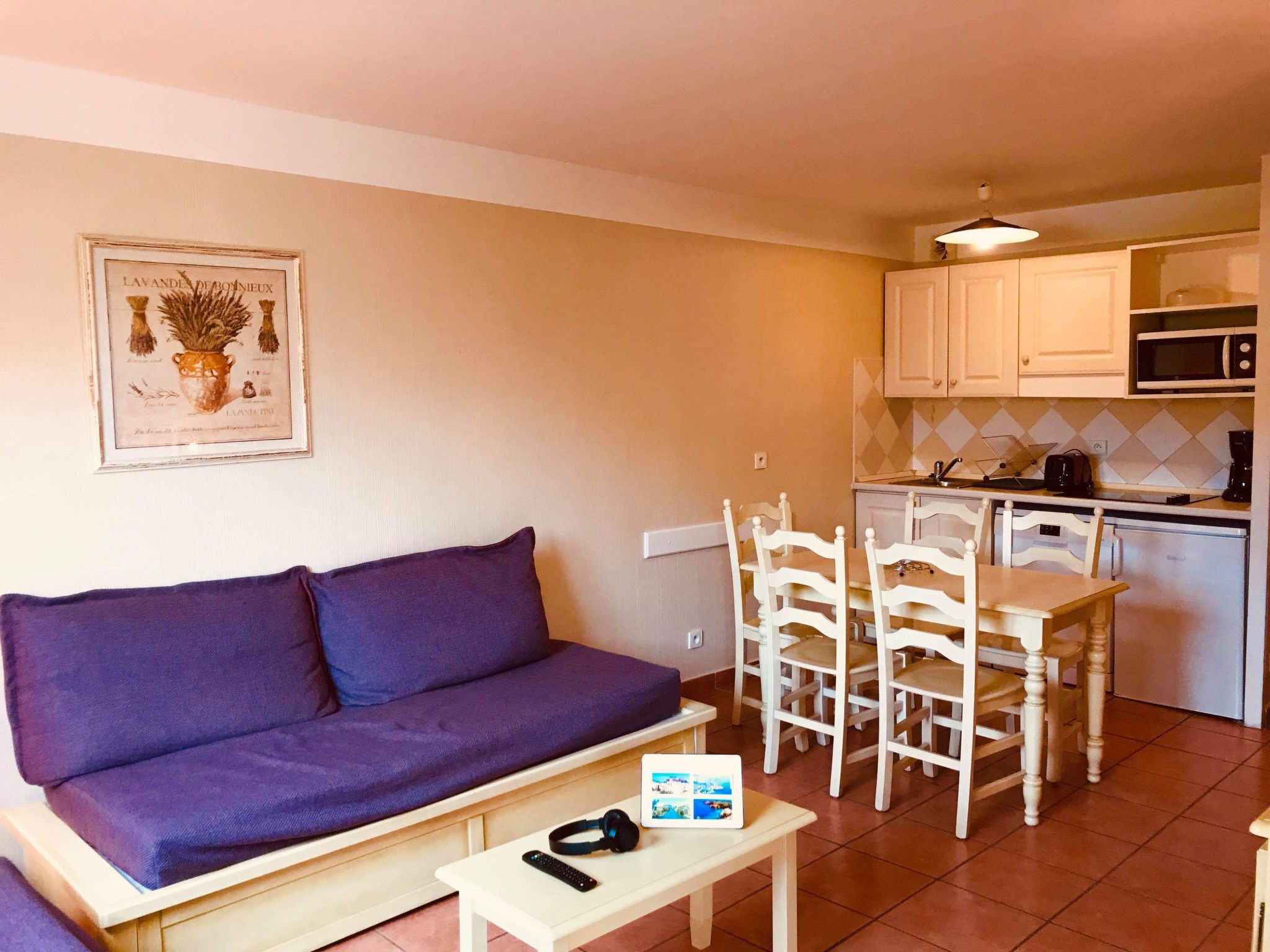 L'intérieur de 35 m² est lumineux et bien agencé, garantissant un séjour confortable. La chambre accueillante dispose d’un lit double et jouit d'une vue apaisante sur la piscine, promettant des réveils doux et agréables. La salle de bains est judicieusement séparée des toilettes, offrant ainsi plus de commodité. Le salon, équipé de deux couchages simples, partage son espace avec une cuisine fonctionnelle dotée de tout le nécessaire : réfrigérateur-congélateur, lave-vaisselle, lave-linge, fer à repasser, micro-ondes, petit four ainsi que des cafetières électrique et Tassimo, pour satisfaire toutes vos envies culinaires.