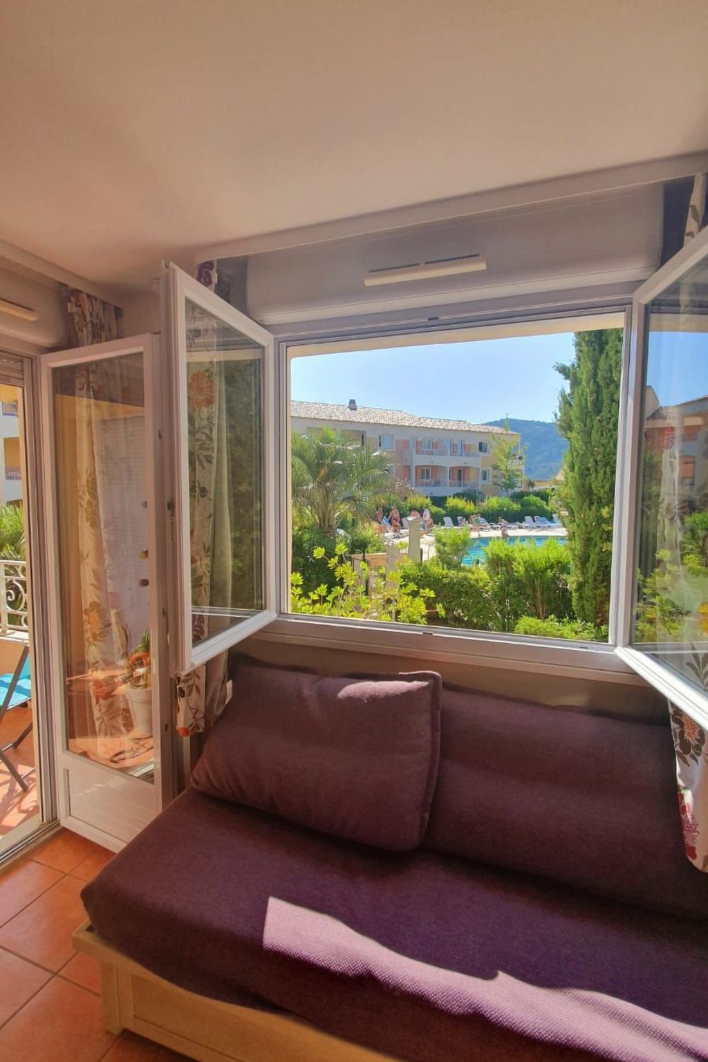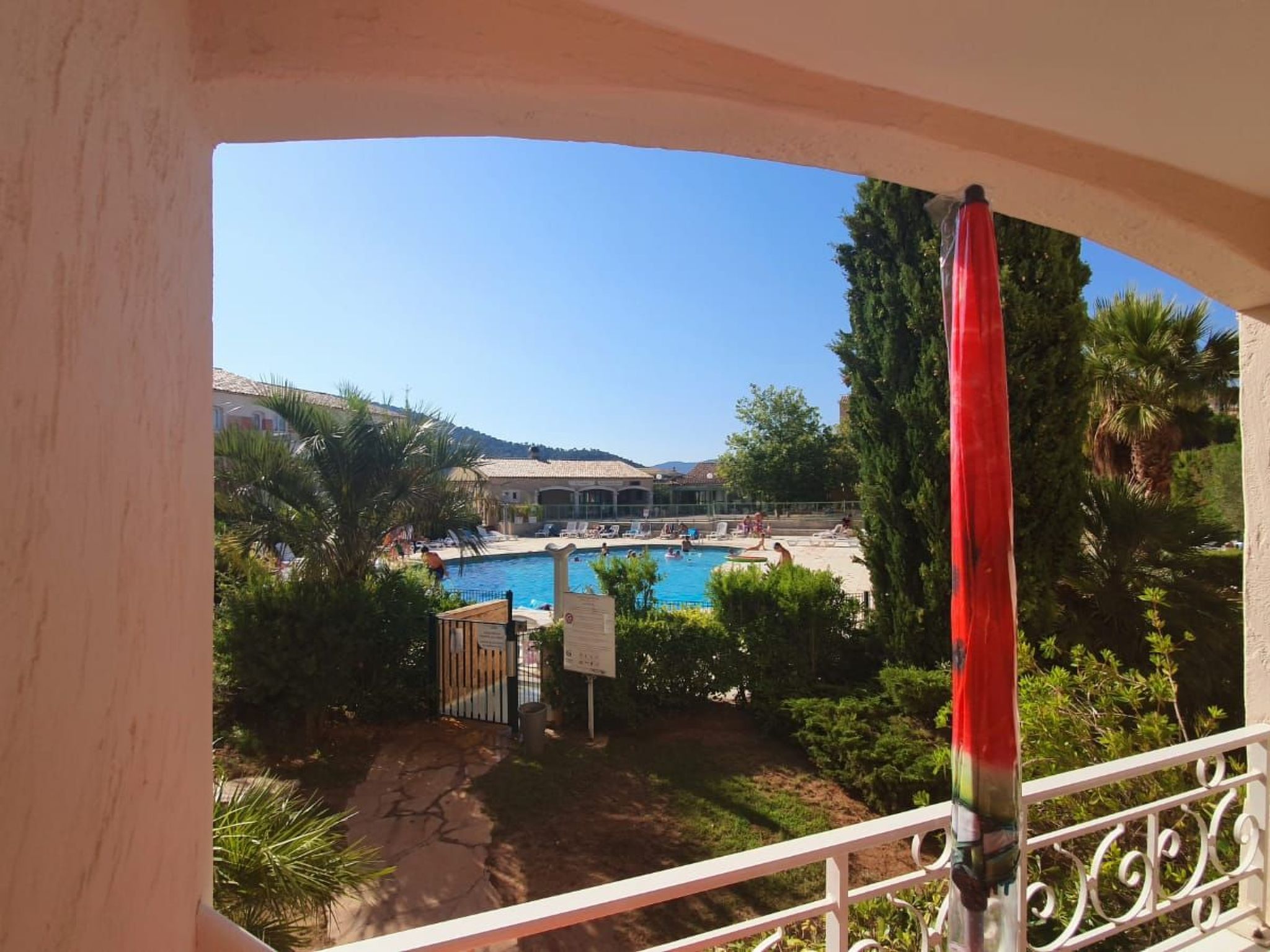 L'extérieur n'est pas en reste, avec un balcon invitant ,équipé d’une table et de chaises pour savourer des repas au grand air tout en admirant la vue sur la piscine. Accédez à ce petit paradis via quelques marches ou par un accès de plain-pied, facilitant l'entrée pour tous. La climatisation dans chaque pièce assure votre confort tout au long de votre séjour. De plus, un jardin collectif offre une vue magnifique sur le golf de Saint-Tropez, et le parking au sein de la résidence sécurisée par une barrière électrique signifie que vous n'aurez jamais à vous soucier de trouver un endroit où laisser votre véhicule.