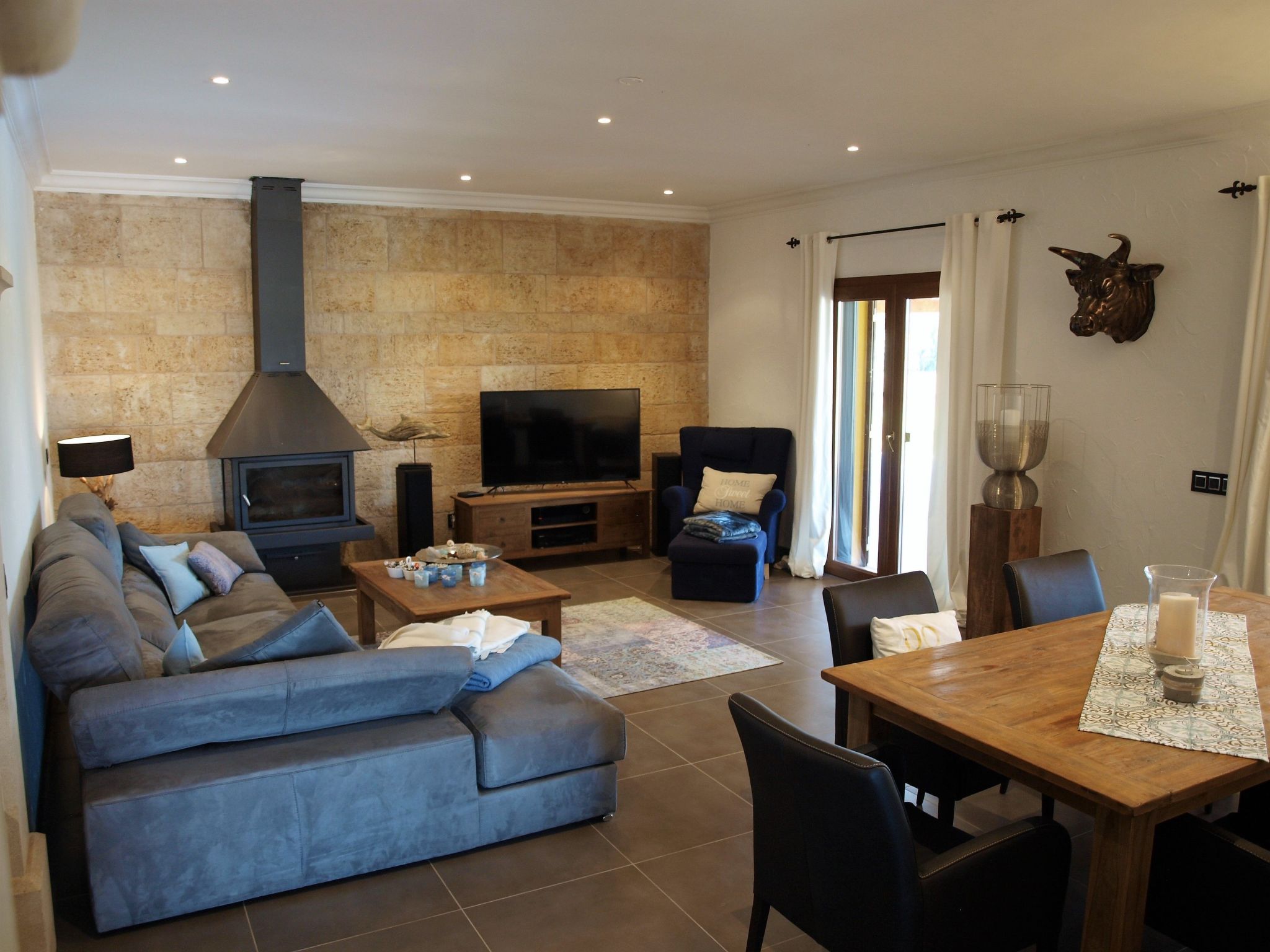 The interior of this luxurious accommodation invites you to linger with 250 m² of living space, consisting of three double bedrooms with large beds and air conditioning, three bathrooms and a fully equipped kitchen with dining area. A spacious living room with a comfortable seating area, large dining table, flat-screen TV and modern fireplace is available for cosy evenings. The furnishings are comprehensive and selected with attention to detail, including an option for WiFi, washing machine, dryer and ironing station - everything your heart desires for a carefree holiday.