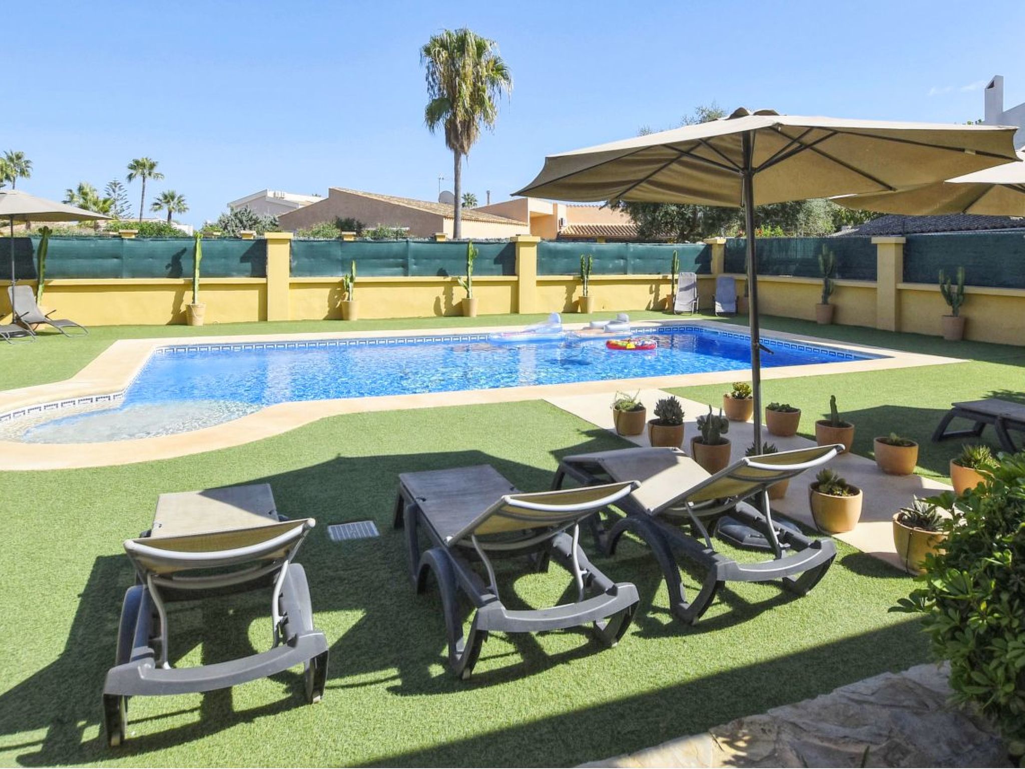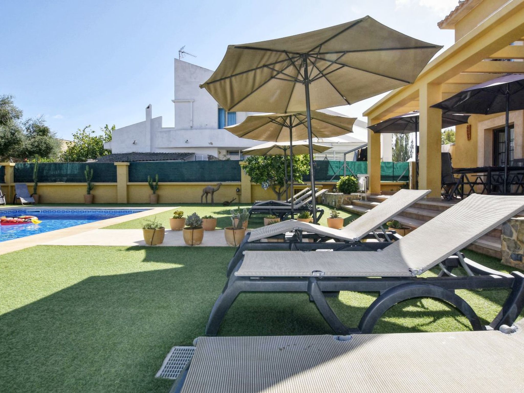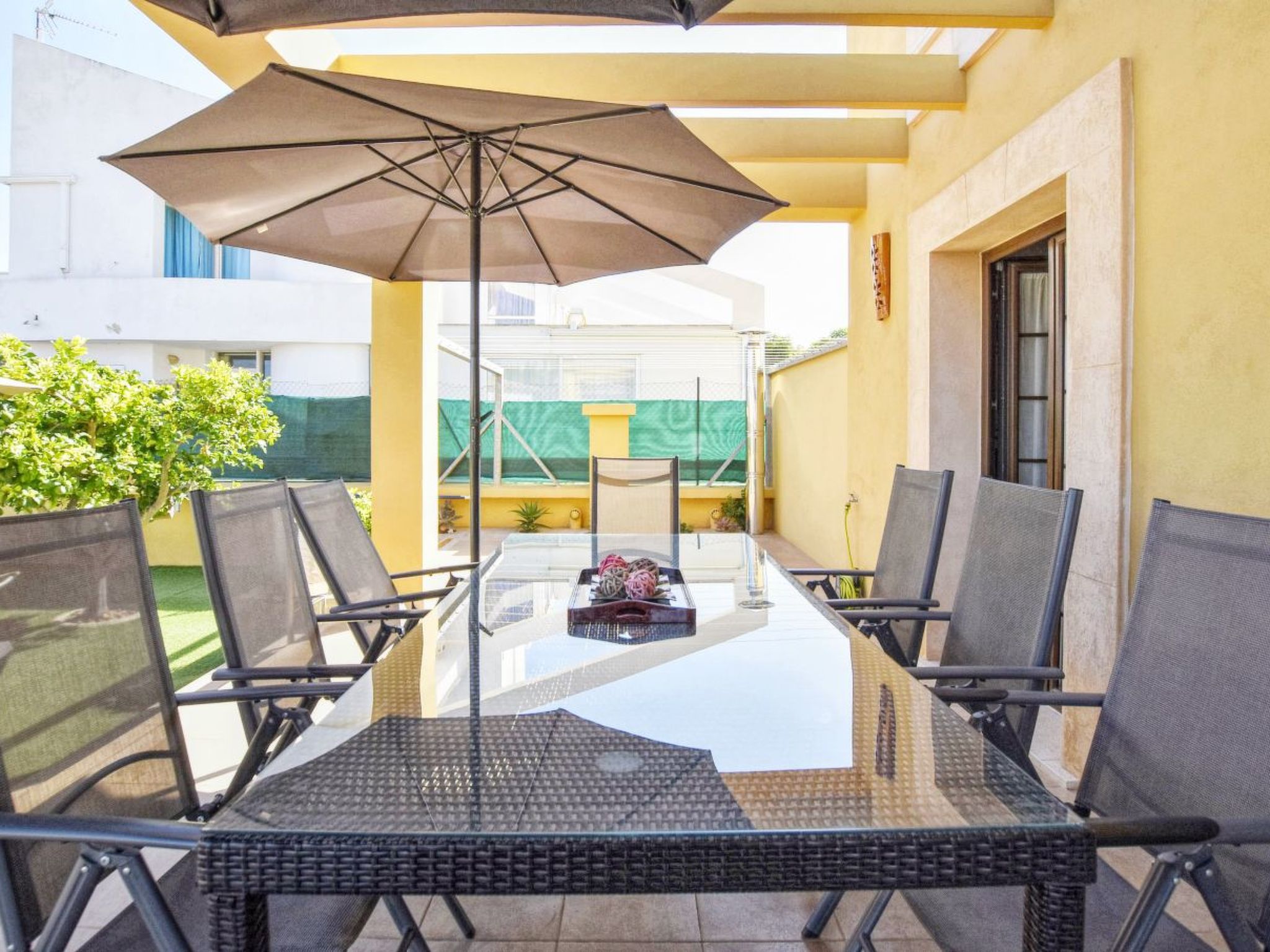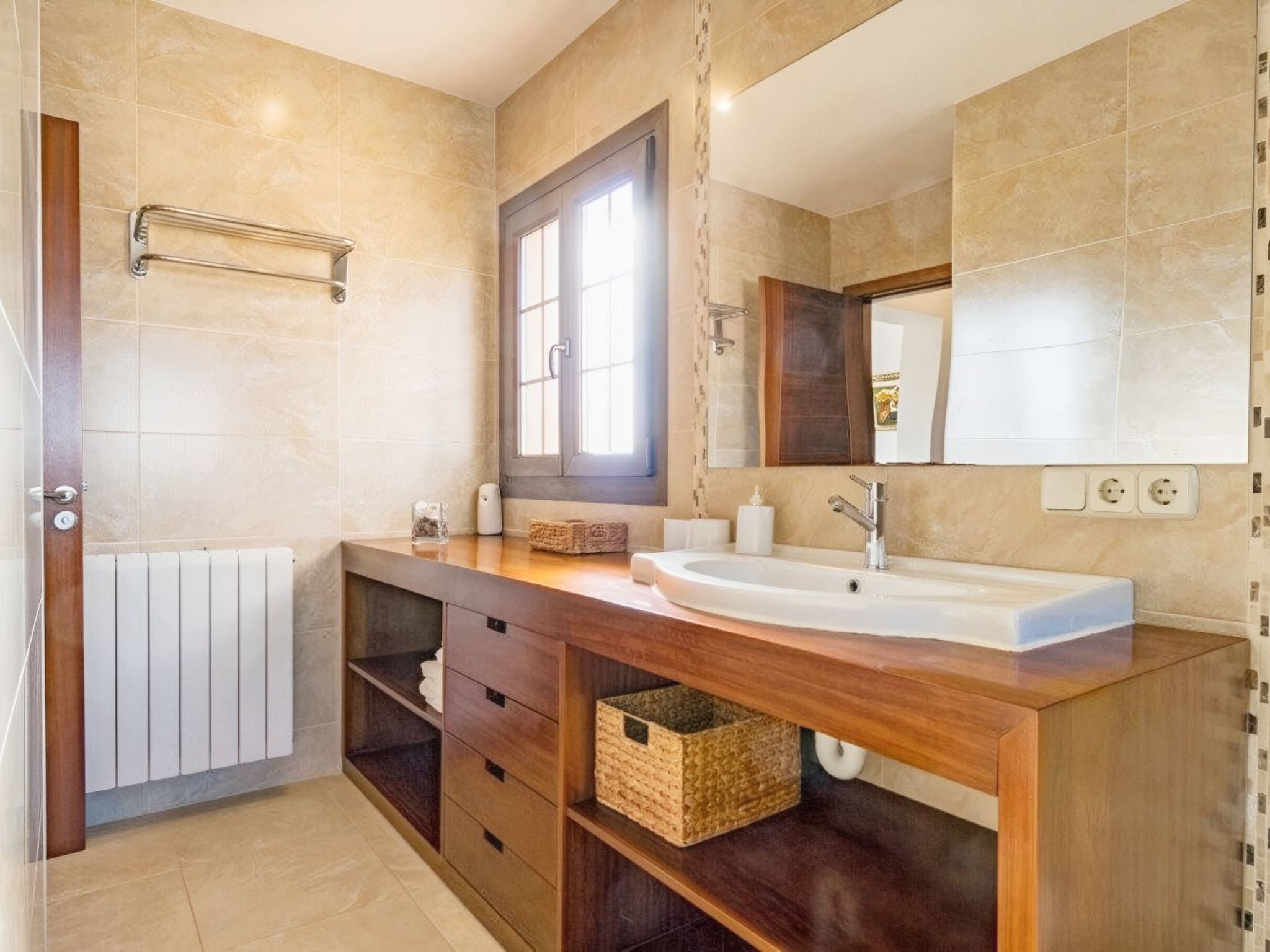 Impresionante villa en una exclusiva residencia privada en la popular zona de Sa Coma, en la costa este de Mallorca. The villa, in Mediterranean style, has approximately 200 square metres distributed over 2 plantas, with 4 bedrooms and 3 bathrooms. One of the bedrooms is on the lower floor and has a bath with shower and access to the terrace. Los otros 3 dormitorios están arriba y comparten los otros dos cuartos de baño (uno con bañera). En el nivel inferior se encuentran también una sala de estar con chimenea y acceso a la terraza y una cocina totalmente equipada con lavavajillas, vitrocerámica, horno, tostador, microondas y cafetera. The exterior of the house is magnificent, with a large terrace, a well-tended garden with barbecue, outdoor pool and a huge 12m x 6m (0.80m x 1.80m deep) swimming pool. Sa Coma is a small village near Porto Cristo, on the east coast of Mallorca. The playa de arena limpia y blanca de Sa Coma se extiende sobre una longitud de casi 1 kilómetro. The water on this playa was awarded the Bandera Azul for its high quality. Detrás de la playa hay un paseo extenso marítimo, el cual conecta en el sur con el pequeño complejo del S'illot.