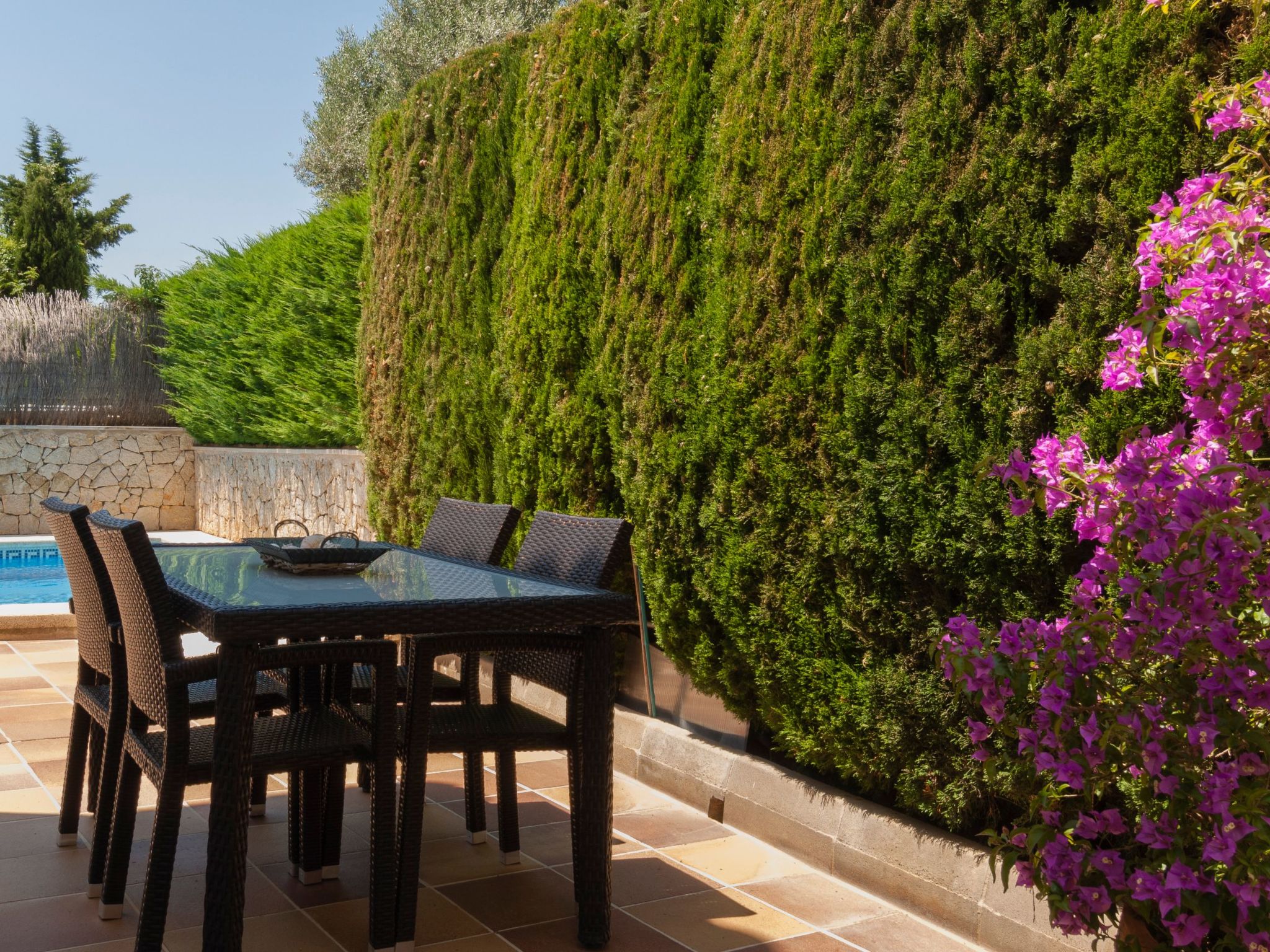 À l'avant de la maison, il y a également un coin salon extérieur, ainsi qu'une table et des chaises dans une zone semi-ombragée donnant sur la piscine.