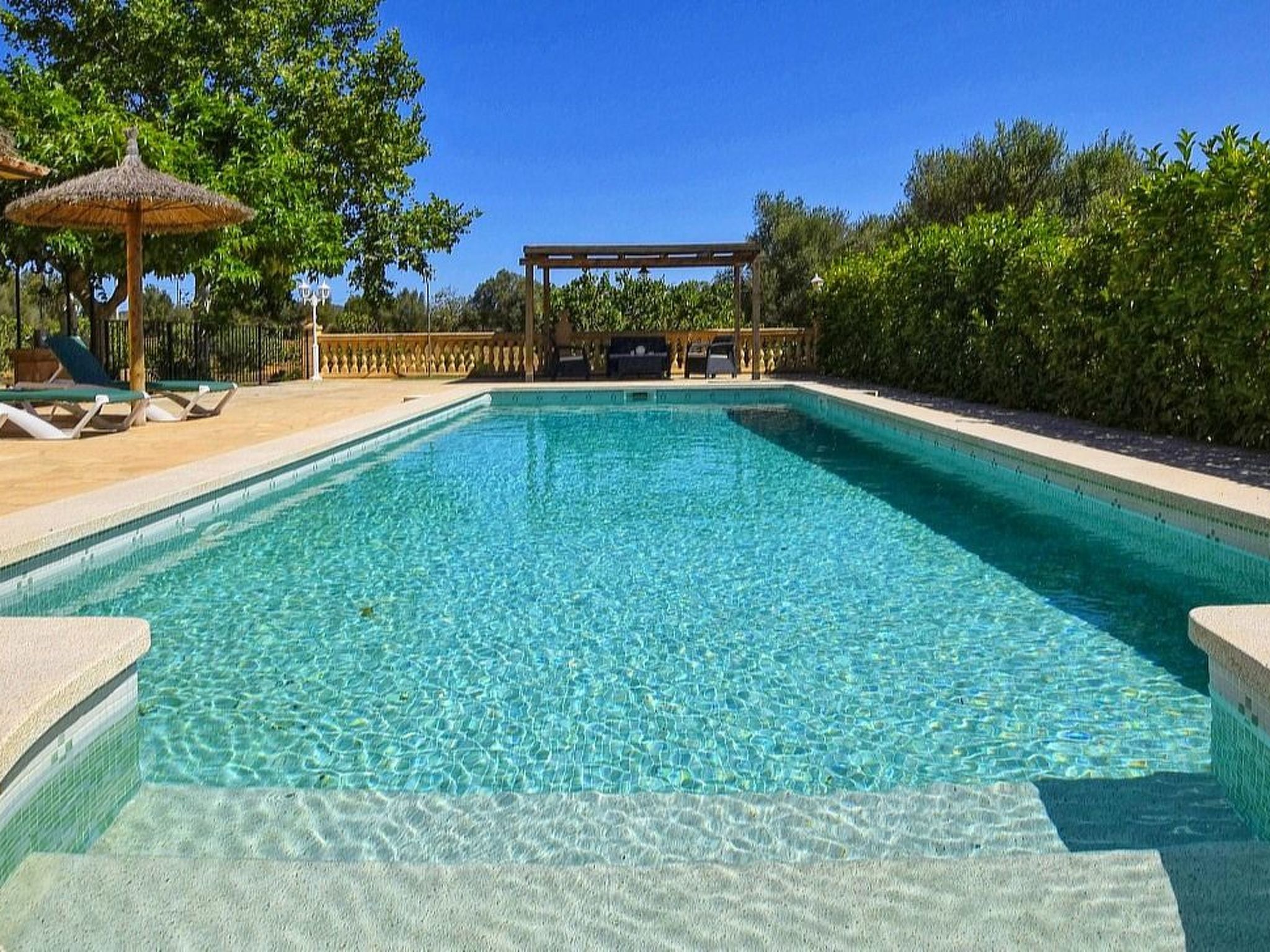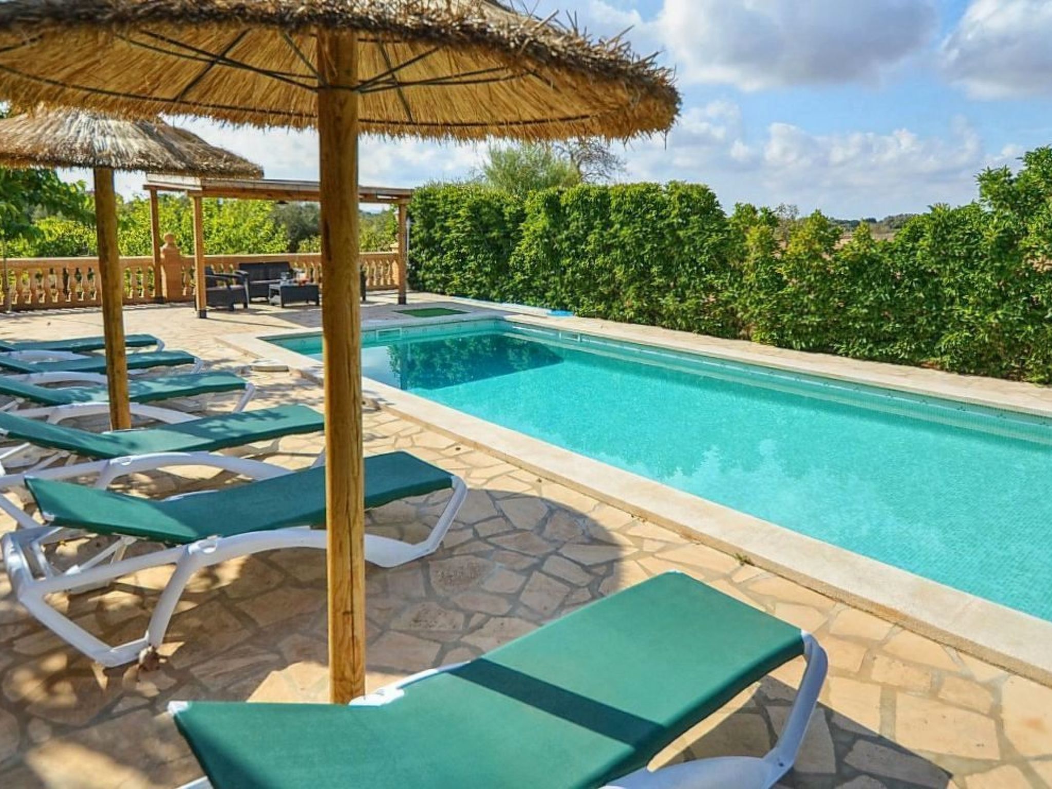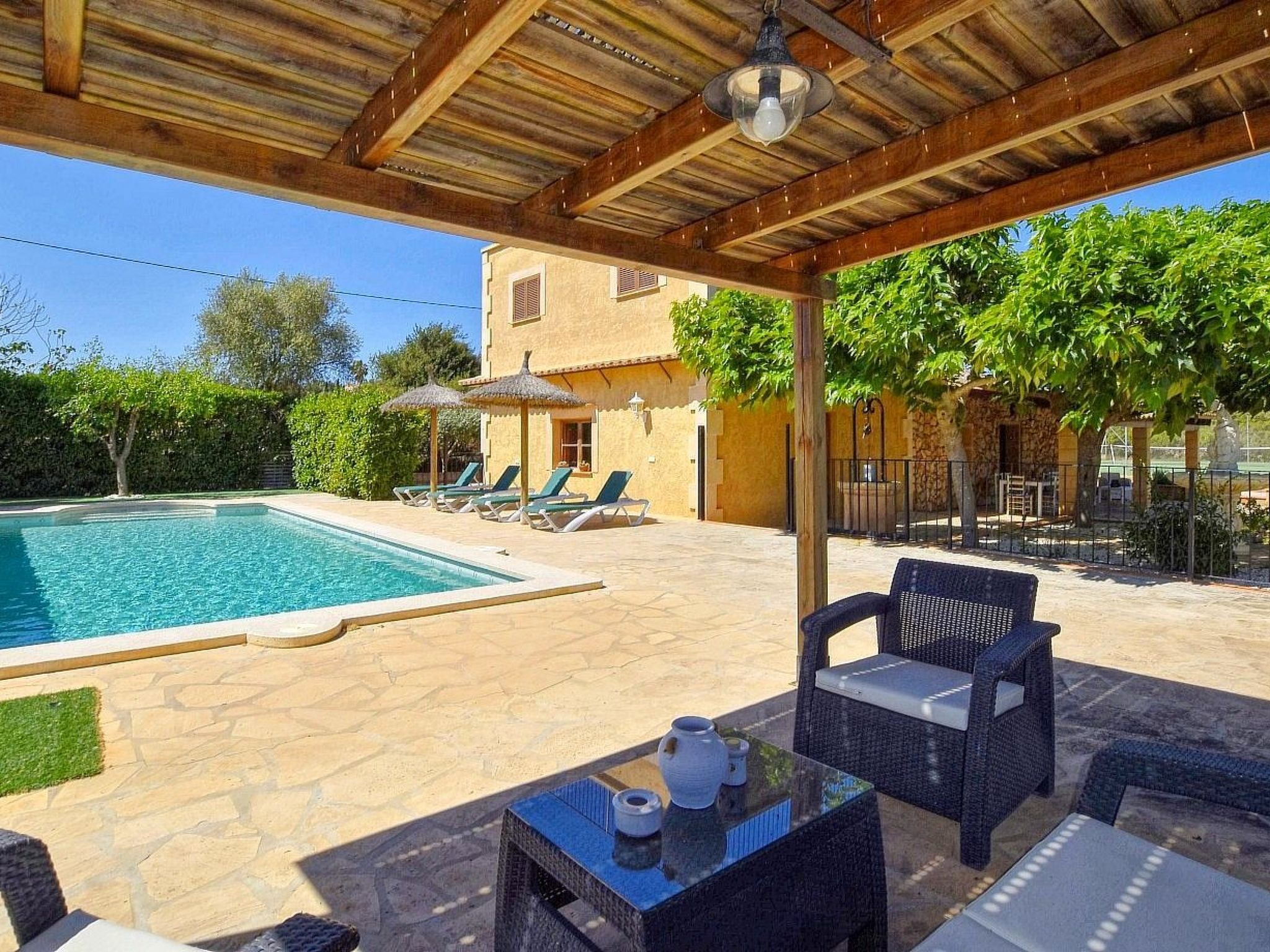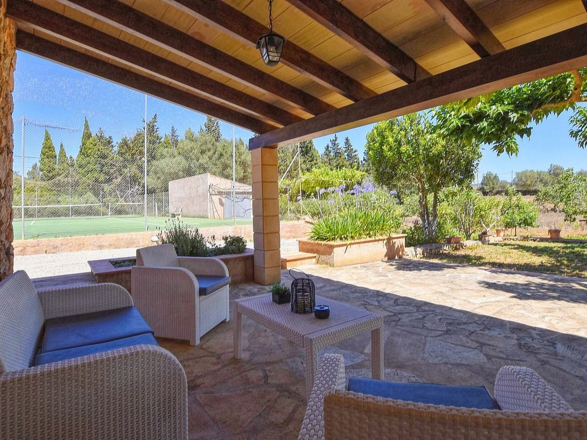 The house is surrounded by an idyllic garden with many shady spots. The paved pool terrace with two fixed thatched umbrellas houses the 11 m x 4 m ( 0.80 m to 1.90 m deep ) private salt water swimming pool with outdoor shower and a wooden porch with sofas for relaxing. An indoor brick grill has been installed for our guests on the pool terrace, so you don't have to sizzle in the sun while preparing the barbecue. Another highlight of Finca SA COVA, and therefore particularly attractive for families with children and sports enthusiasts, is its own tennis court. The finca offers a nice and quiet location, but is only a 5 minutes' drive away from Manacor, the second largest town of Mallorca. In Manacor there are supermarkets, restaurants etc.... The beaches of the areas of Porto Cristo, Calas de Mallorca and Sa Coma on the east coast, Arta and Colonia de Sant Pere in the north can be reached by car in 15-30 minutes.