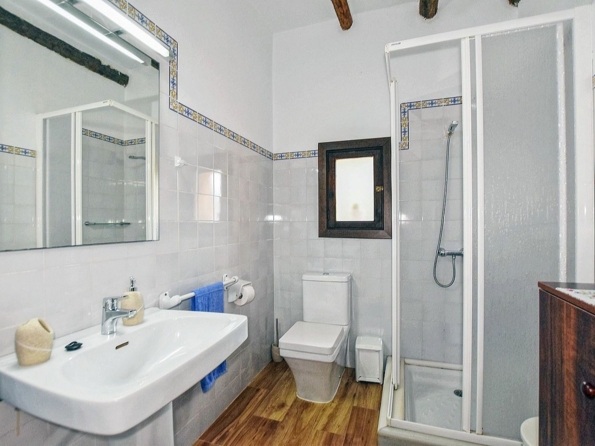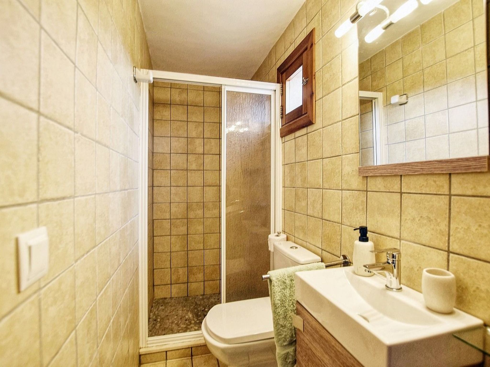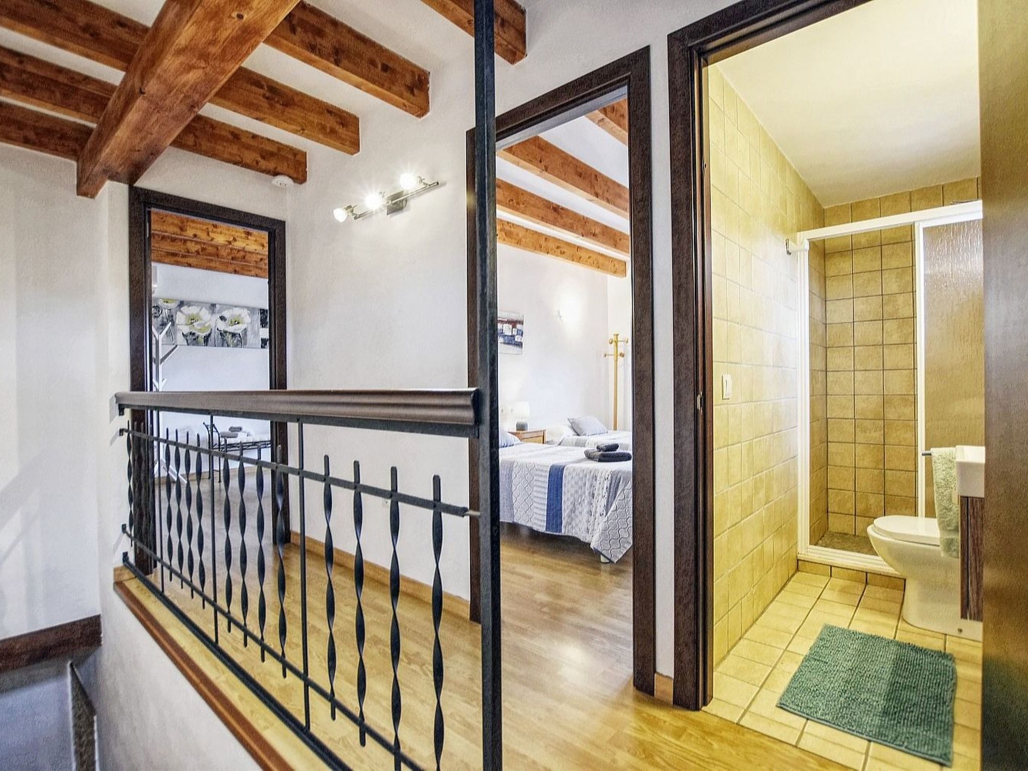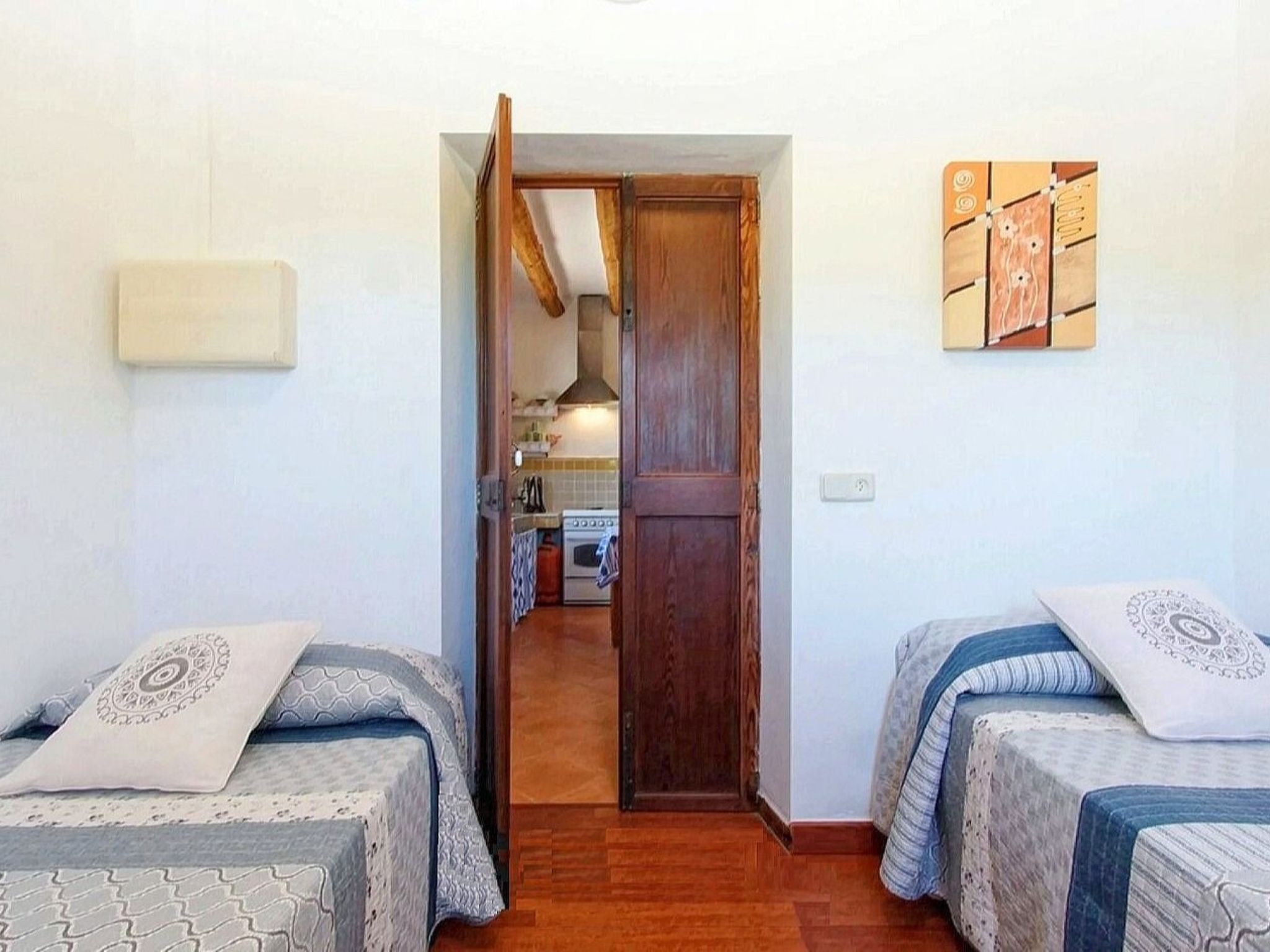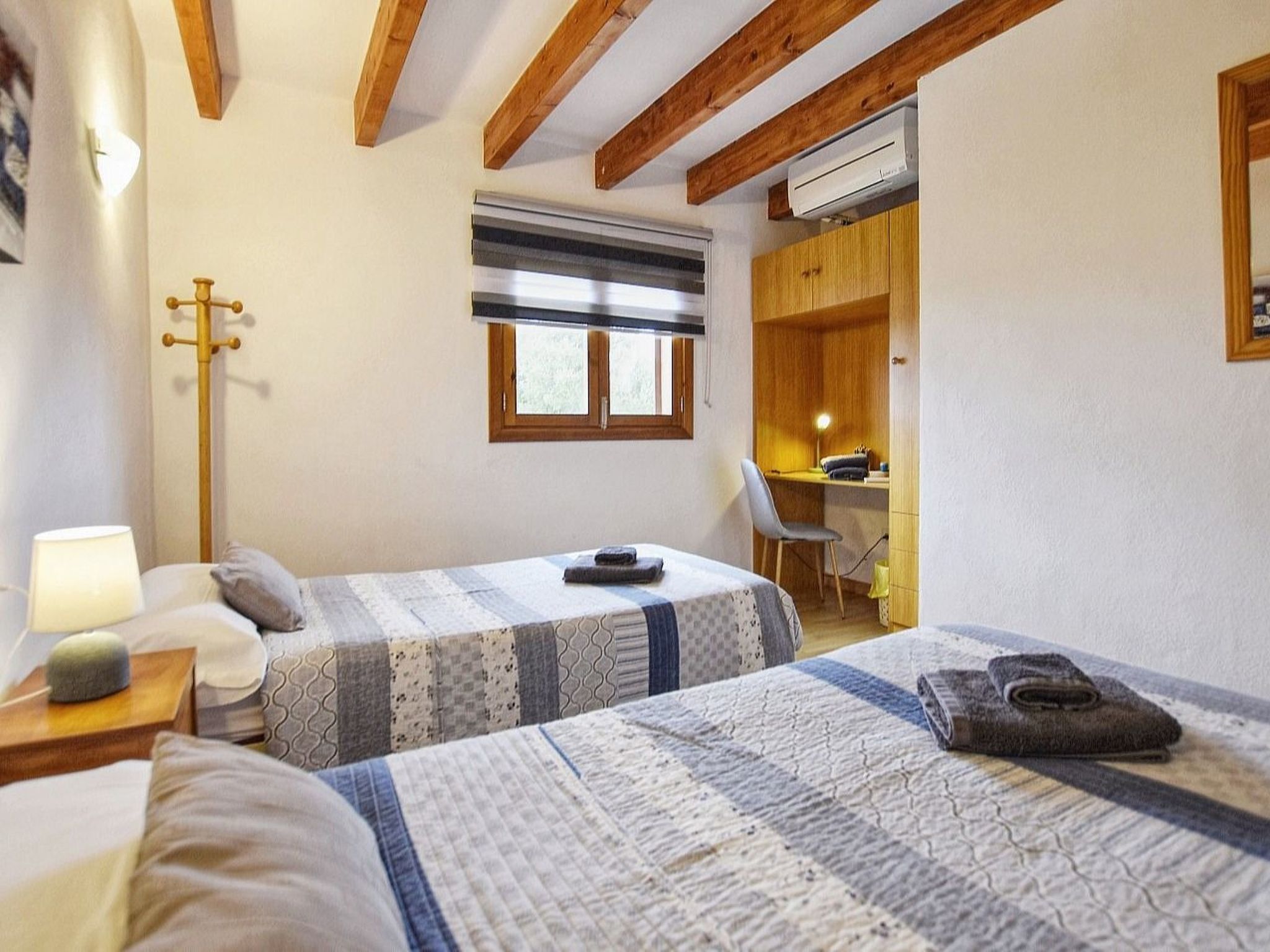 The house has approximately 150 m² of living space spread over two floors. On the lower floor is the spacious living-dining room with satellite TV and WiFi internet. Next to the living room is the open kitchen, which is equipped with dishwasher. In addition, the of the three double bedrooms is located here, this one with two single beds of 0.90 - 1.90 m each, and a bathroom with shower. The second bedroom, also with two single beds of 0.90 - 1.90 m, and the third bedroom with a double bed of 1.50 x 1.90 m, are located on the upper floor. These two bedrooms share the second bathroom with shower. The bedrooms have a wonderful view of the pool area and the surrounding landscape. The two upstairs bedrooms have air conditioning and the downstairs bedroom has a ceiling fan.