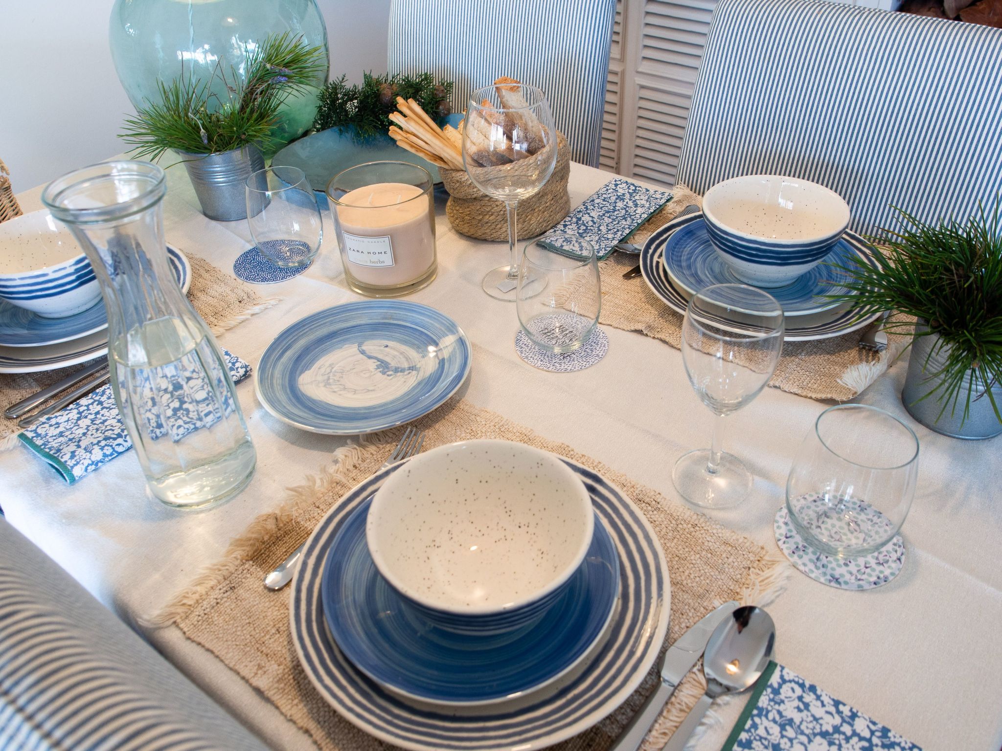 The large terrace with awnings is furnished with a table with two chairs and a comfortable sofa.
