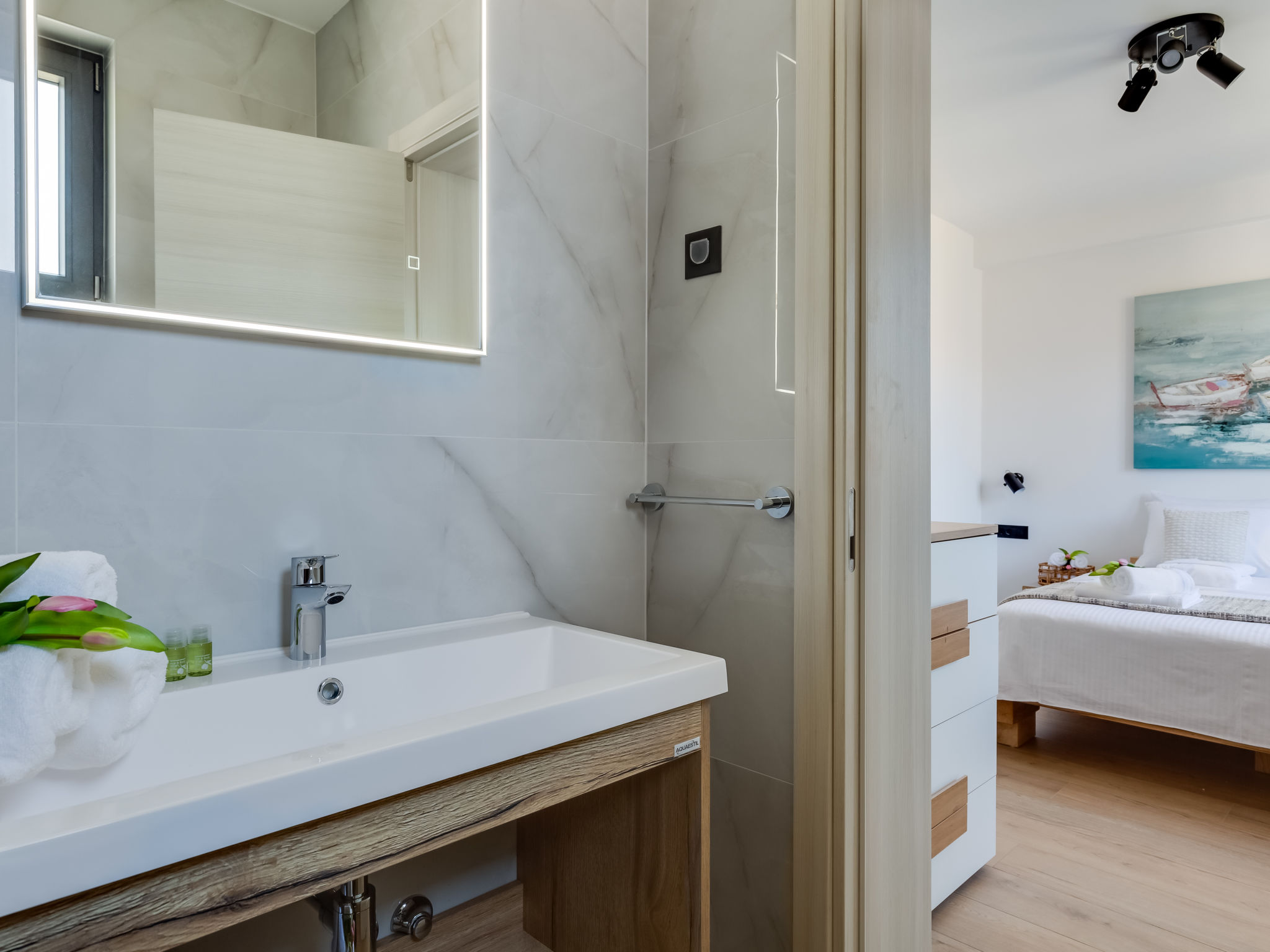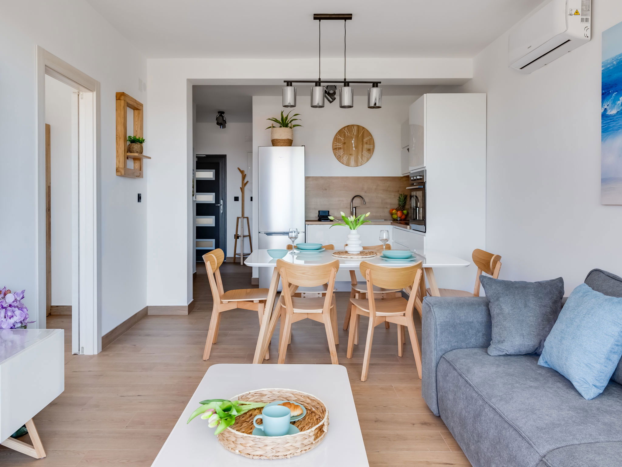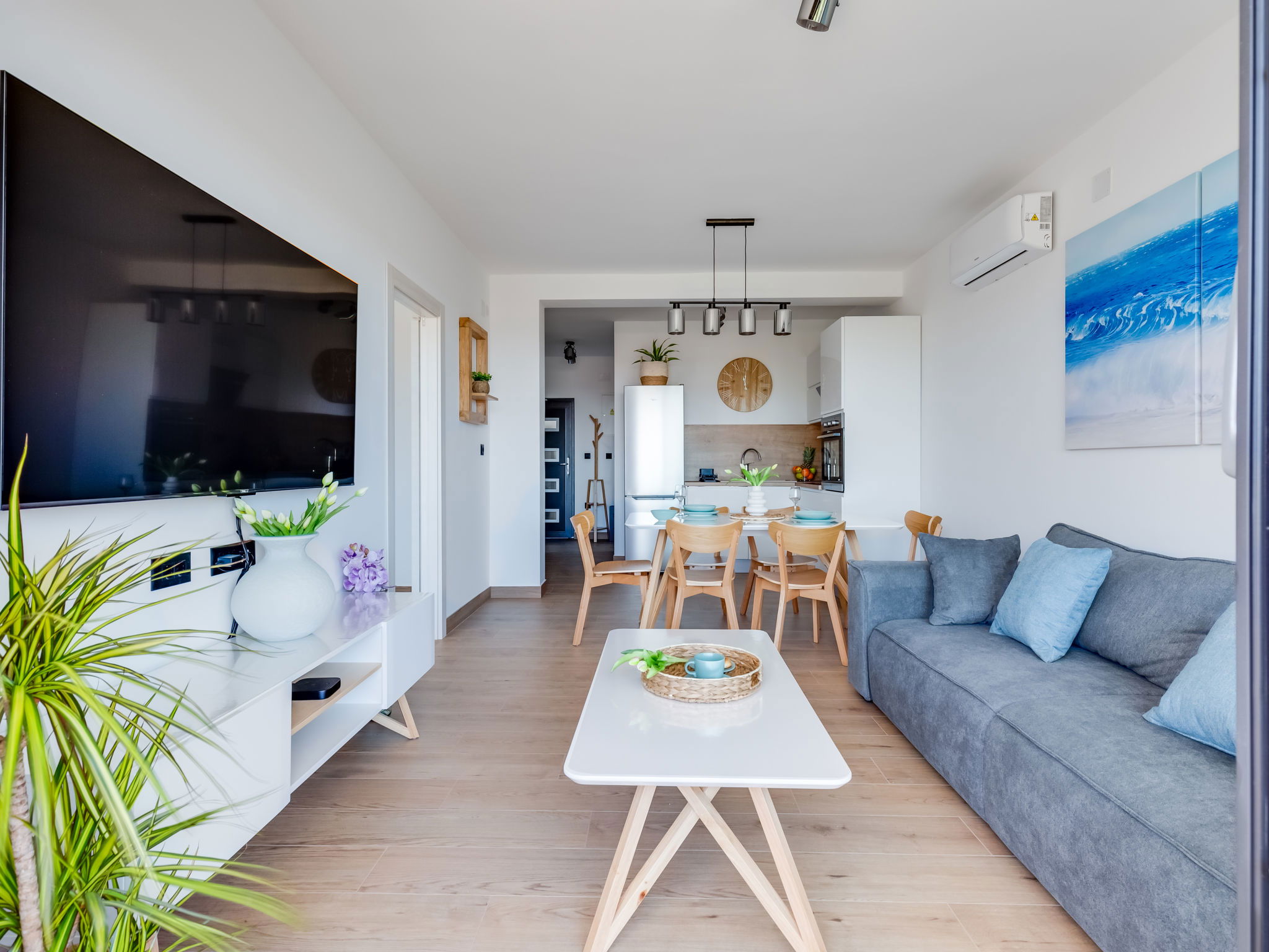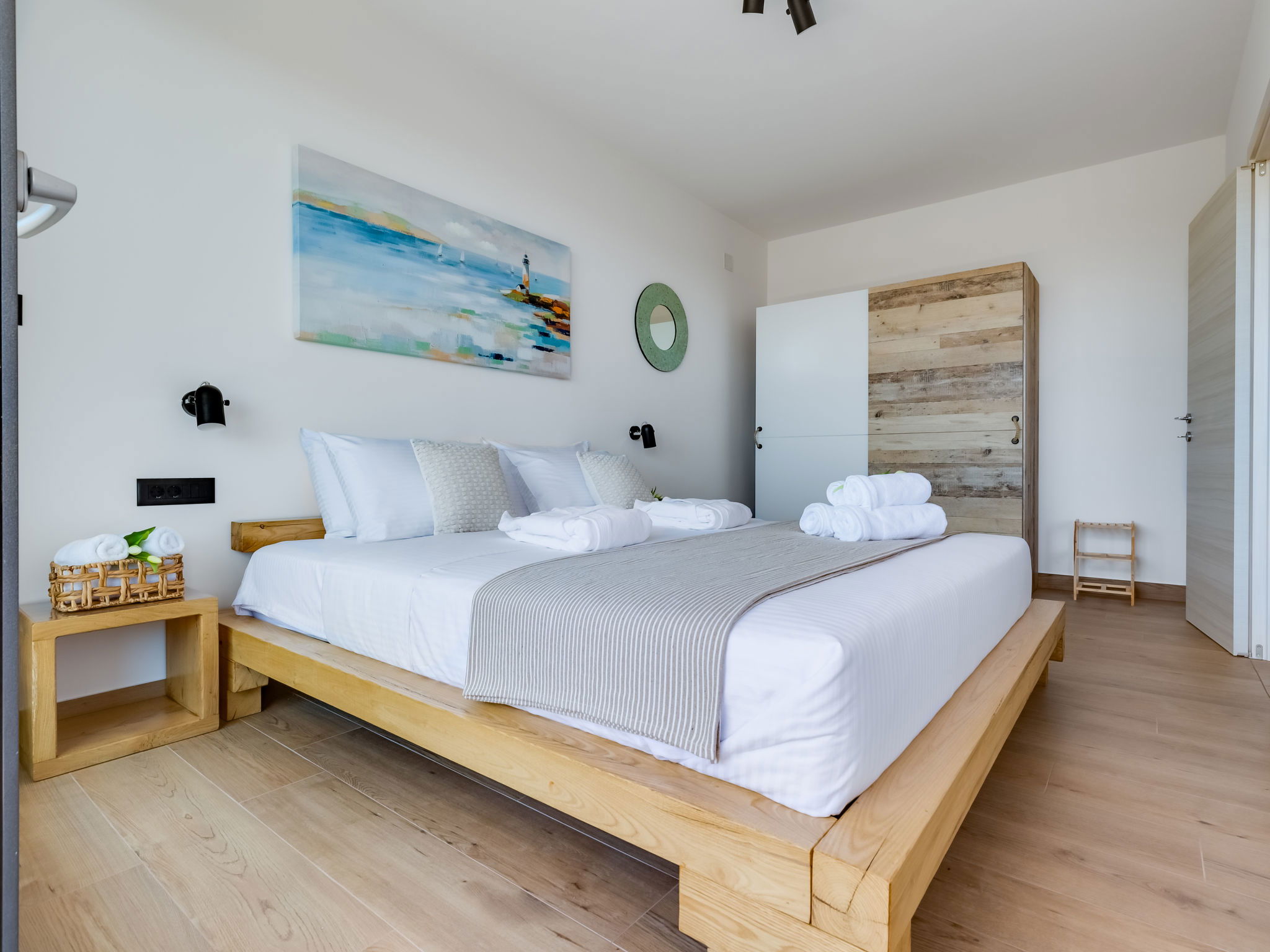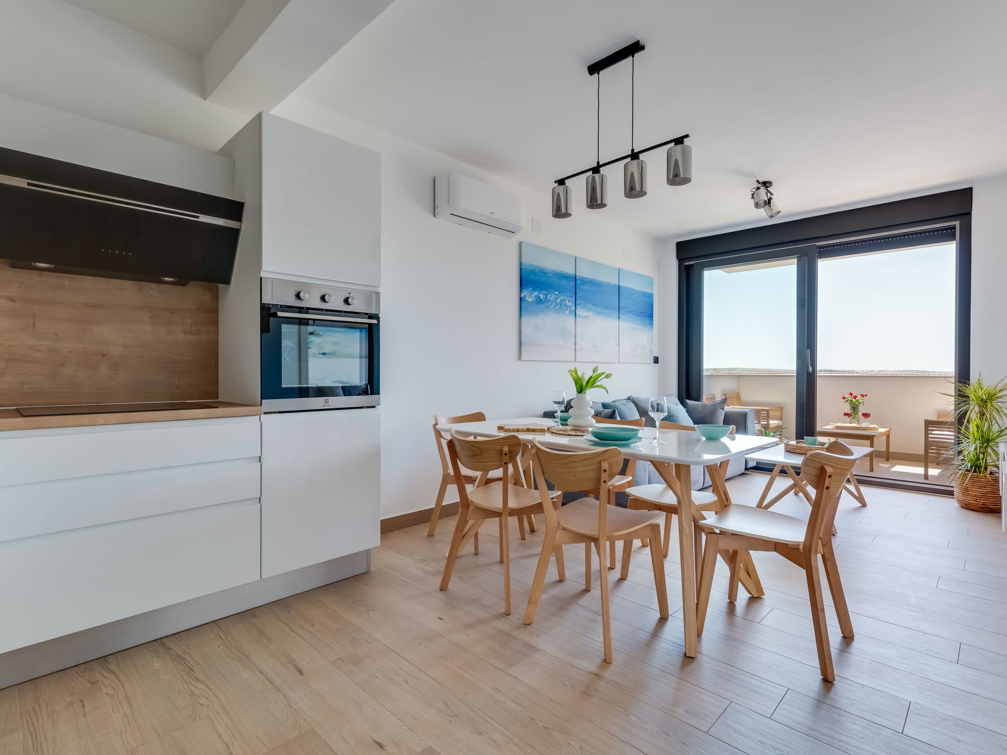 Appartement de 3 pièces 65 m2 au 1er étage, situation sud-ouest. Séjour/salle à manger 35 m2 avec TV (câblée) et chaînes de TV internationales (écran plat), air-conditionné. Sortie sur la terrasse. 1 chambre avec 1 grand-lit (160 cm, longueur 200 cm), bain/WC et air-conditionné. 1 chambre avec 1 grand-lit (180 cm, longueur 200 cm). Cuisine ouverte (four, lave-vaisselle, 4 plaques à induction, congélateur, cafetière électrique). Douche/WC. Chauffage par le sol. Terrasse 12 m2, couverte. Meubles de terrasse. Vue panoramique sur la mer. A disposition: lave-linge, coffre-fort, sèche-cheveux. Internet (Connexion WIFI, gratuit). Maximum 1 animal/ chien autorisé.