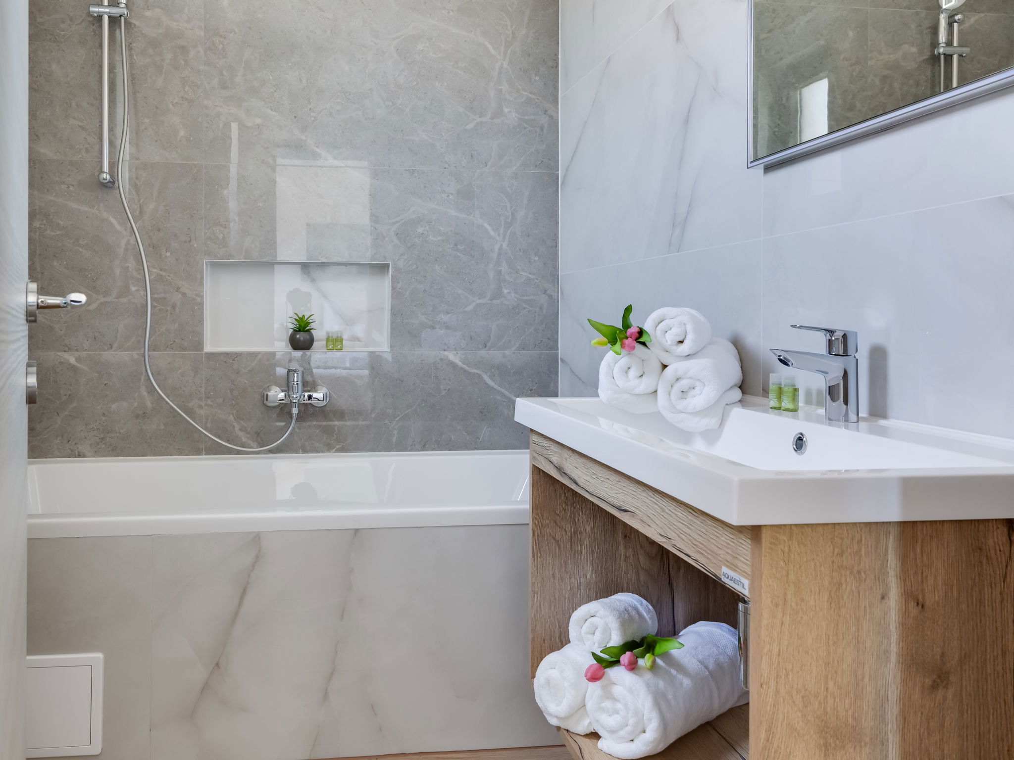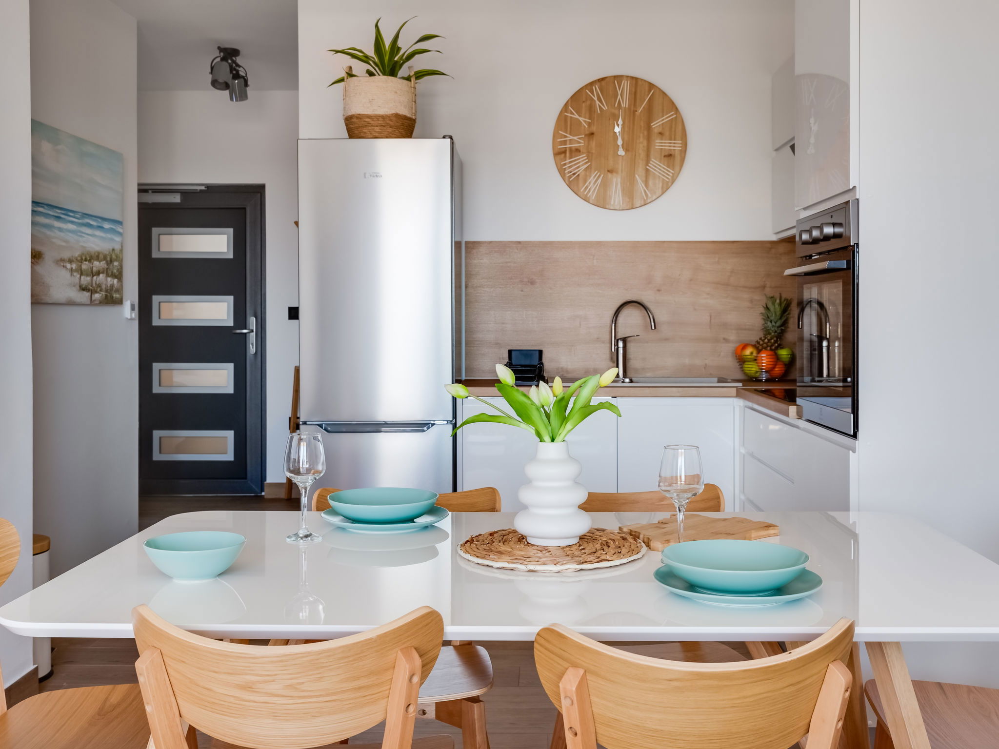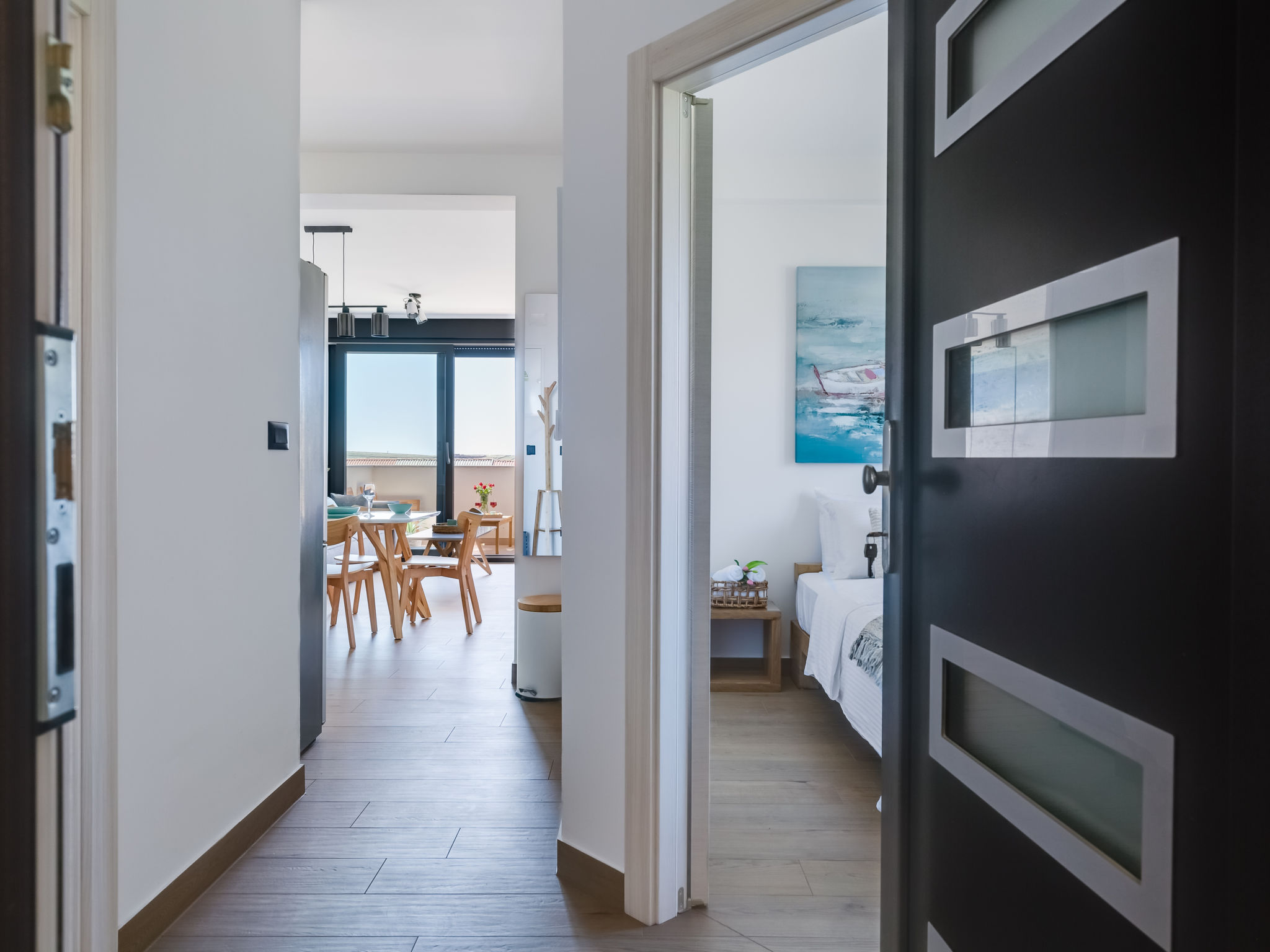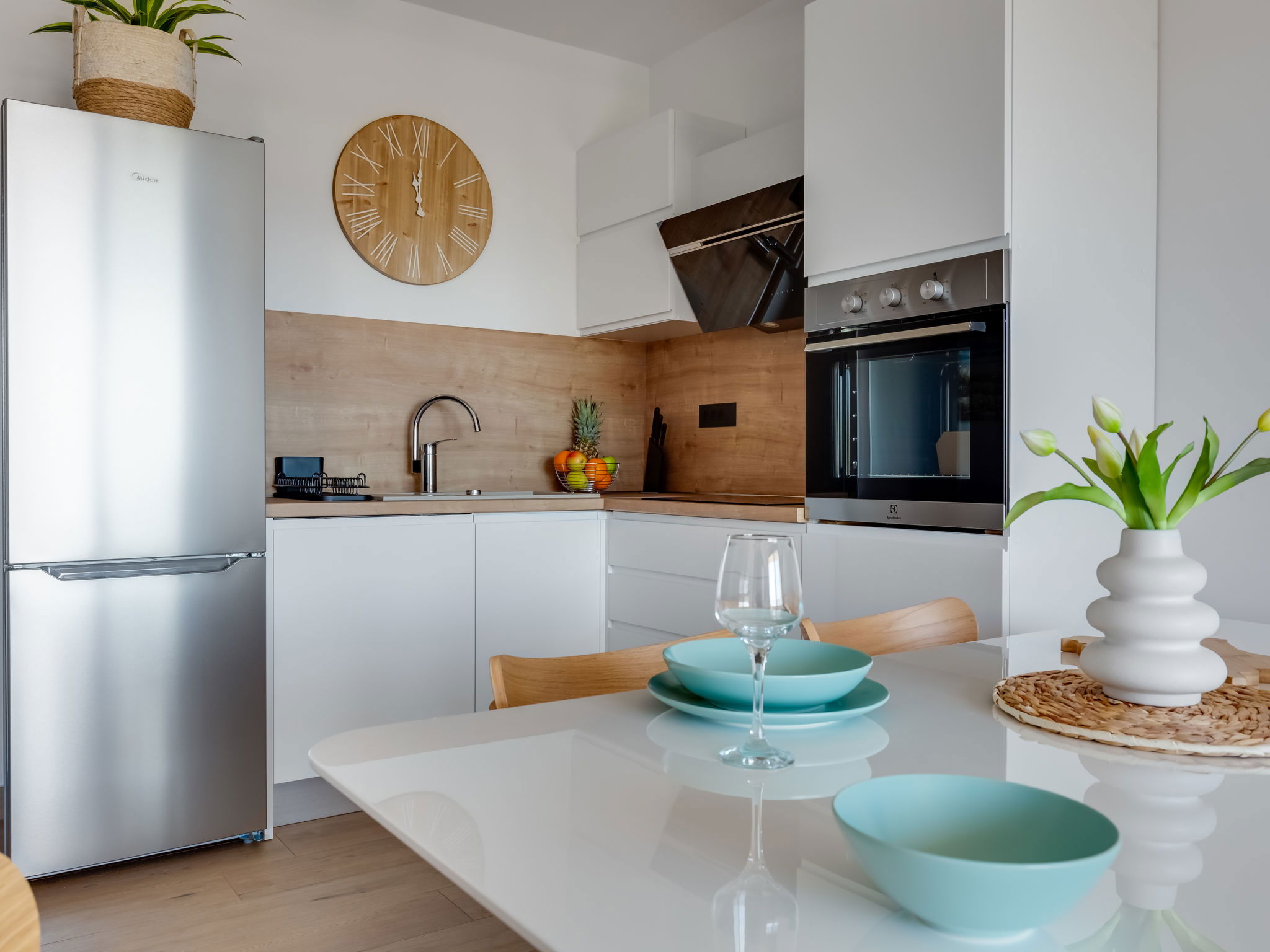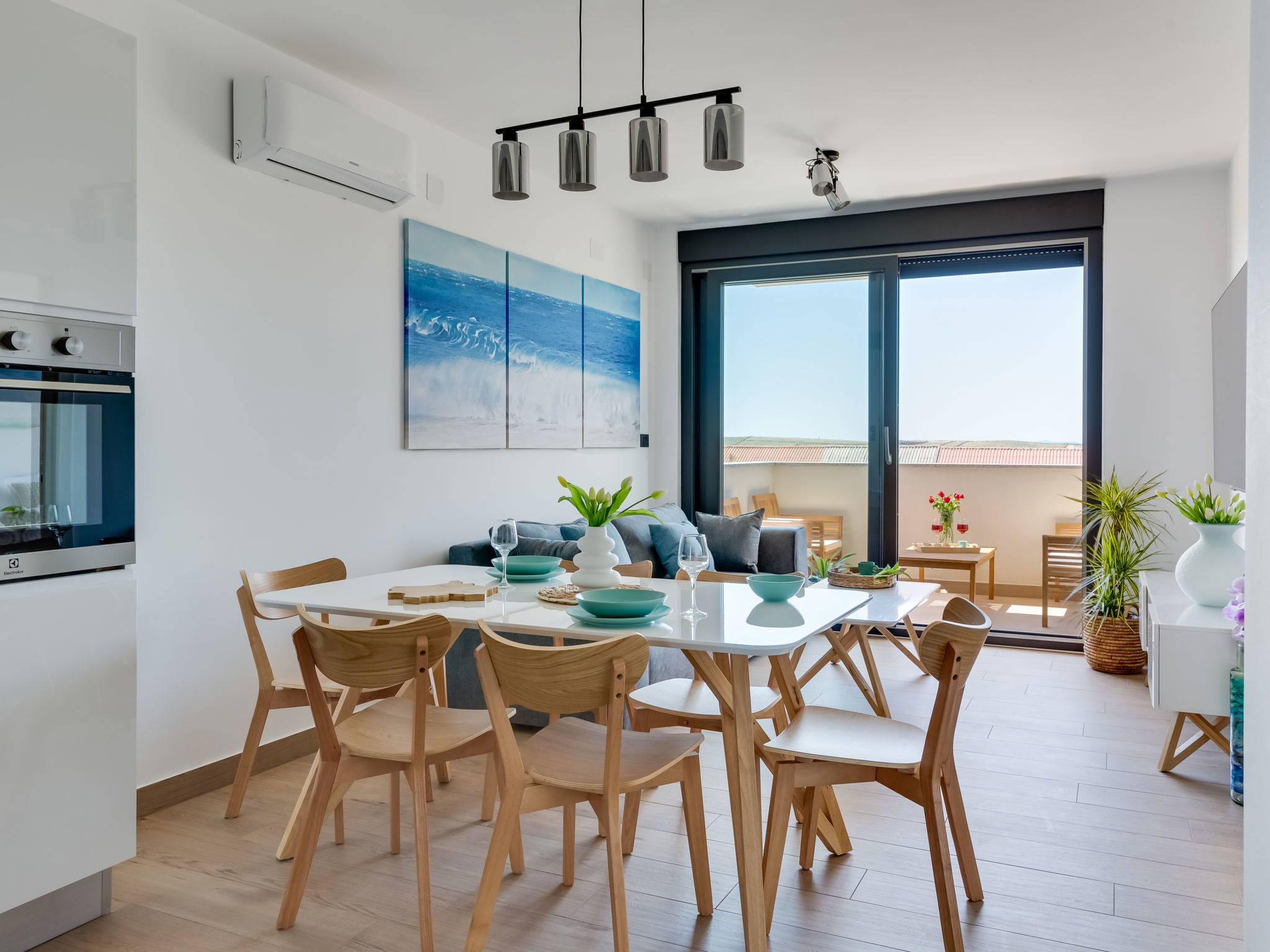 Appartement de 3 pièces 65 m2 au 1er étage, situation sud-ouest. Séjour/salle à manger 35 m2 avec TV (câblée) et chaînes de TV internationales (écran plat), air-conditionné. Sortie sur la terrasse. 1 chambre avec 1 grand-lit (160 cm, longueur 200 cm), bain/WC et air-conditionné. 1 chambre avec 1 grand-lit (180 cm, longueur 200 cm). Cuisine ouverte (four, lave-vaisselle, 4 plaques à induction, congélateur, cafetière électrique). Douche/WC. Chauffage par le sol. Terrasse 12 m2, couverte. Meubles de terrasse. Vue panoramique sur la mer. A disposition: lave-linge, coffre-fort, sèche-cheveux. Internet (Connexion WIFI, gratuit). Maximum 1 animal/ chien autorisé.