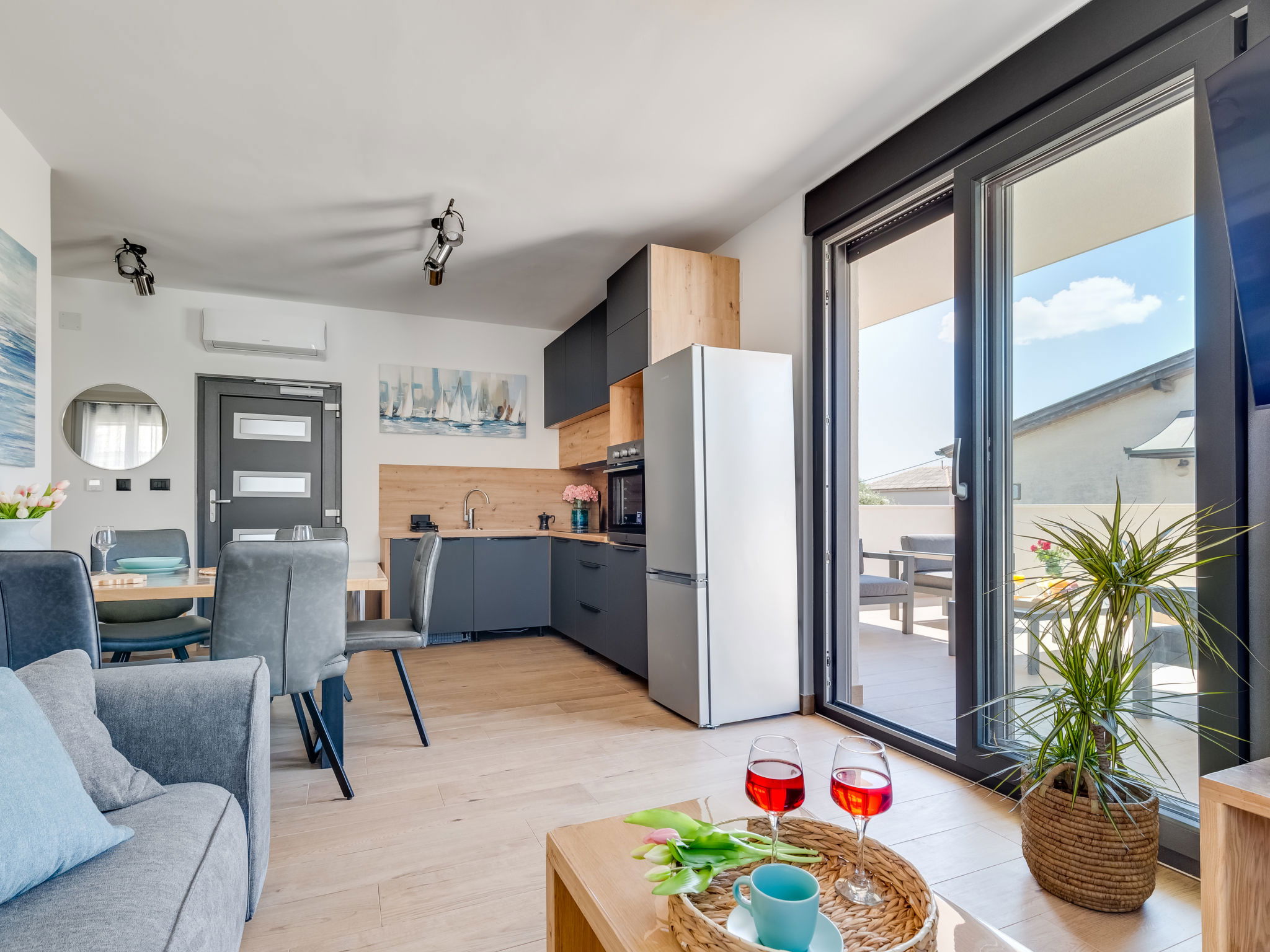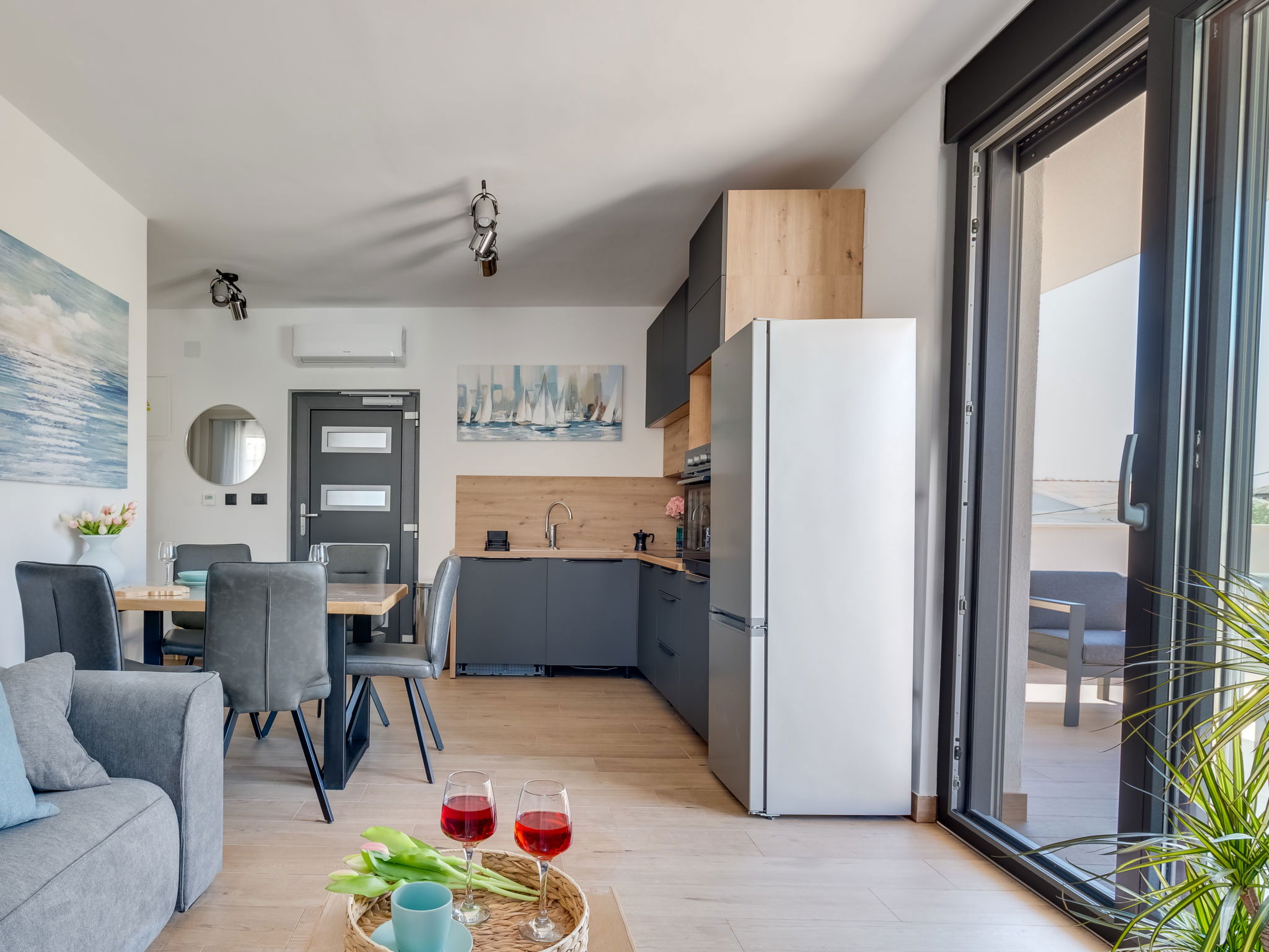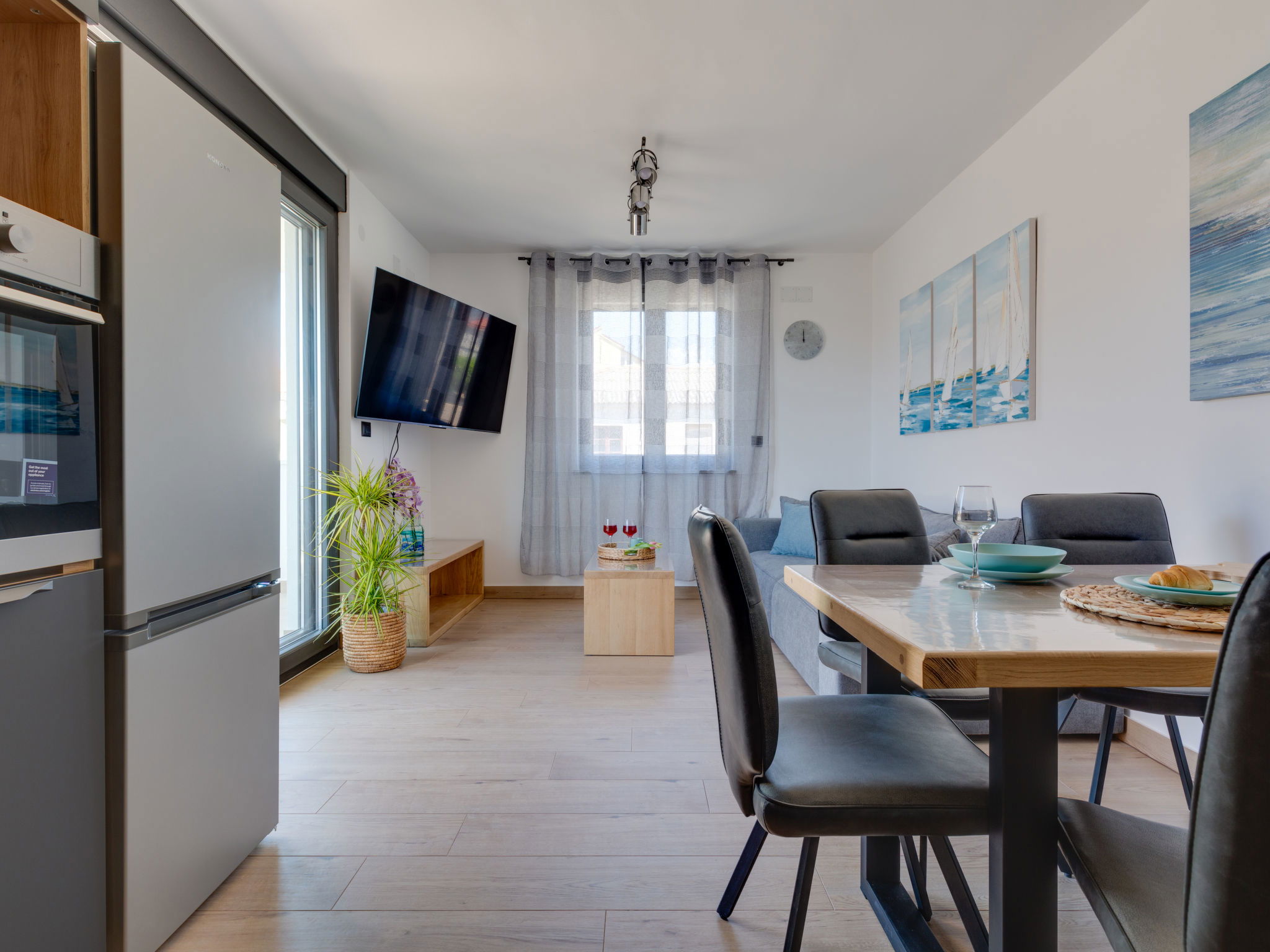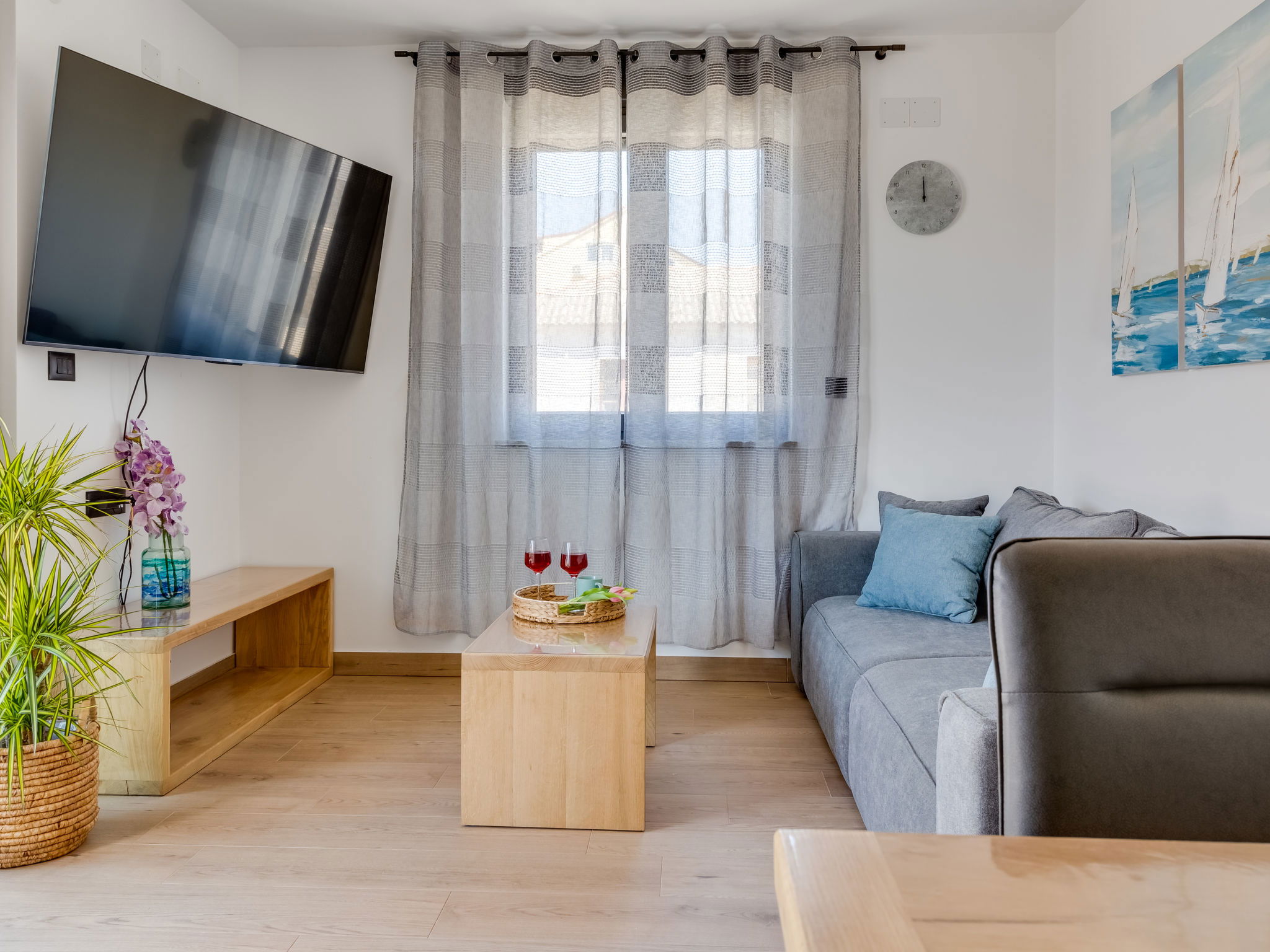 Appartement de 2 pièces 50 m2 au 1er étage, situation nord-est. Séjour/salle à manger 35 m2 avec 1 divan-lit double (140 cm, longueur 200 cm), TV (câblée) et chaînes de TV internationales (écran plat), air-conditionné. Sortie sur la terrasse. 1 chambre avec 1 grand-lit (160 cm, longueur 200 cm). Cuisine ouverte (four, lave-vaisselle, 4 plaques à induction, grille-pain, bouilloire électrique, congélateur, cafetière électrique). Douche/WC. Chauffage par le sol. Terrasse 30 m2, couverte. Meubles de terrasse. Vue éloignée sur la mer. A disposition: lave-linge, coffre-fort, sèche-cheveux. Internet (Connexion WIFI, gratuit). Maximum 1 animal/ chien autorisé.