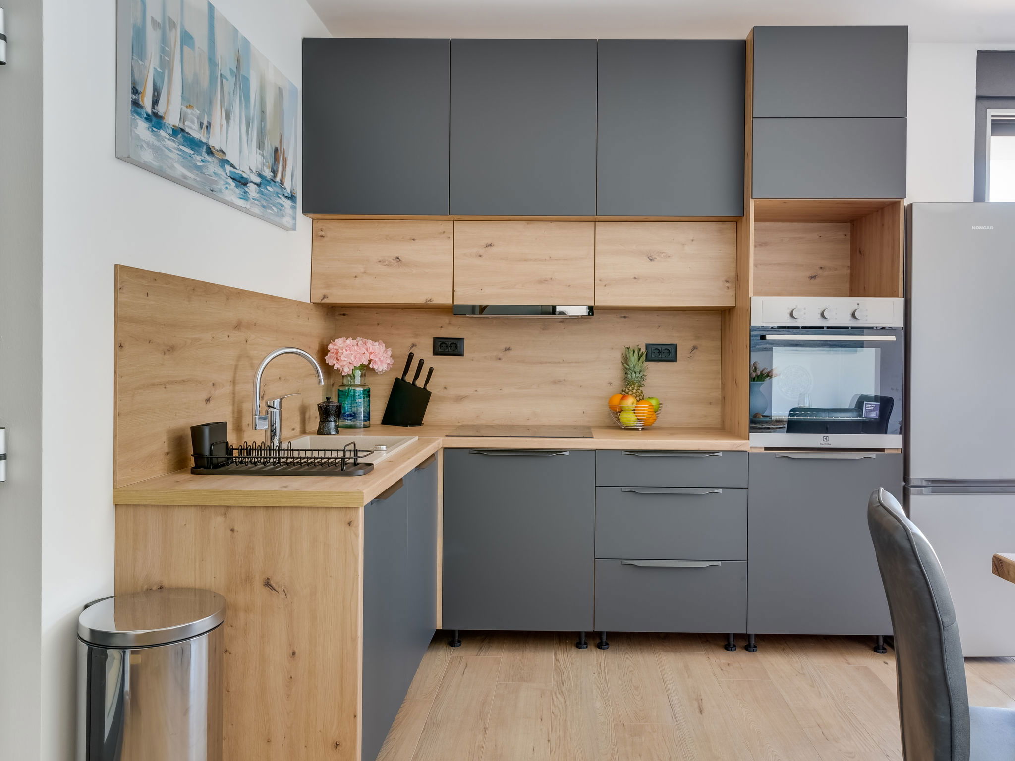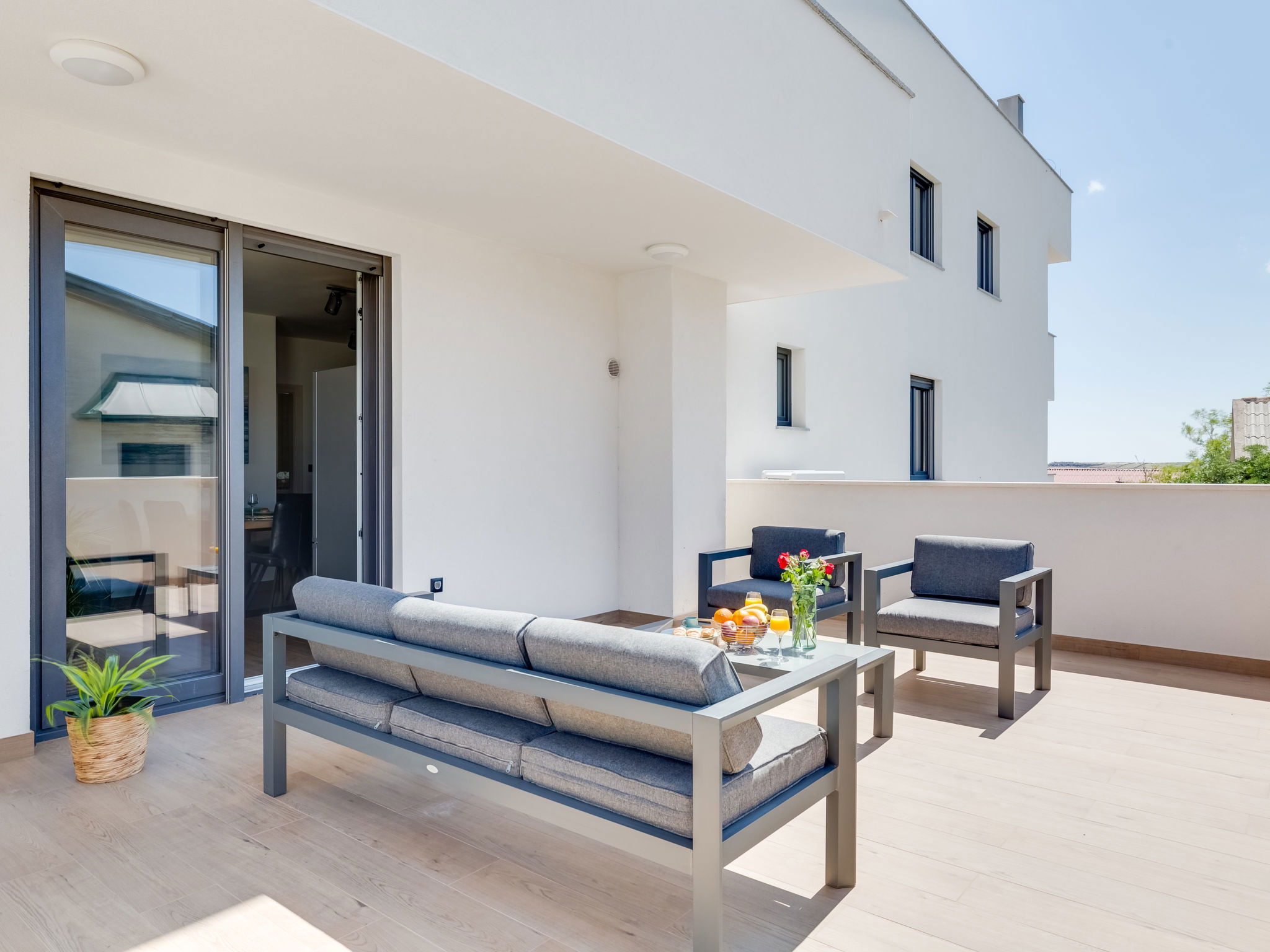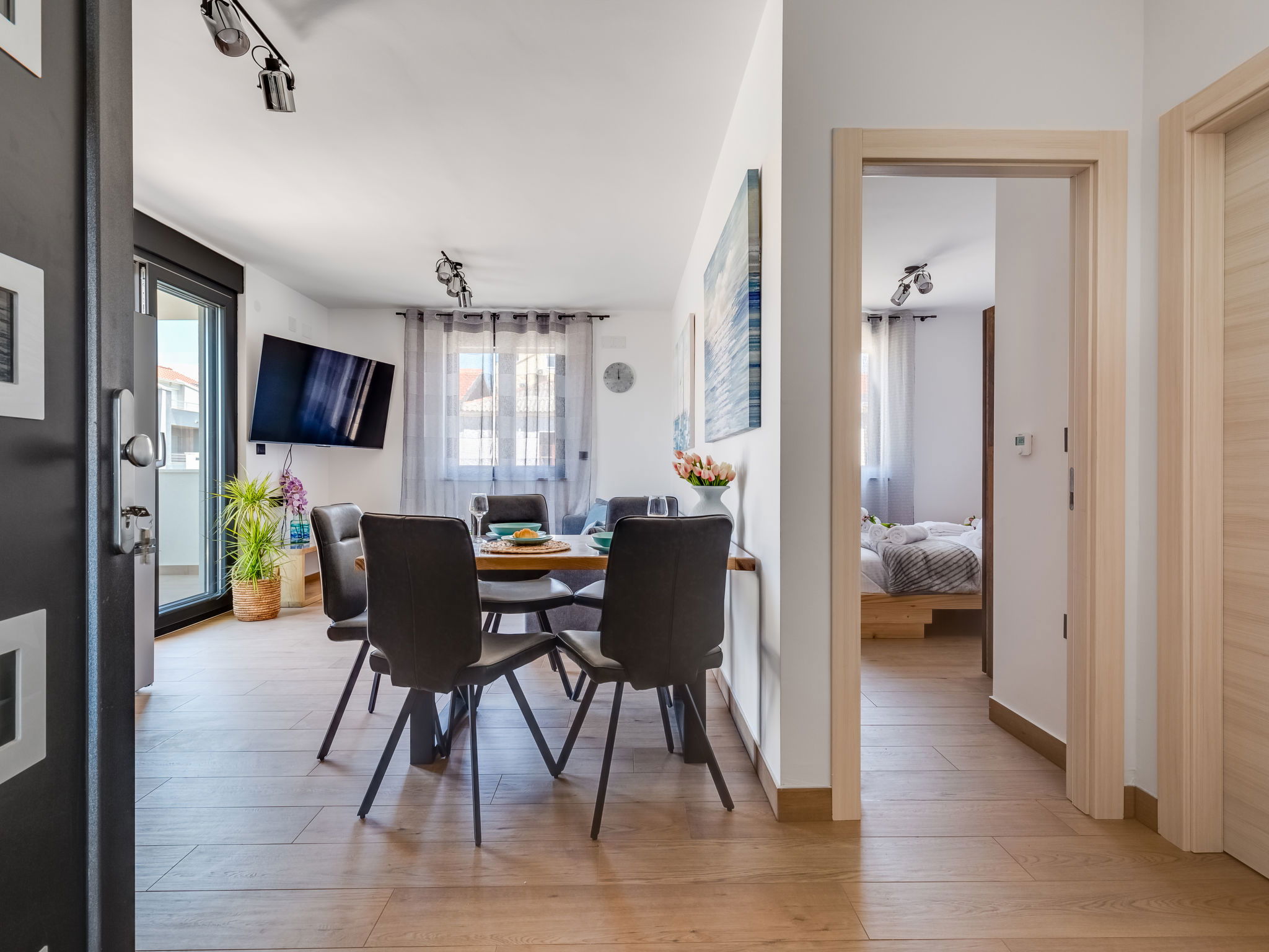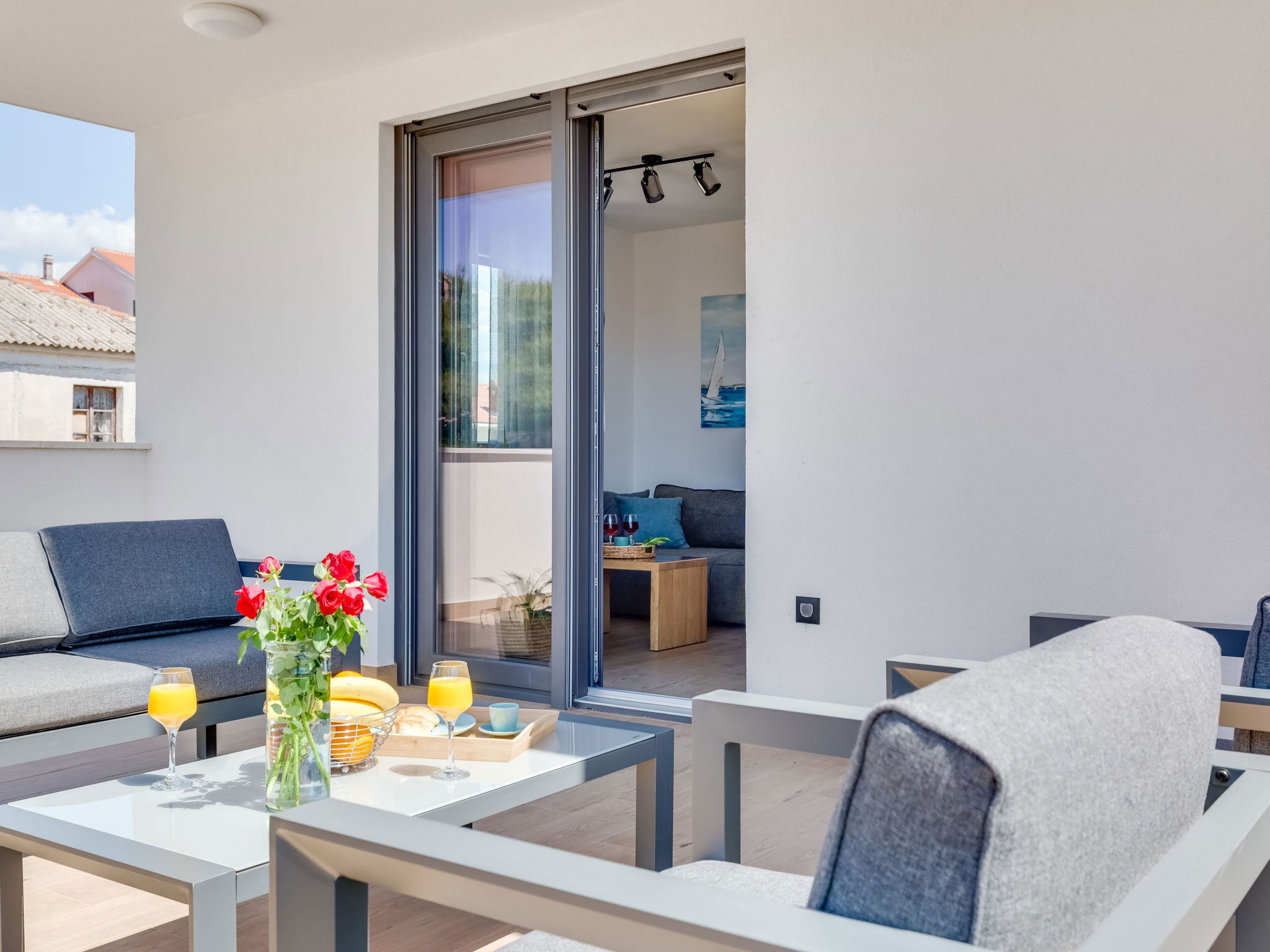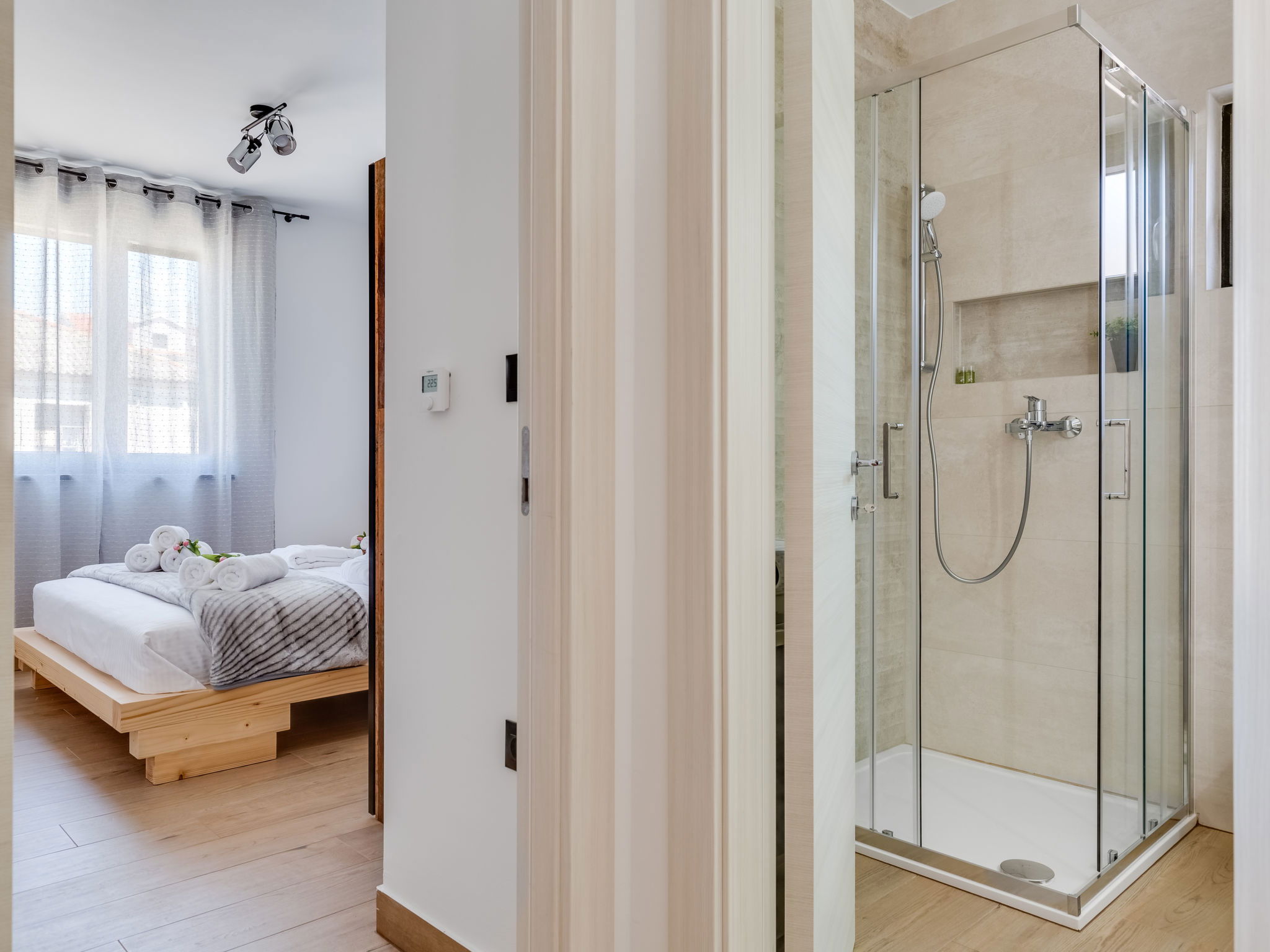 Appartement de 2 pièces 50 m2 au 1er étage, situation nord-est. Séjour/salle à manger 35 m2 avec 1 divan-lit double (140 cm, longueur 200 cm), TV (câblée) et chaînes de TV internationales (écran plat), air-conditionné. Sortie sur la terrasse. 1 chambre avec 1 grand-lit (160 cm, longueur 200 cm). Cuisine ouverte (four, lave-vaisselle, 4 plaques à induction, grille-pain, bouilloire électrique, congélateur, cafetière électrique). Douche/WC. Chauffage par le sol. Terrasse 30 m2, couverte. Meubles de terrasse. Vue éloignée sur la mer. A disposition: lave-linge, coffre-fort, sèche-cheveux. Internet (Connexion WIFI, gratuit). Maximum 1 animal/ chien autorisé.