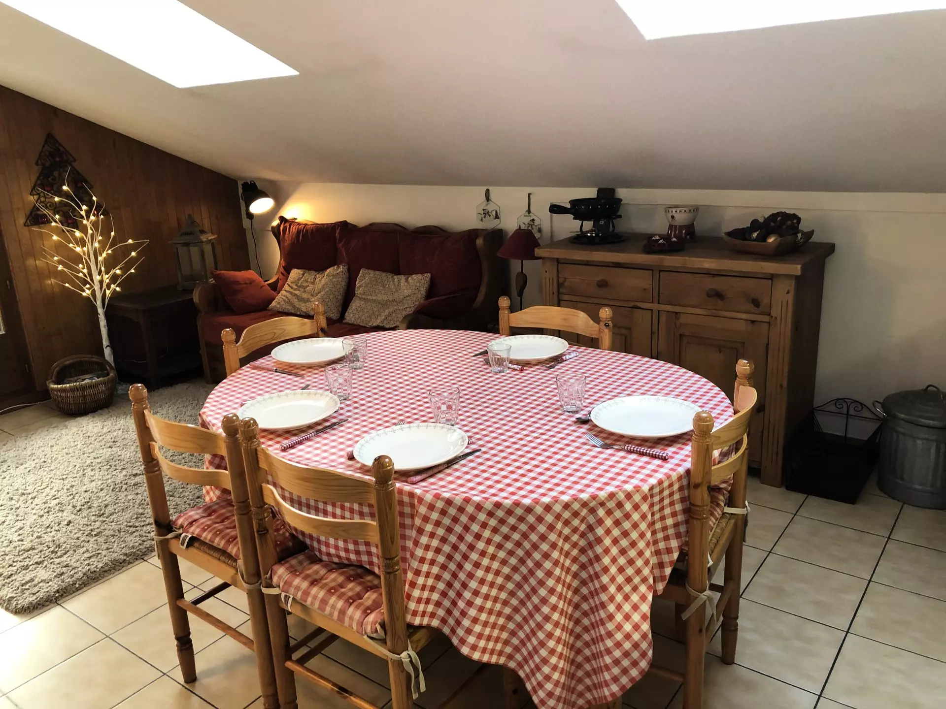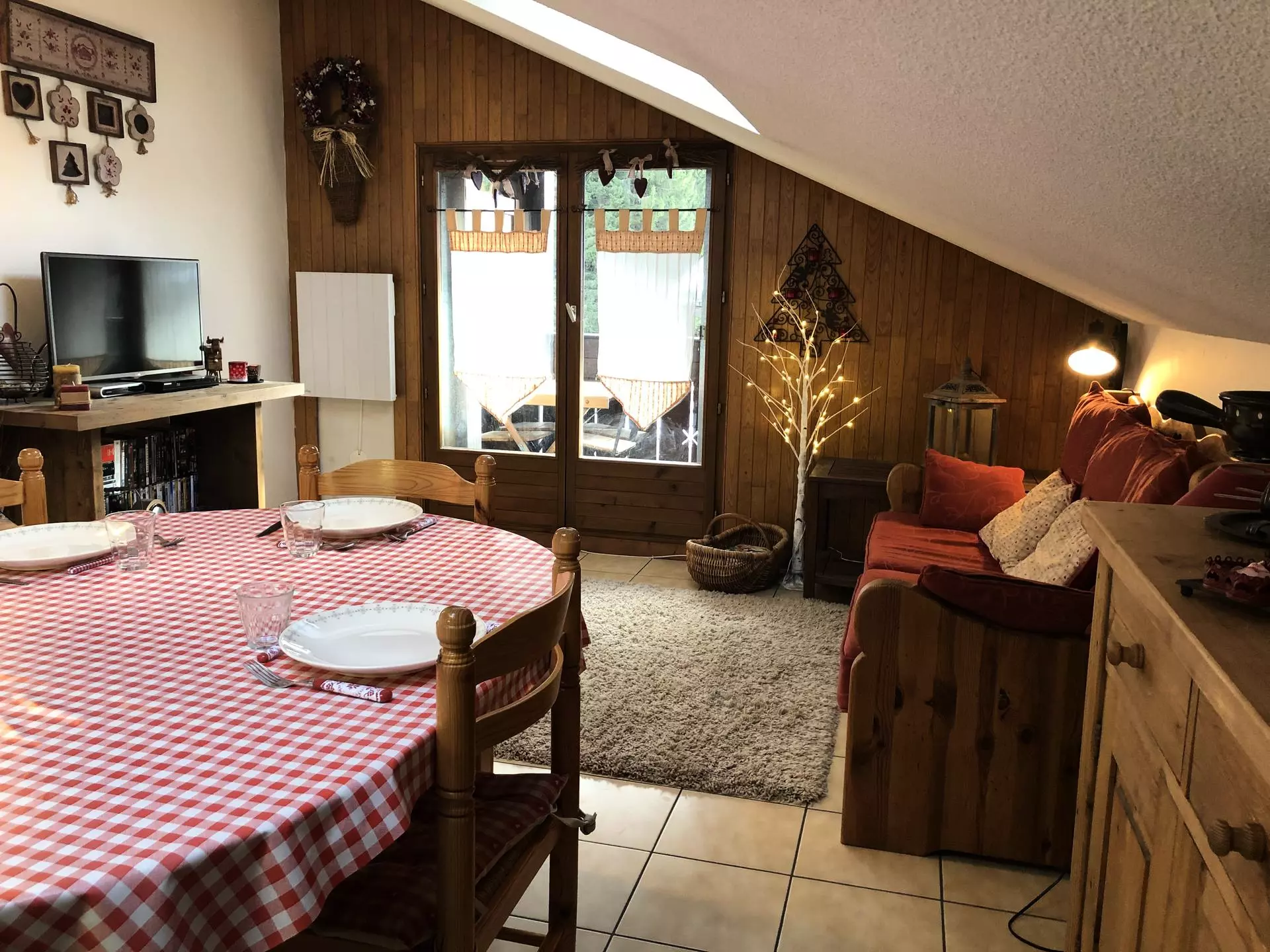 - Séjour avec canapé, télévision avec lecteur DVD (avec quelques DVD) et coin repas.