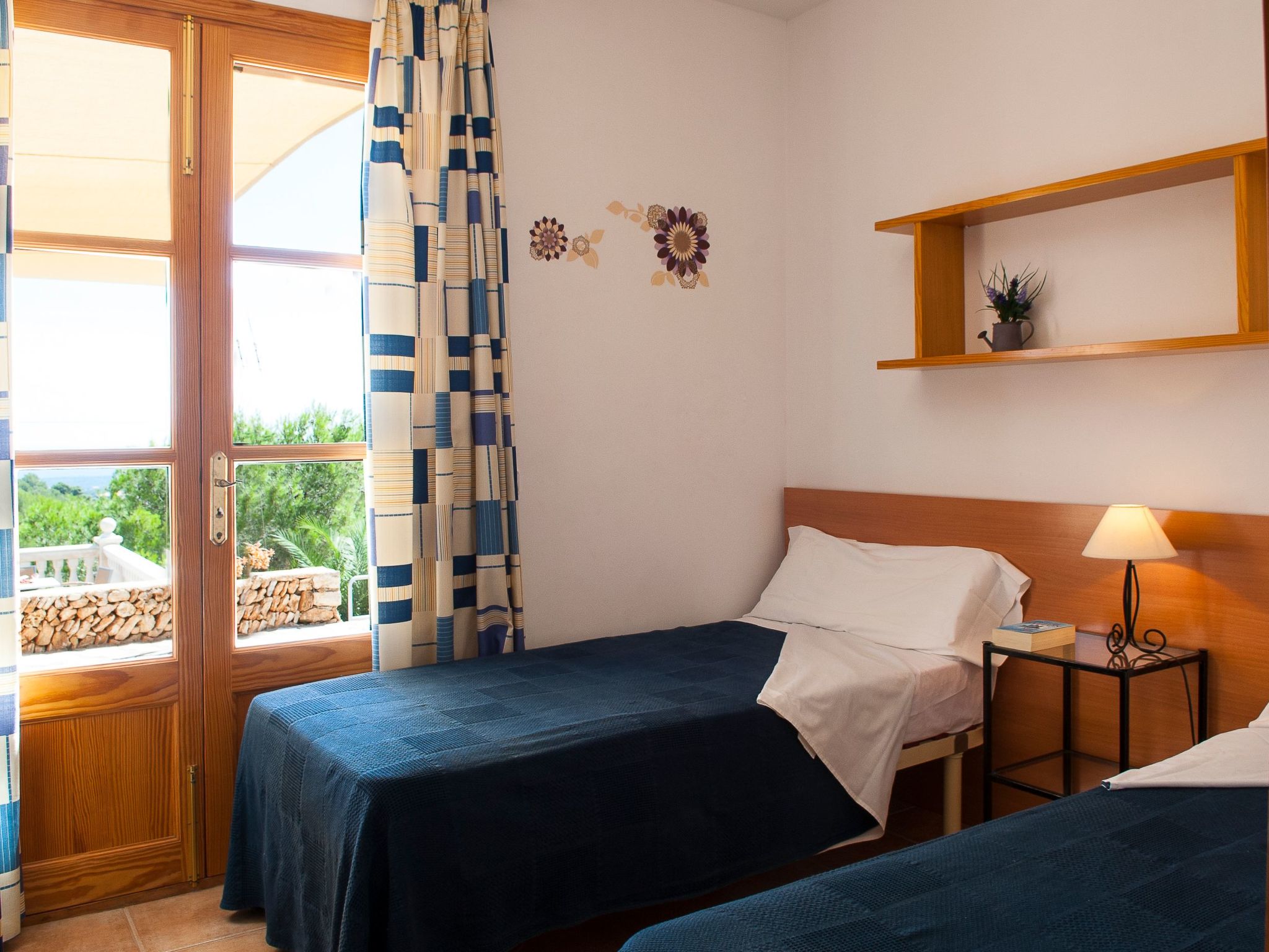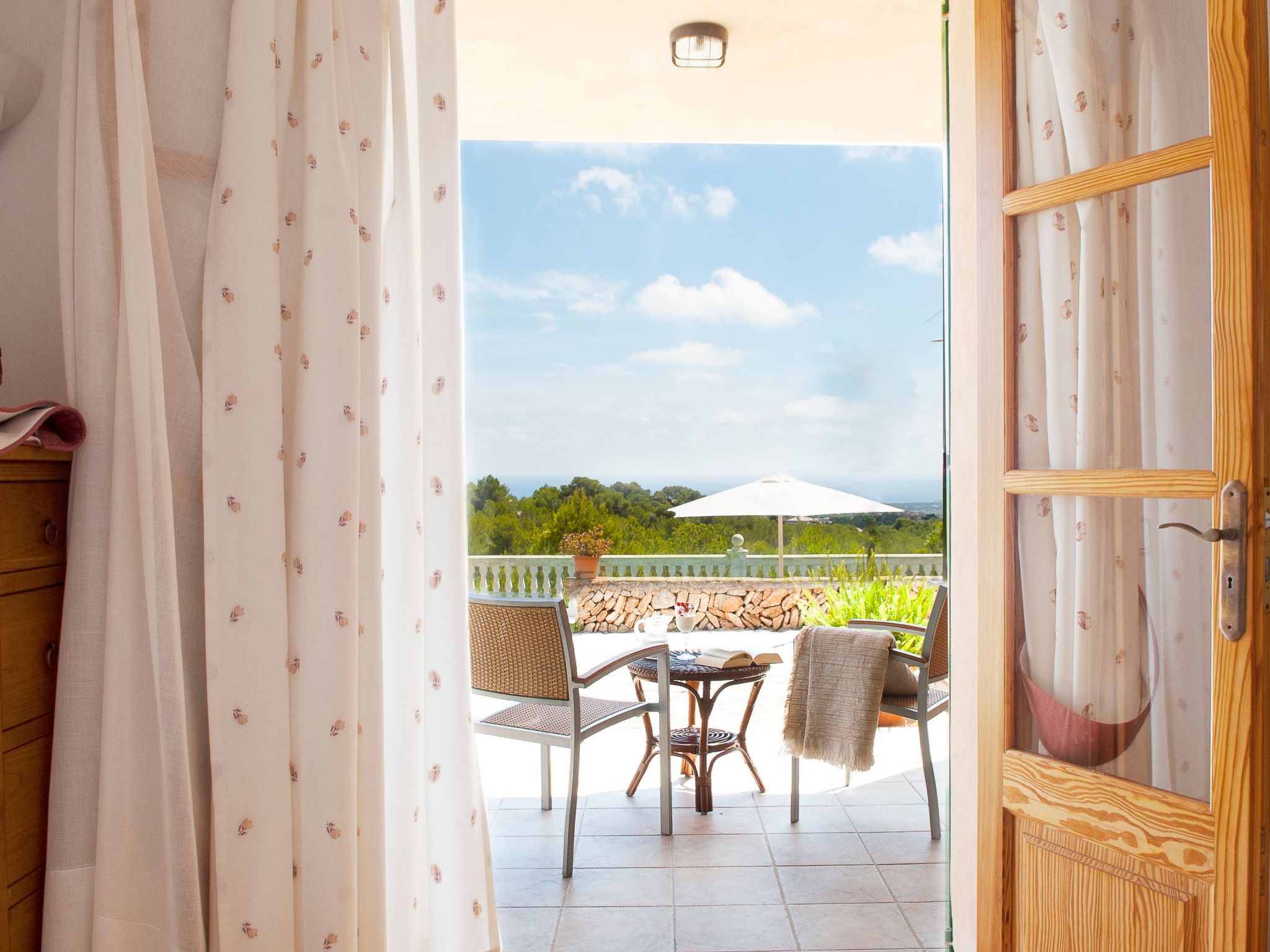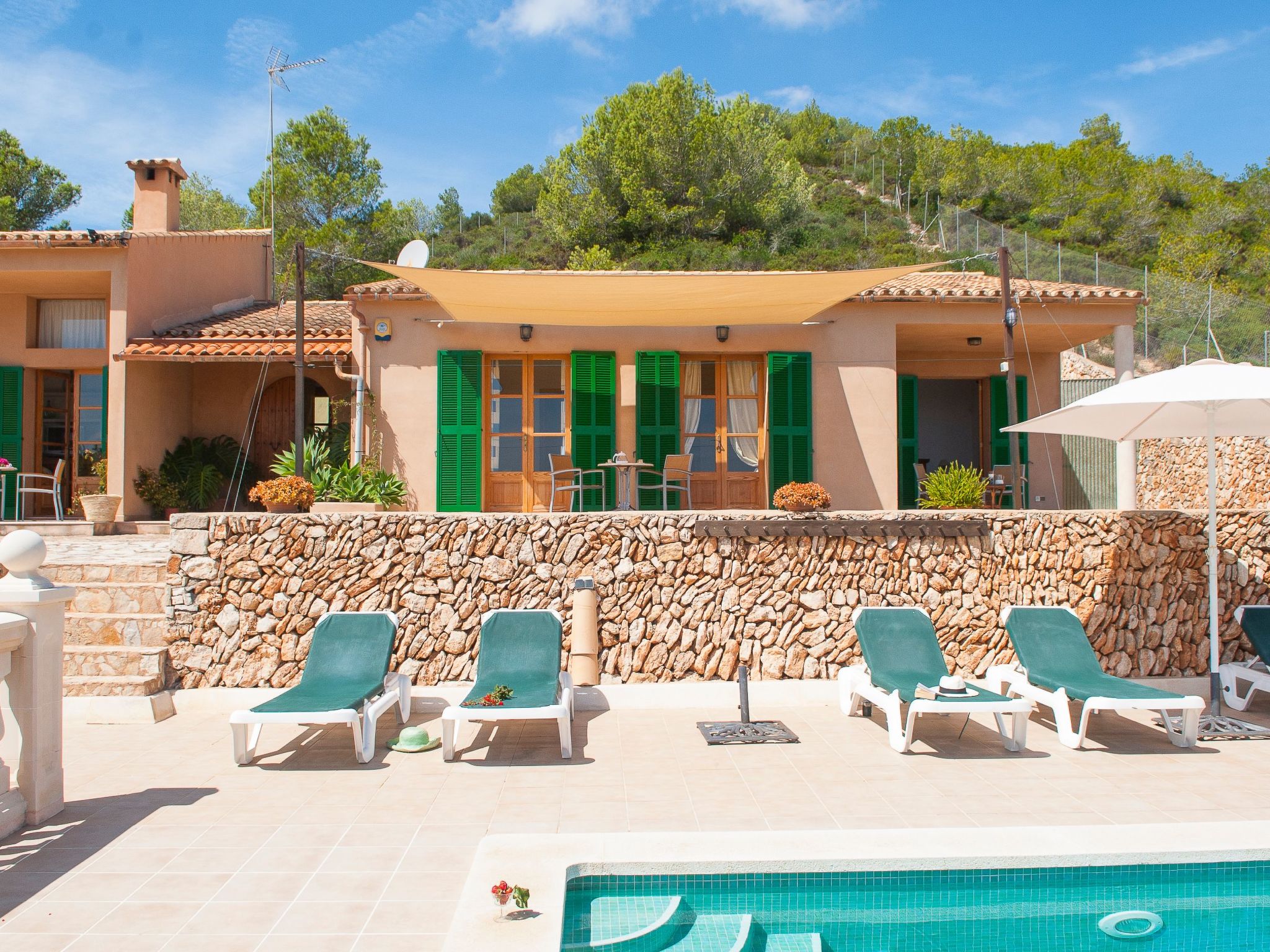 Finca Maria Magdalena Golf has breathtaking views over the south-east coast of Mallorca from all rooms. The entrance on the left leads into the bright living room with adjoining dining area and kitchen with breakfast bar. Large French doors open onto the partly covered terrace and the pool area. To the right of the entrance is the sleeping area with 3 bedrooms, one with a double bed and the other two with 2 single beds. From all bedrooms you can reach the terrace and the outside area via French windows. There are 2 bathrooms, one with a bathtub and the other with a shower.