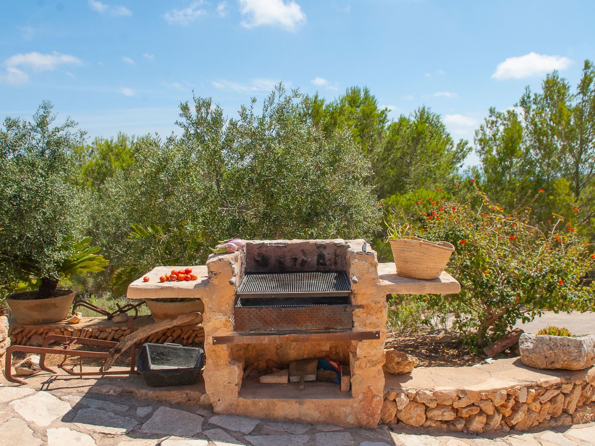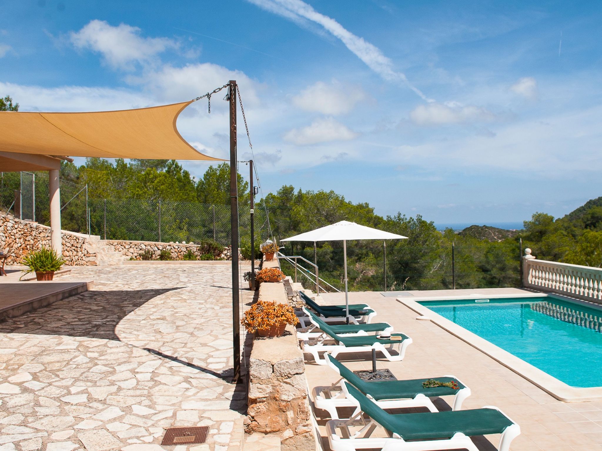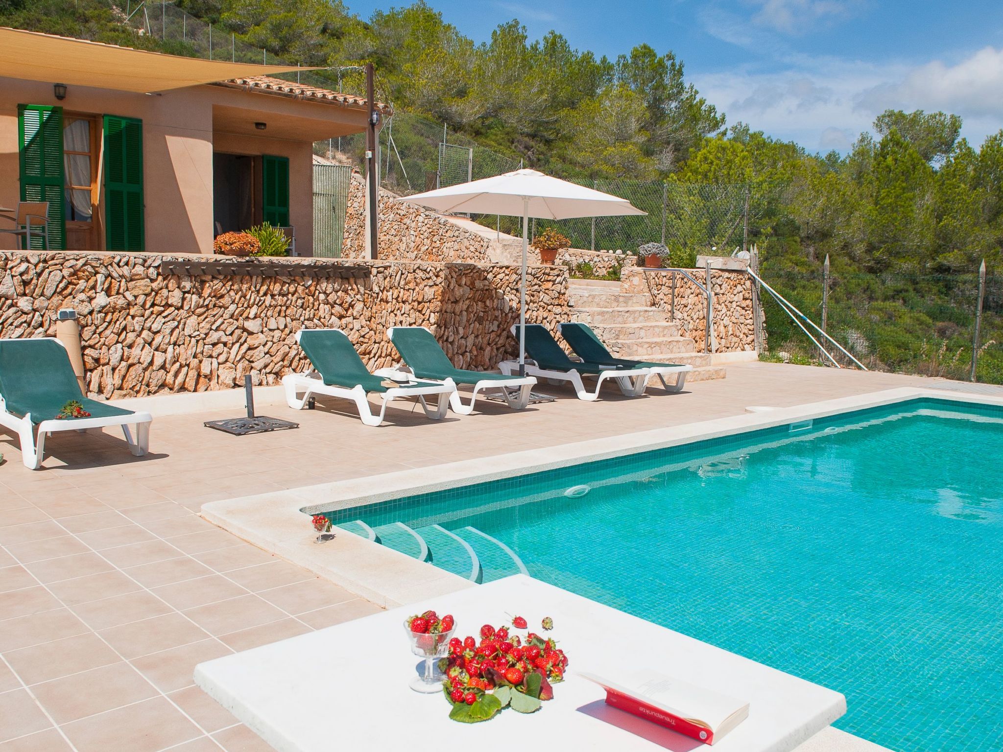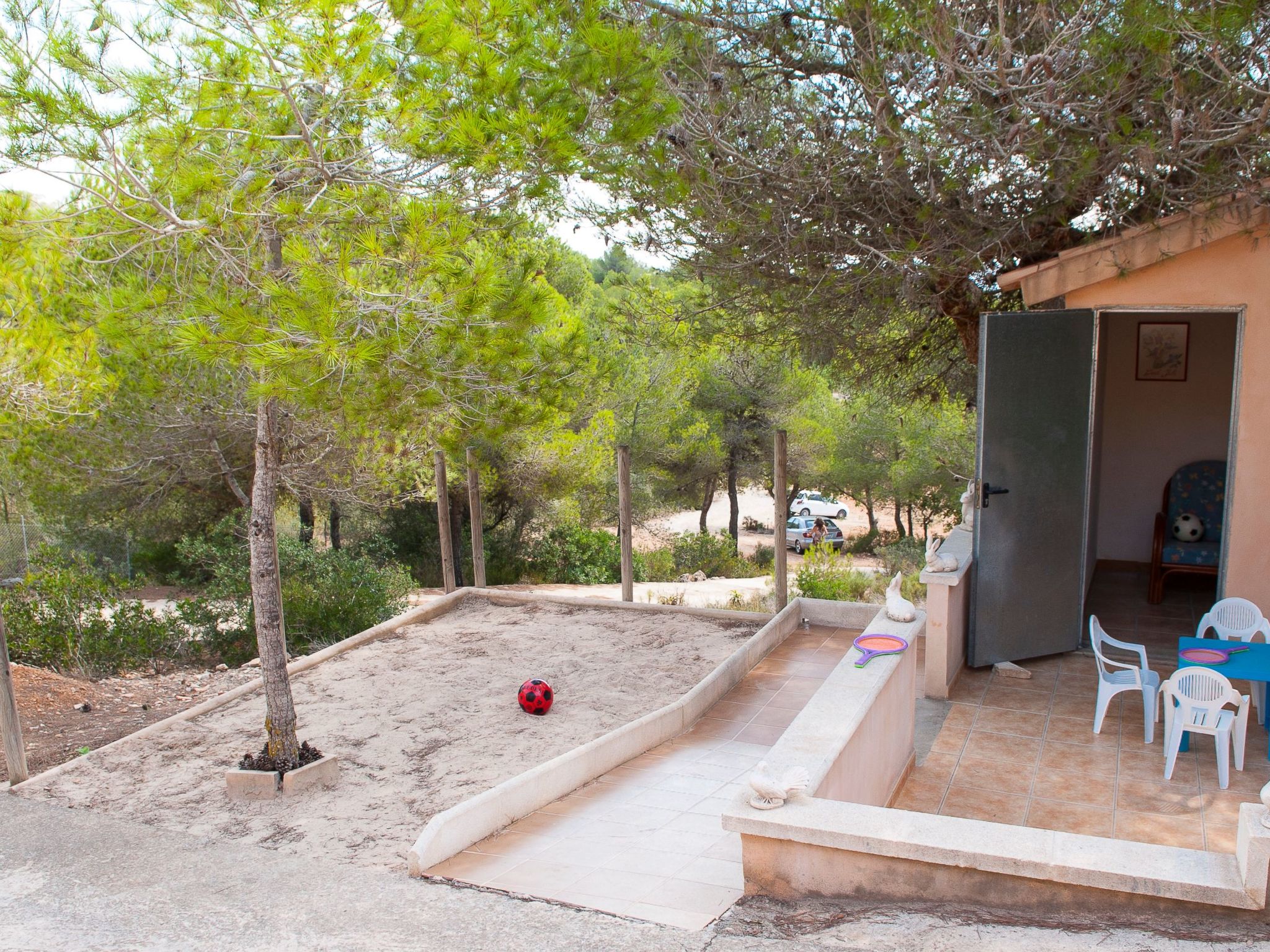 A partly covered terrace stretches the entire length of the house. An inviting external dining area enchants with its panoramic views, as does the pool (9 m x 5 m, min. depth 1.10 m, max. 1.80 m) with children's slide. There is a shady pergola by the pool area. There is a playhouse and a sandpit under the shady pine trees. A table tennis table is available for lots of fun and exercise.