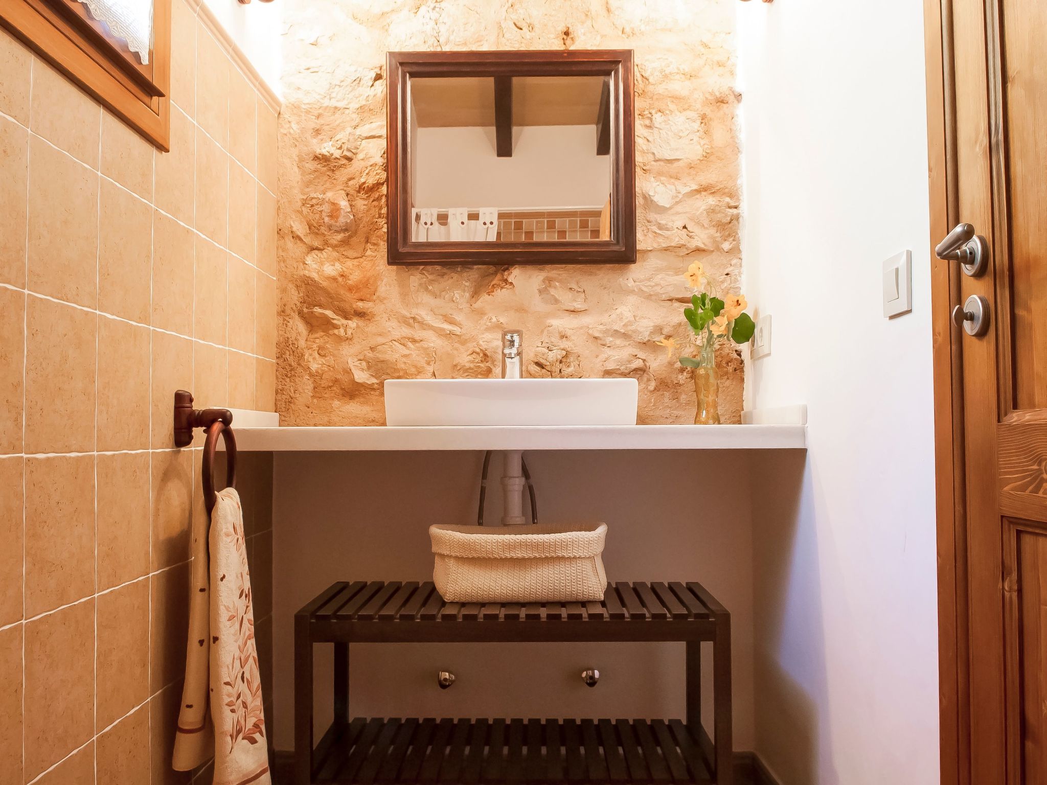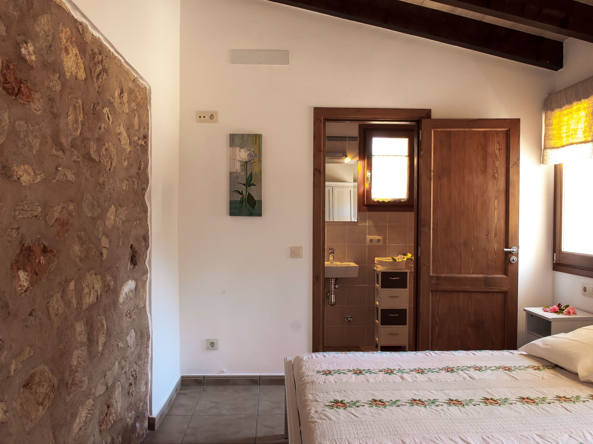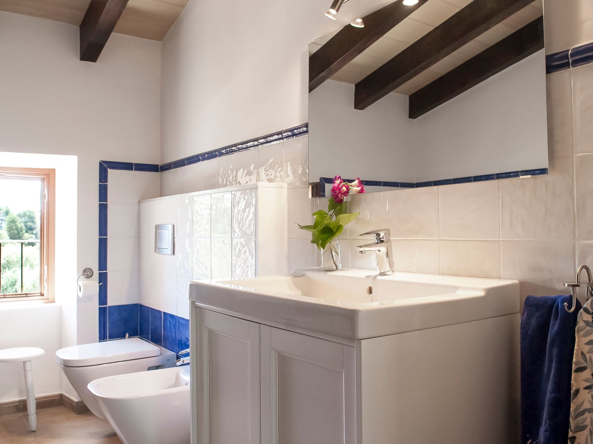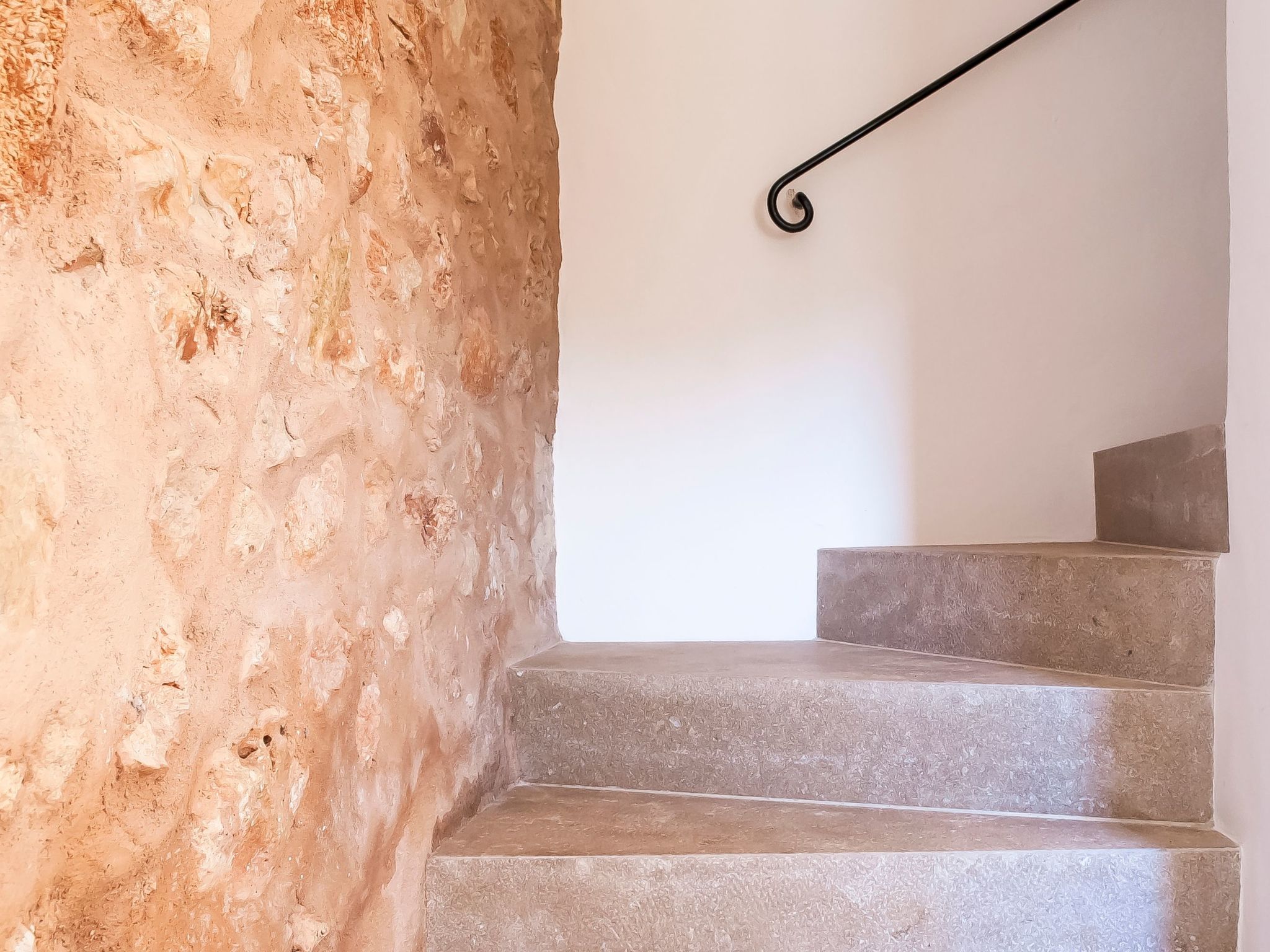 Salas Nou is a beautifully designed country house with plenty of natural light that has been completely renovated. The original house was built more than 100 years ago. It has the charm of the typical Mallorcan country house with a wonderful mix of rustic details such as natural stone walls, high ceilings with wooden beams combined with comfortable, modern furniture. From the entrance you enter directly into the living room with a wood-burning stove. The large, open-plan kitchen/dining area with a beautiful wooden dining table is spacious, light-flooded and well-equipped. From here, large glass doors lead out onto the terrace in front of the house. From the kitchen there is access to a double bedroom which has an en-suite bathroom with shower. On the other side of the house there is a bedroom with an en-suite shower room. A guest WC is located near the entrance. The upper floor has a double and a twin bedroom with views of the pool and the surrounding area. These two bedrooms share a bathroom with bath and separate shower.