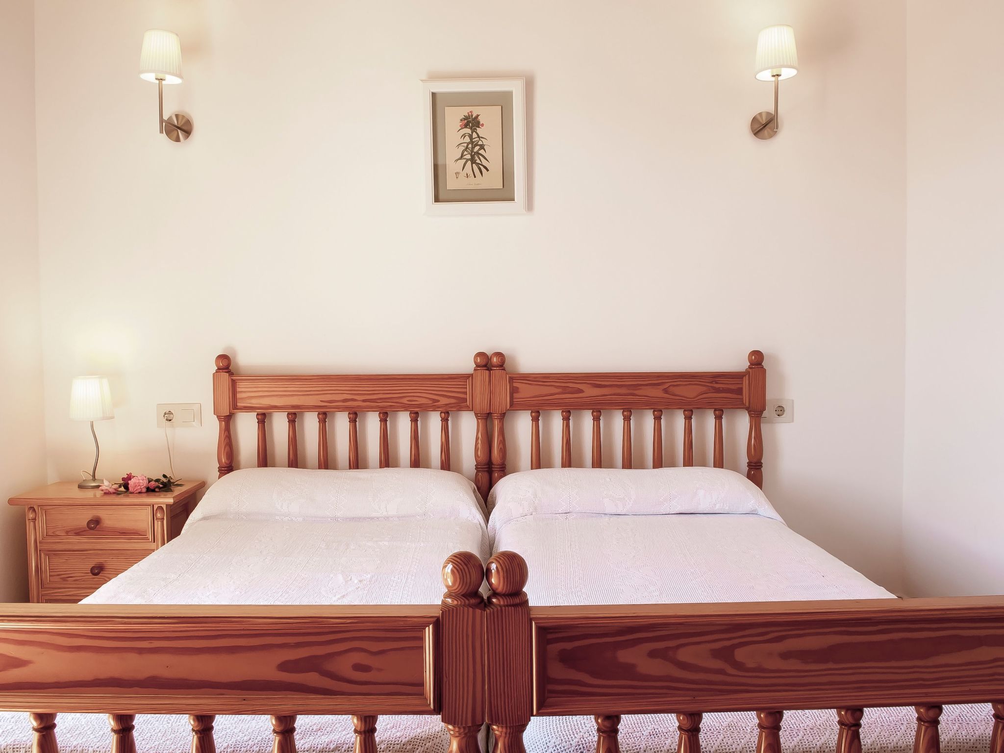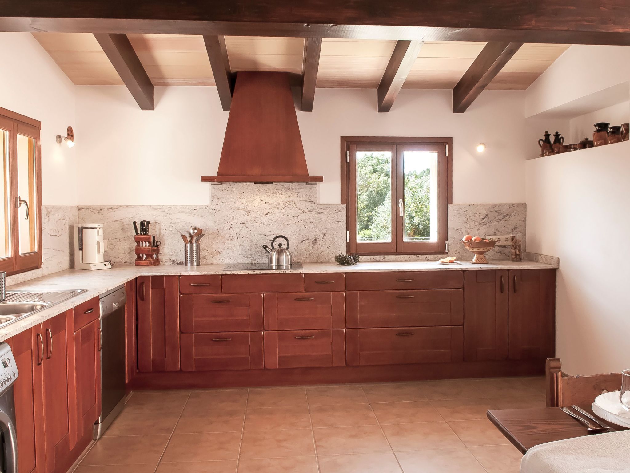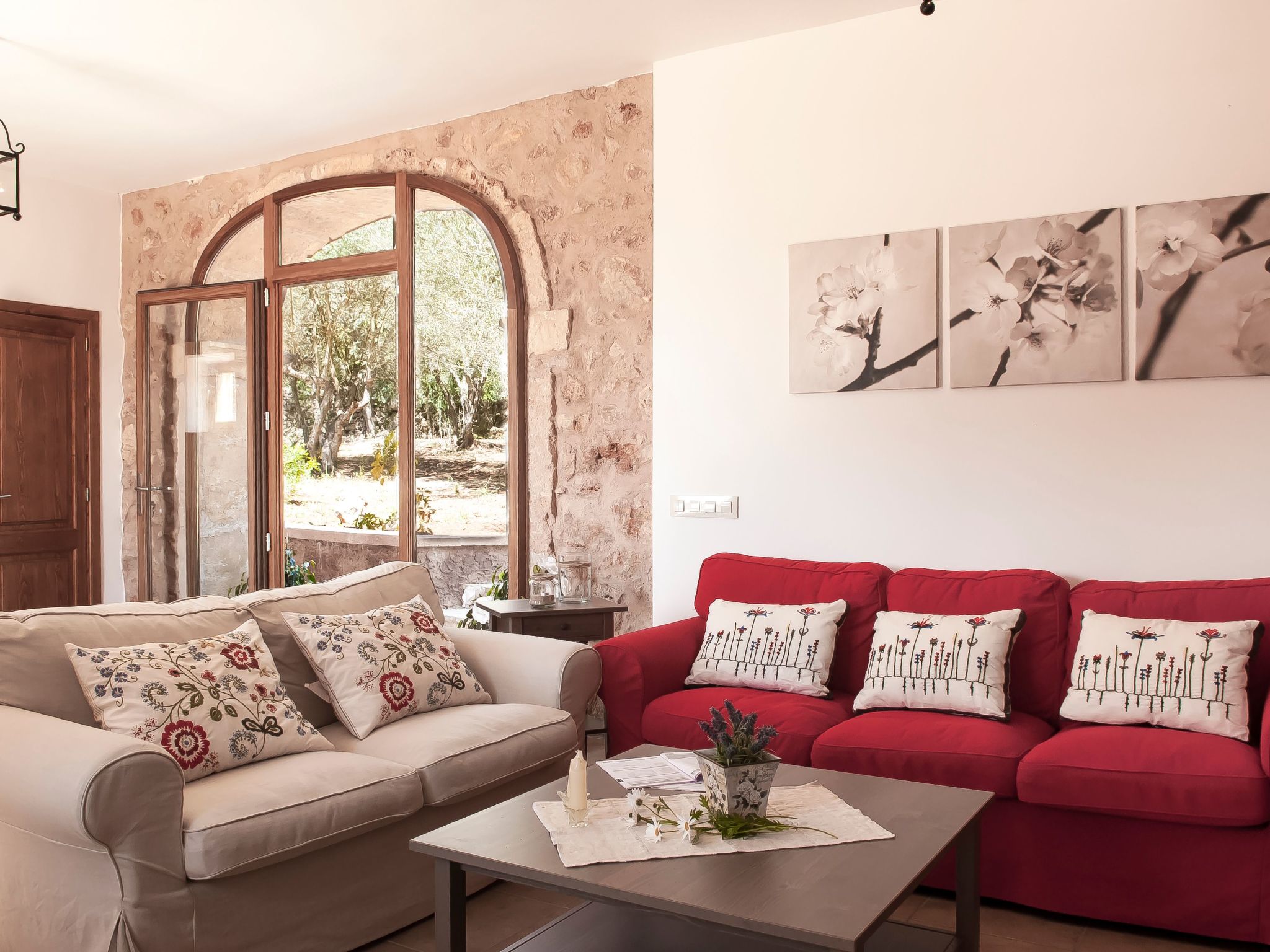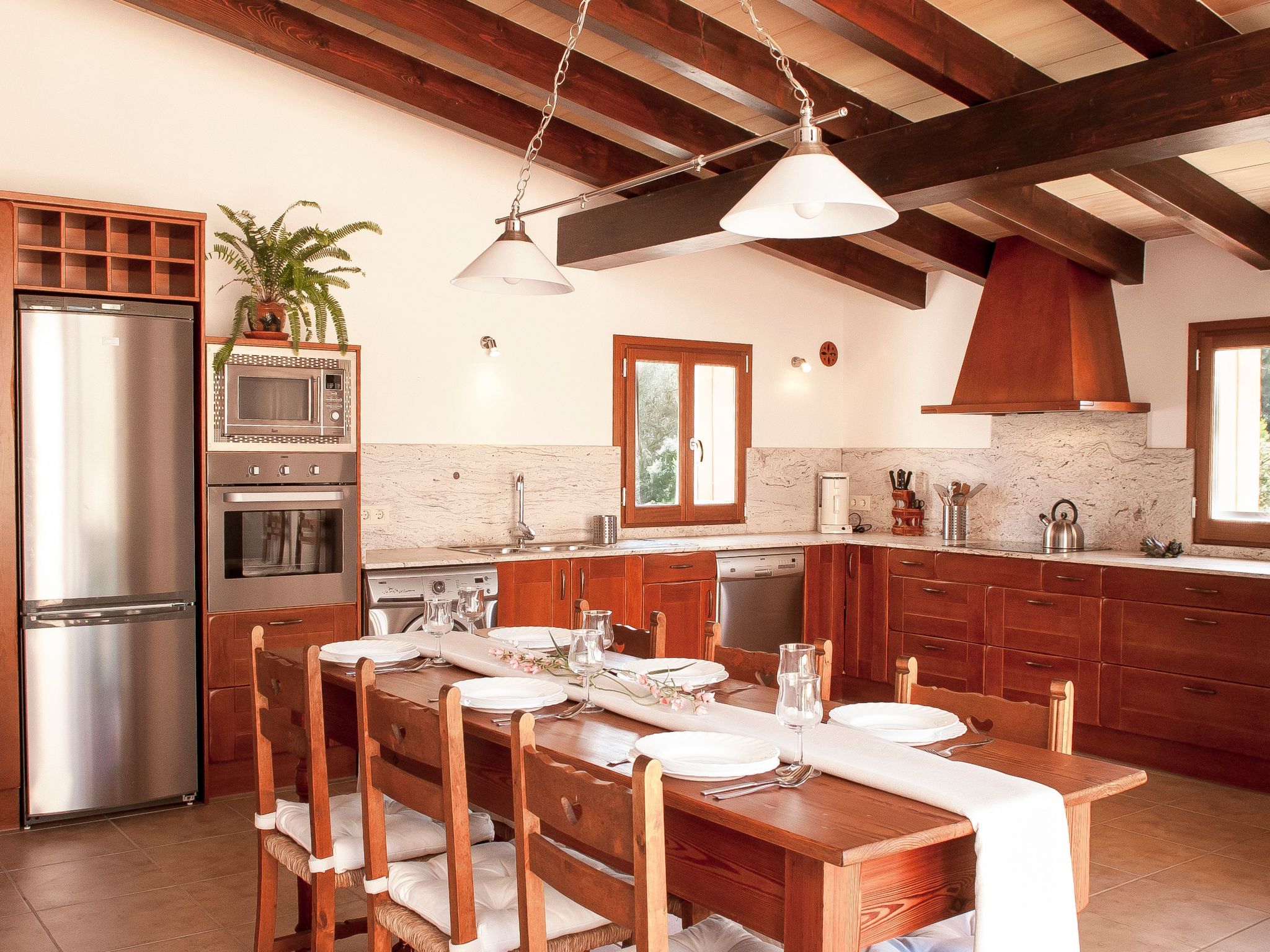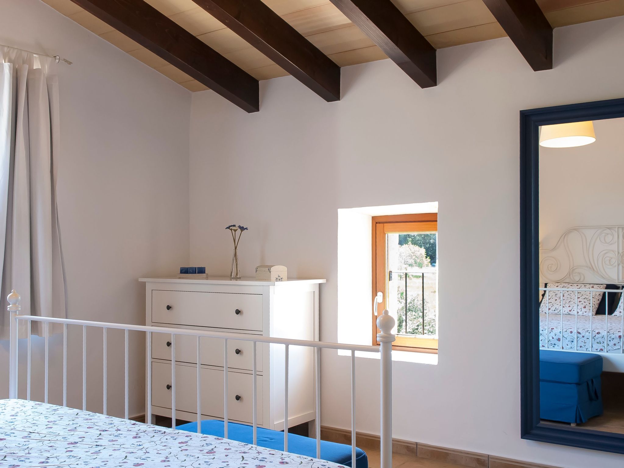Salas Nou is a beautifully designed country house with plenty of natural light that has been completely renovated. The original house was built more than 100 years ago. It has the charm of the typical Mallorcan country house with a wonderful mix of rustic details such as natural stone walls, high ceilings with wooden beams combined with comfortable, modern furniture. From the entrance you enter directly into the living room with a wood-burning stove. The large, open-plan kitchen/dining area with a beautiful wooden dining table is spacious, light-flooded and well-equipped. From here, large glass doors lead out onto the terrace in front of the house. From the kitchen there is access to a double bedroom which has an en-suite bathroom with shower. On the other side of the house there is a bedroom with an en-suite shower room. A guest WC is located near the entrance. The upper floor has a double and a twin bedroom with views of the pool and the surrounding area. These two bedrooms share a bathroom with bath and separate shower.