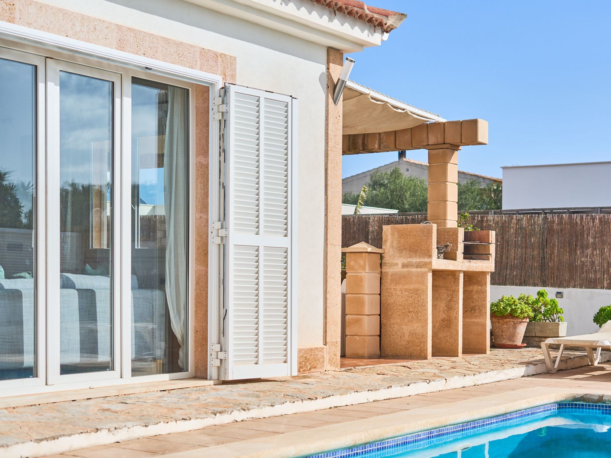La maison est entièrement clôturée. Pendant les longues journées d'été, vous pouvez vous détendre au soleil ou profiter d'un bain rafraîchissant dans la piscine. Sur la terrasse, il y a un coin repas pour savourer de délicieux repas en plein air ; un barbecue en brique est également disponible. Une piscine privée avec des chaises longues est également à votre disposition.