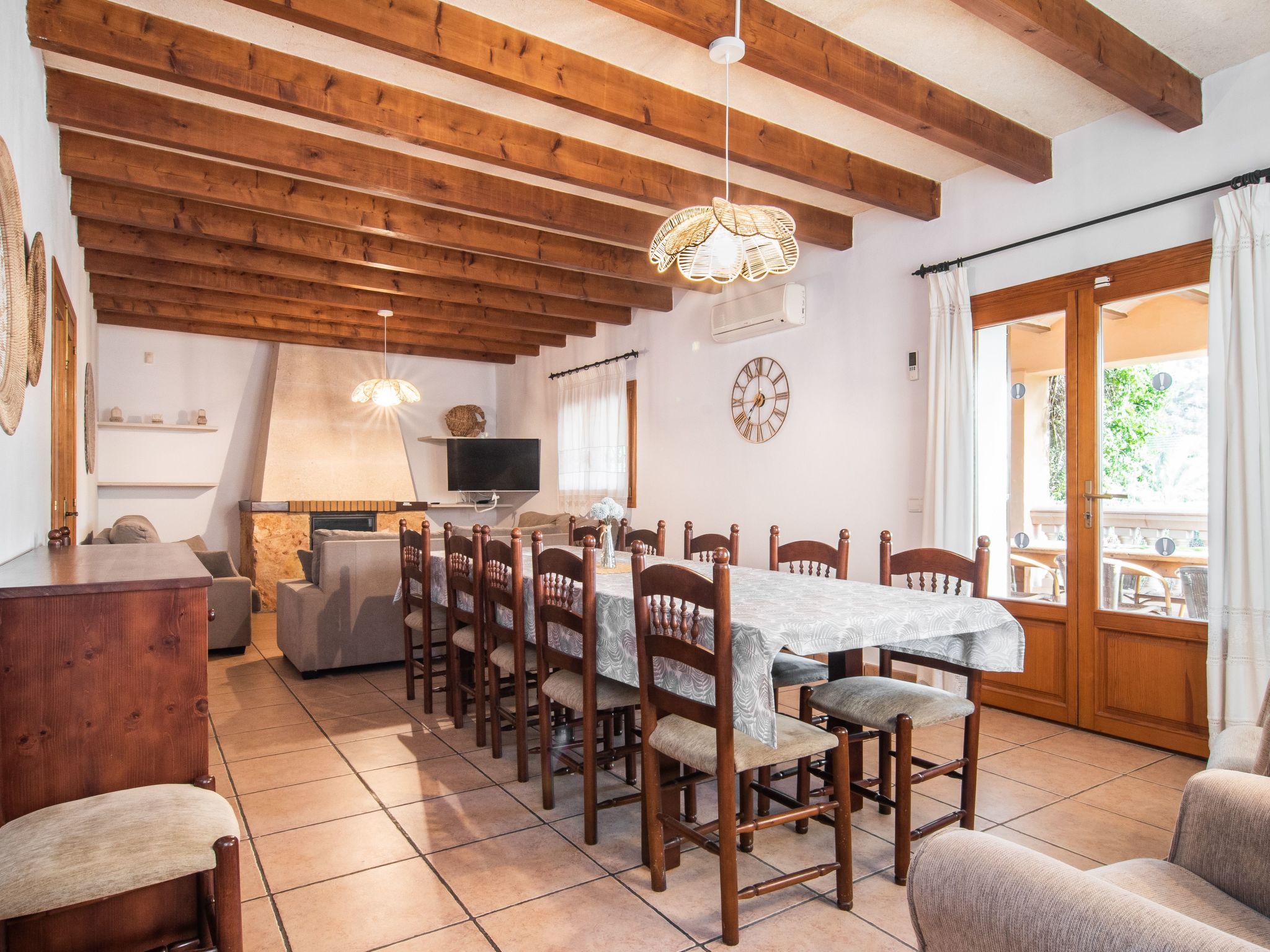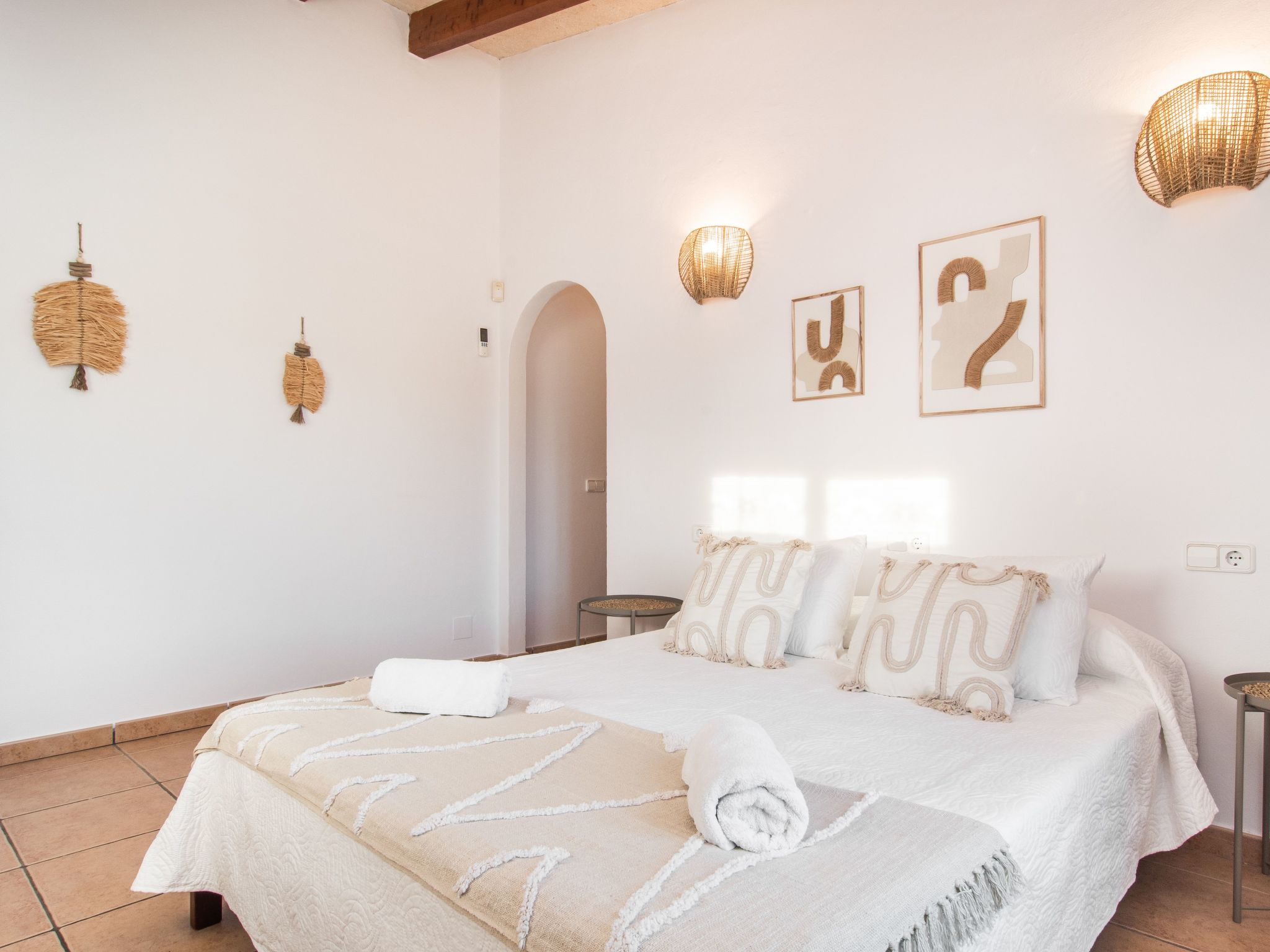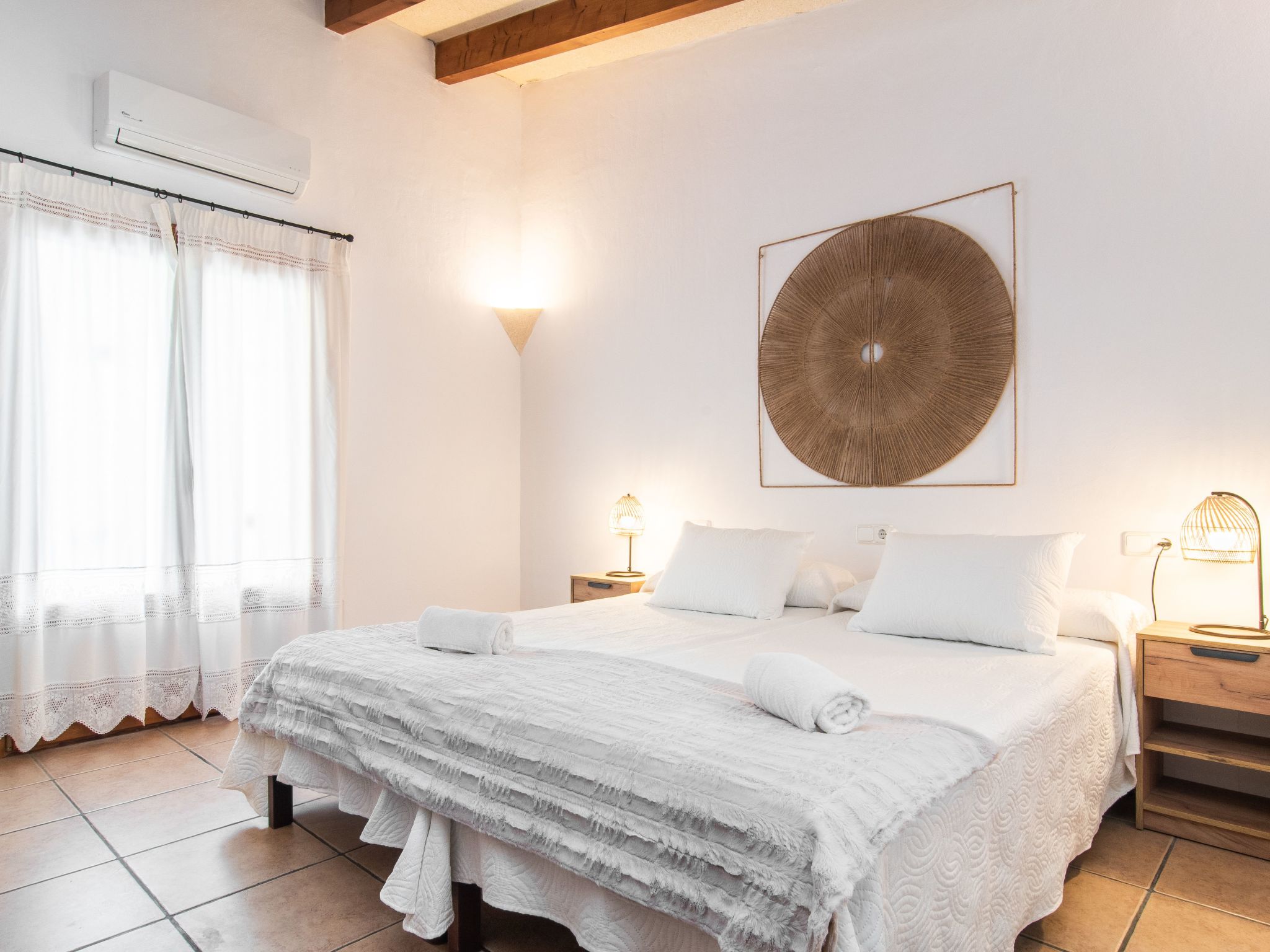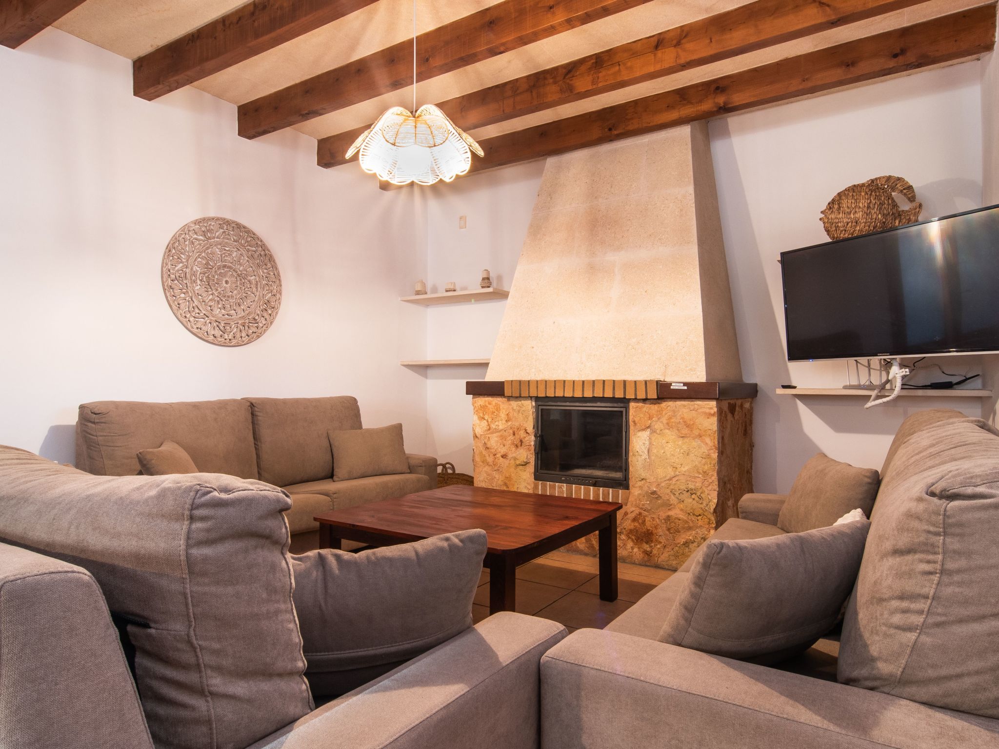 The Peris house is an attractive Mallorcan-style country house with large rooms. The terraces invite you to relax and enjoy the marvellous views over the countryside. From the entrance area there is access to a cosy living/dining area with comfortable sofas, a fireplace and a large wooden table for 10 people. From here you also have access to the covered terrace with dining area and the large kitchen, which has a pantry and a breakfast nook. Next to the dining area is a bedroom with two single beds and a shower room, which also has a washing machine and tumble dryer. On the other side of the living room there are two further bedrooms, one with two single beds and one with a double bed and access to the terrace with views over the countryside. These two bedrooms share a bathroom. From the entrance area, steps lead to the upper floor with two further bedrooms, one with a double bed and en suite bathroom, the other with two single beds and en suite bathroom. Both bedrooms share a terrace with views of the garden and pool area as well as the mountains in the distance.