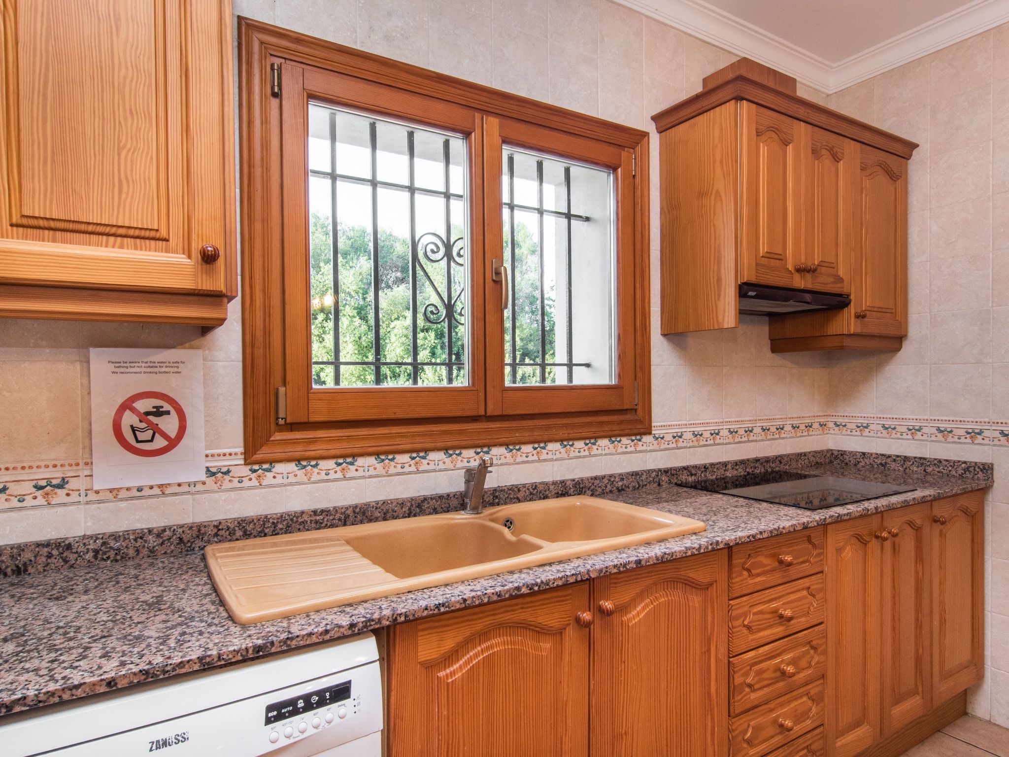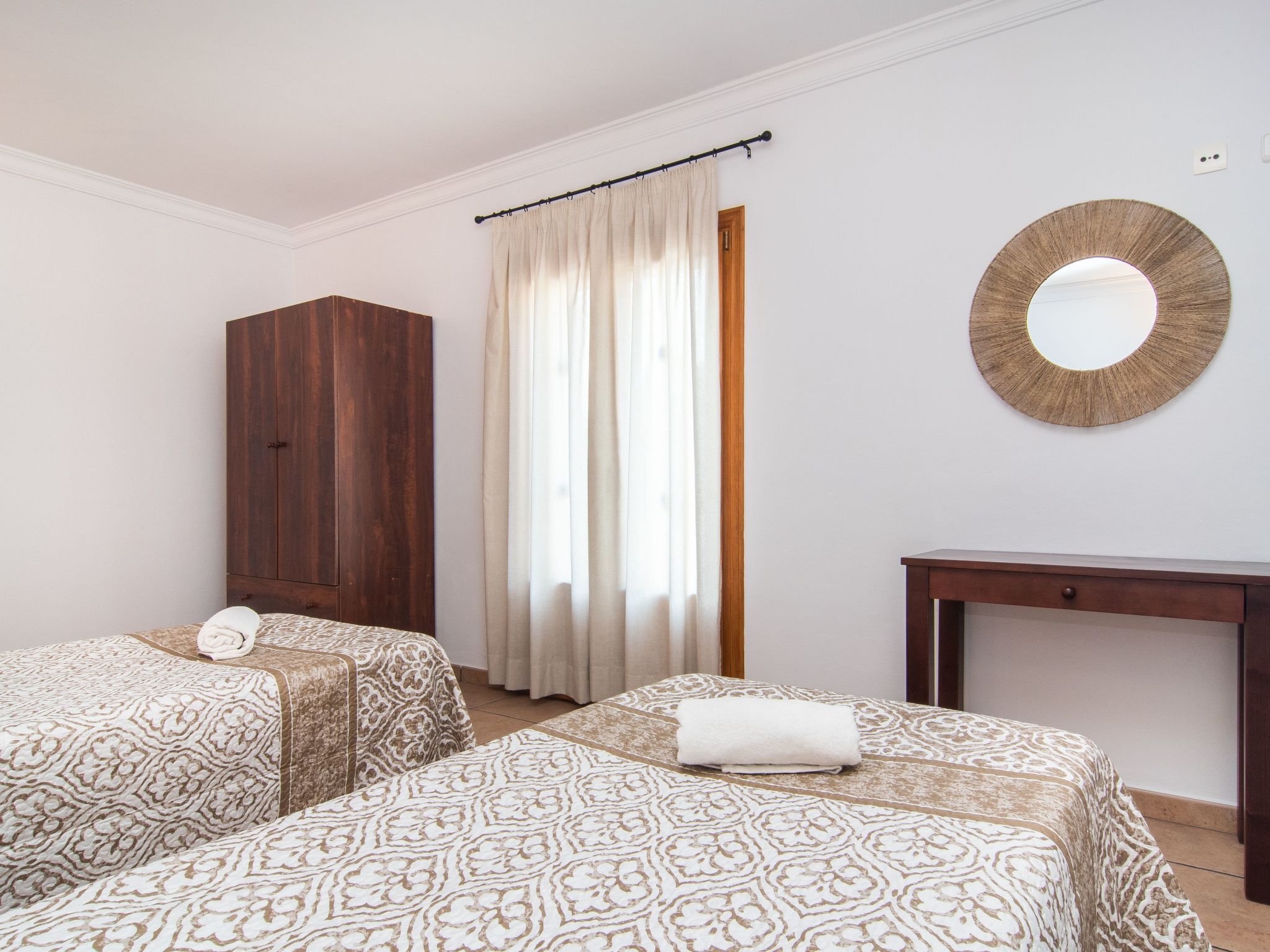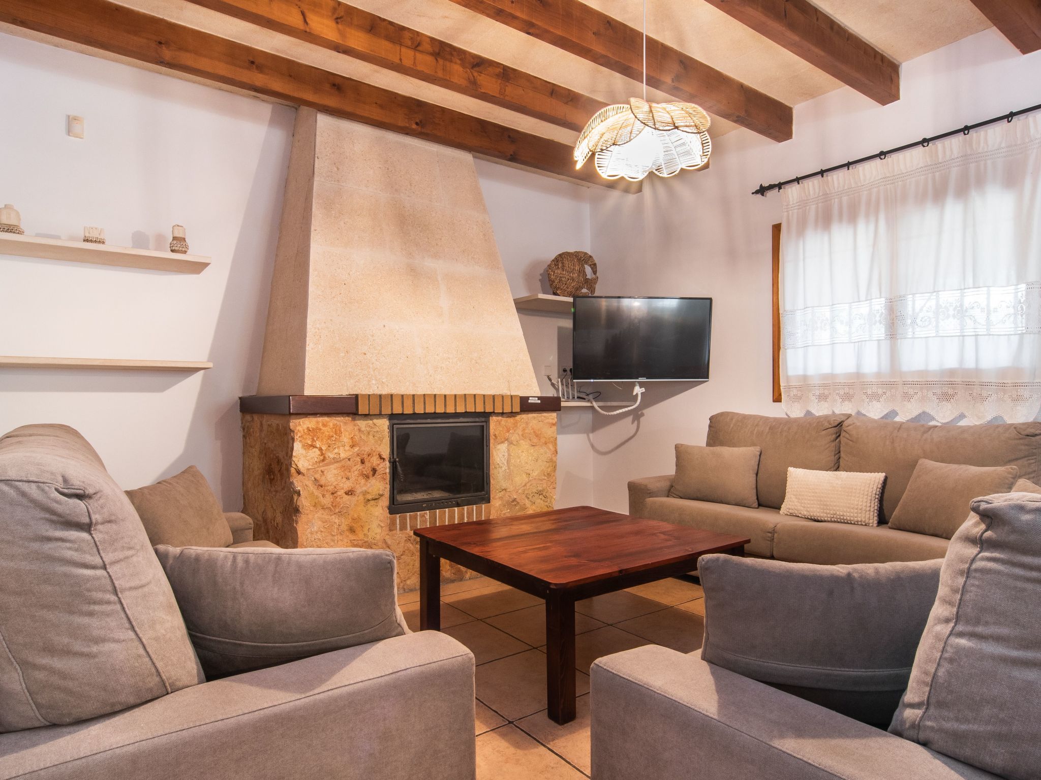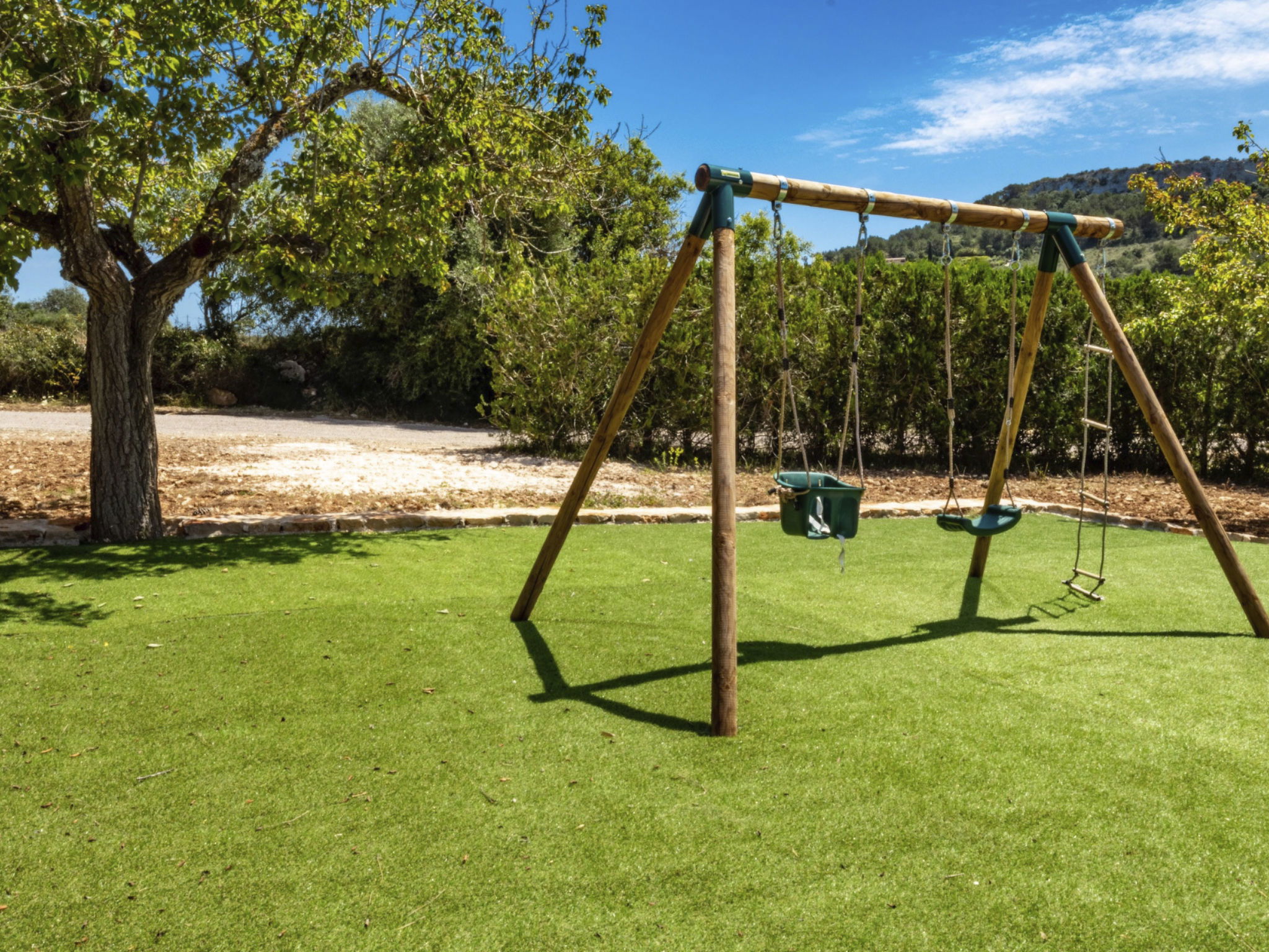 The Peris house is an attractive Mallorcan-style country house with large rooms. The terraces invite you to relax and enjoy the marvellous views over the countryside. From the entrance area there is access to a cosy living/dining area with comfortable sofas, a fireplace and a large wooden table for 10 people. From here you also have access to the covered terrace with dining area and the large kitchen, which has a pantry and a breakfast nook. Next to the dining area is a bedroom with two single beds and a shower room, which also has a washing machine and tumble dryer. On the other side of the living room there are two further bedrooms, one with two single beds and one with a double bed and access to the terrace with views over the countryside. These two bedrooms share a bathroom. From the entrance area, steps lead to the upper floor with two further bedrooms, one with a double bed and en suite bathroom, the other with two single beds and en suite bathroom. Both bedrooms share a terrace with views of the garden and pool area as well as the mountains in the distance.
