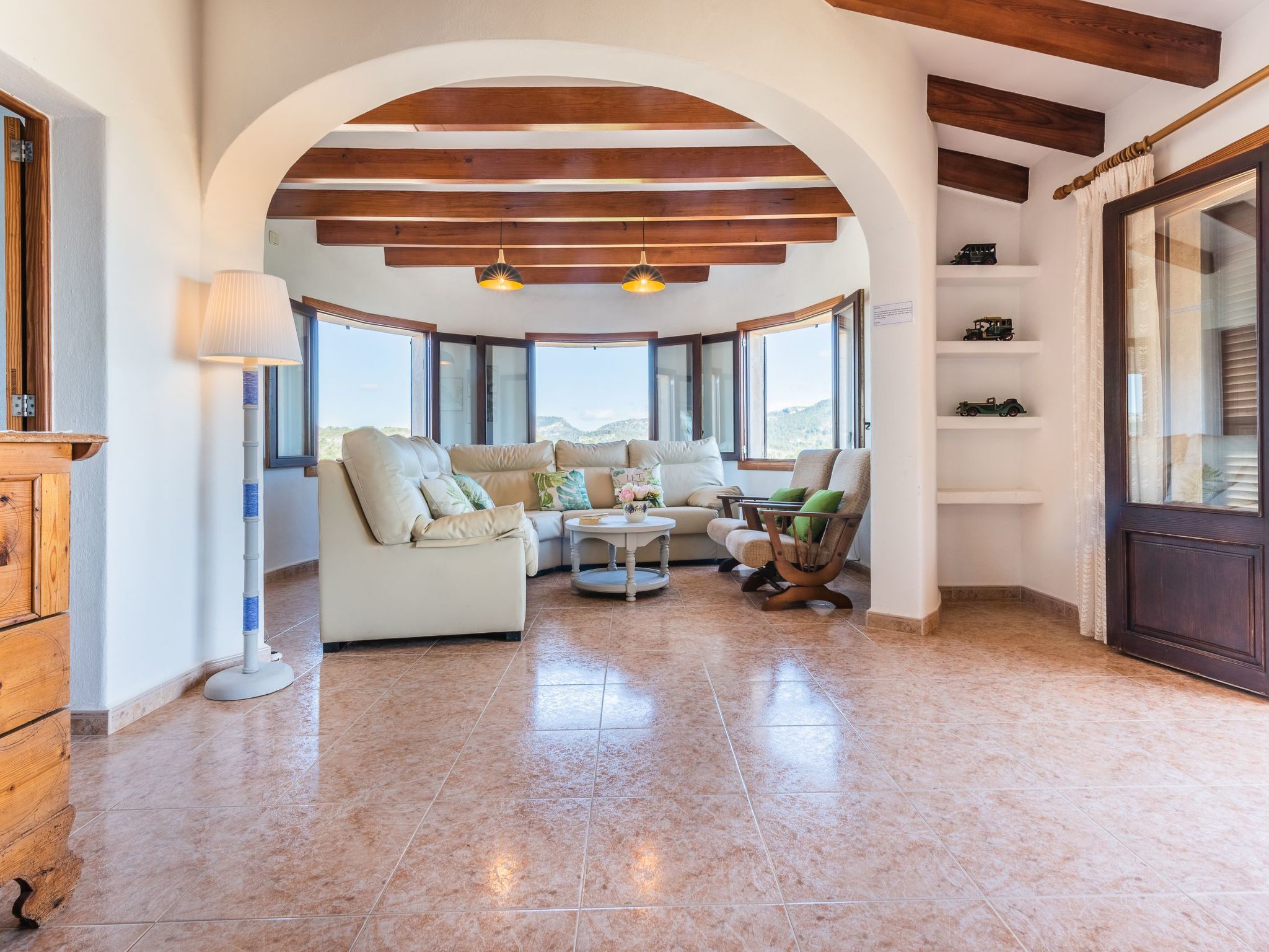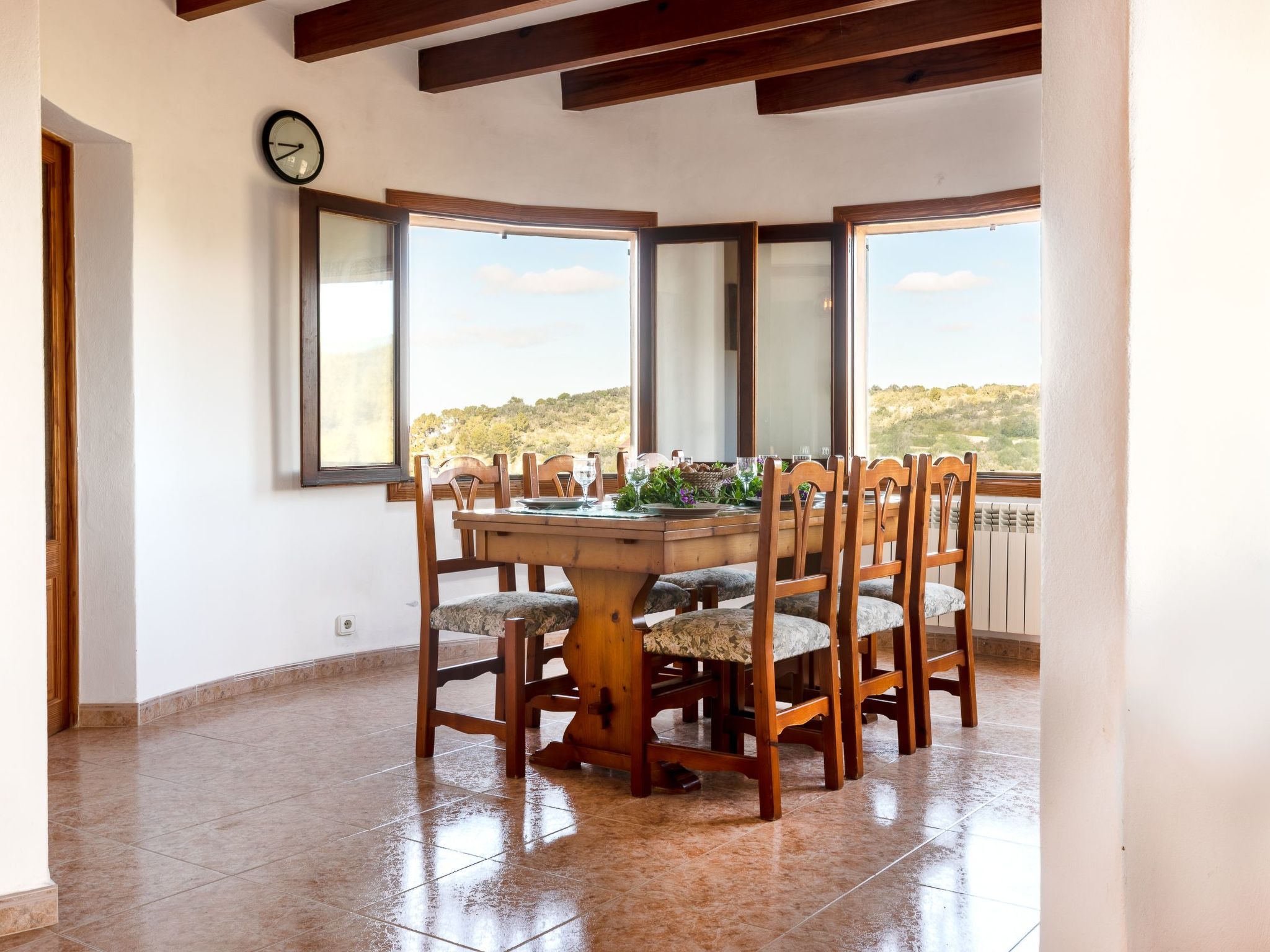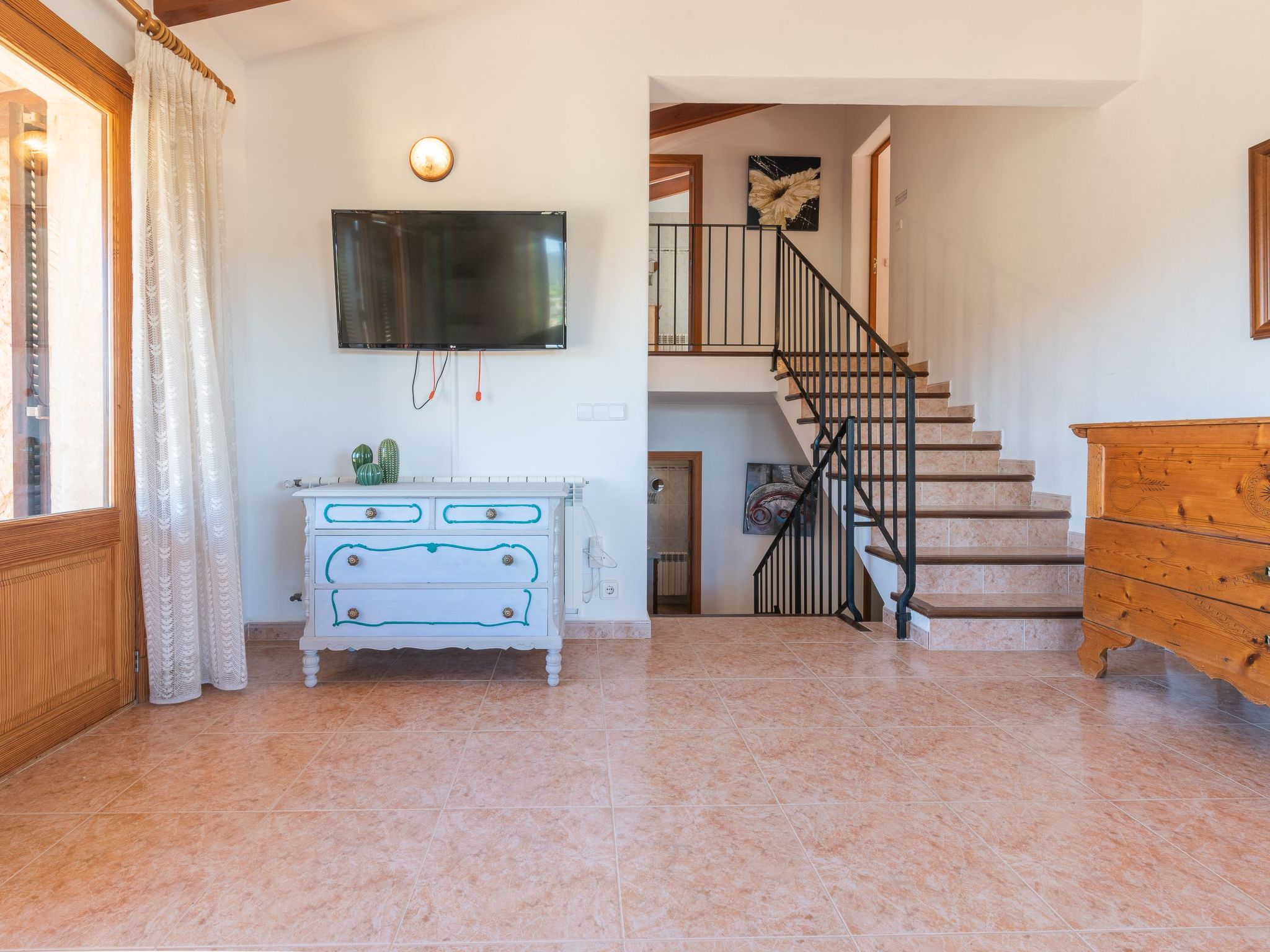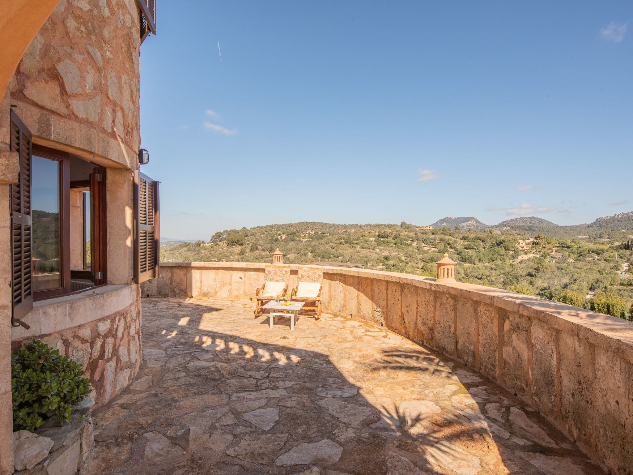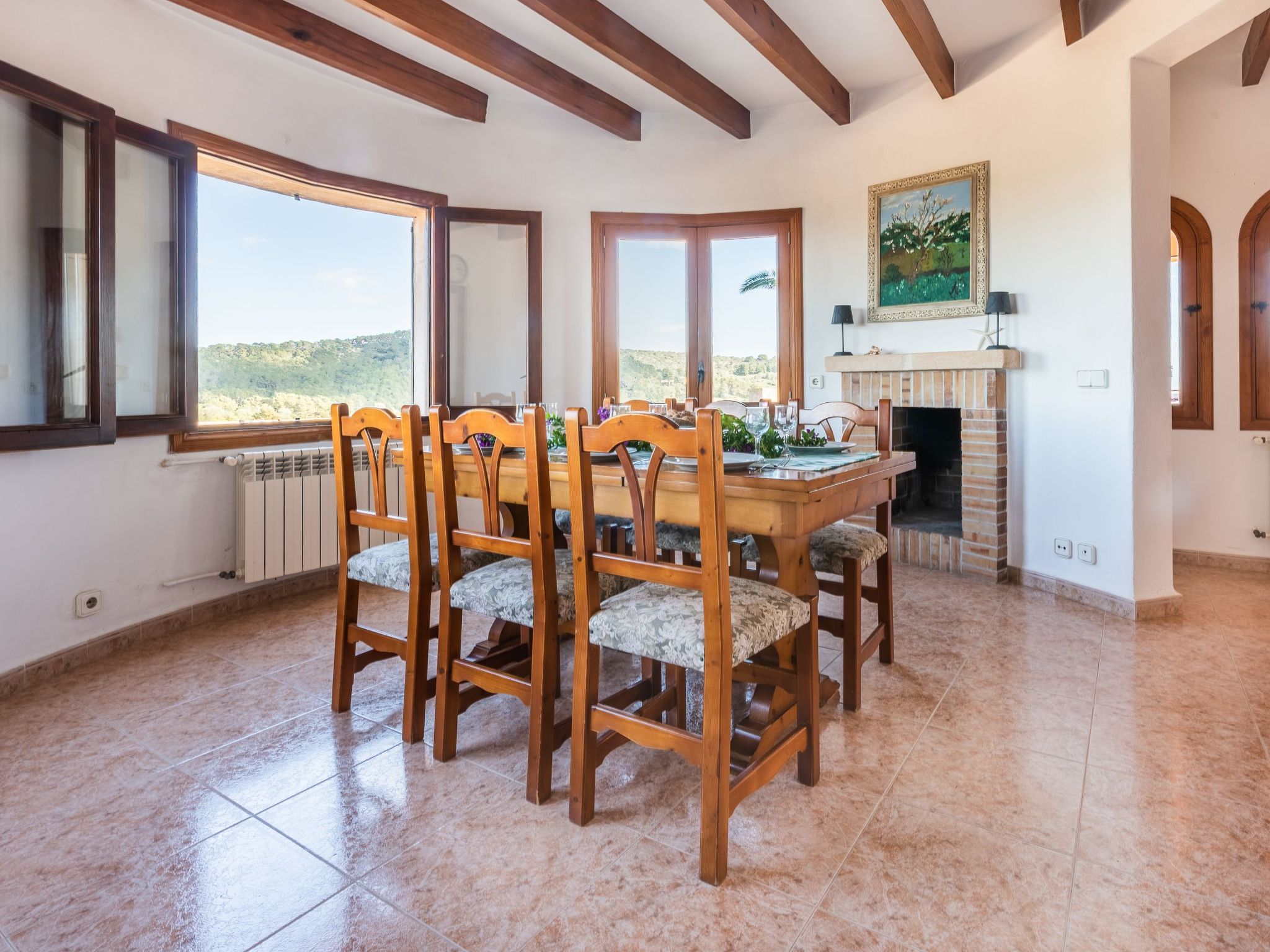 Roca is a beautiful holiday finca with a side tower. The house, whose exterior walls are clad in natural stone, is divided into three levels. On the ground floor there is a hallway with open passageways to 2 dining areas, one with a fireplace, the other with an archway to the spacious kitchen, which is well equipped and has direct access to the covered terrace with dining table. This floor has a shower room and a utility room with washing machine. A staircase leads to the floor, where there are two bedrooms. One bedroom with a single bed with a small, covered terrace with views of the surrounding area and a second bedroom with a double bed and balcony with beautiful views can be found here. These bedrooms share a bathroom. From here a few steps lead up to the middle floor where there is a twin bedroom with a small balcony overlooking the central plain of Mallorca. The lounge is in the tower and has glass doors that give access to the lovely terrace with views of the surrounding area with the coast in the distance. A few steps lead to the top floor where there is a double bedroom, a separate bathroom with shower and a terrace with marvellous views.