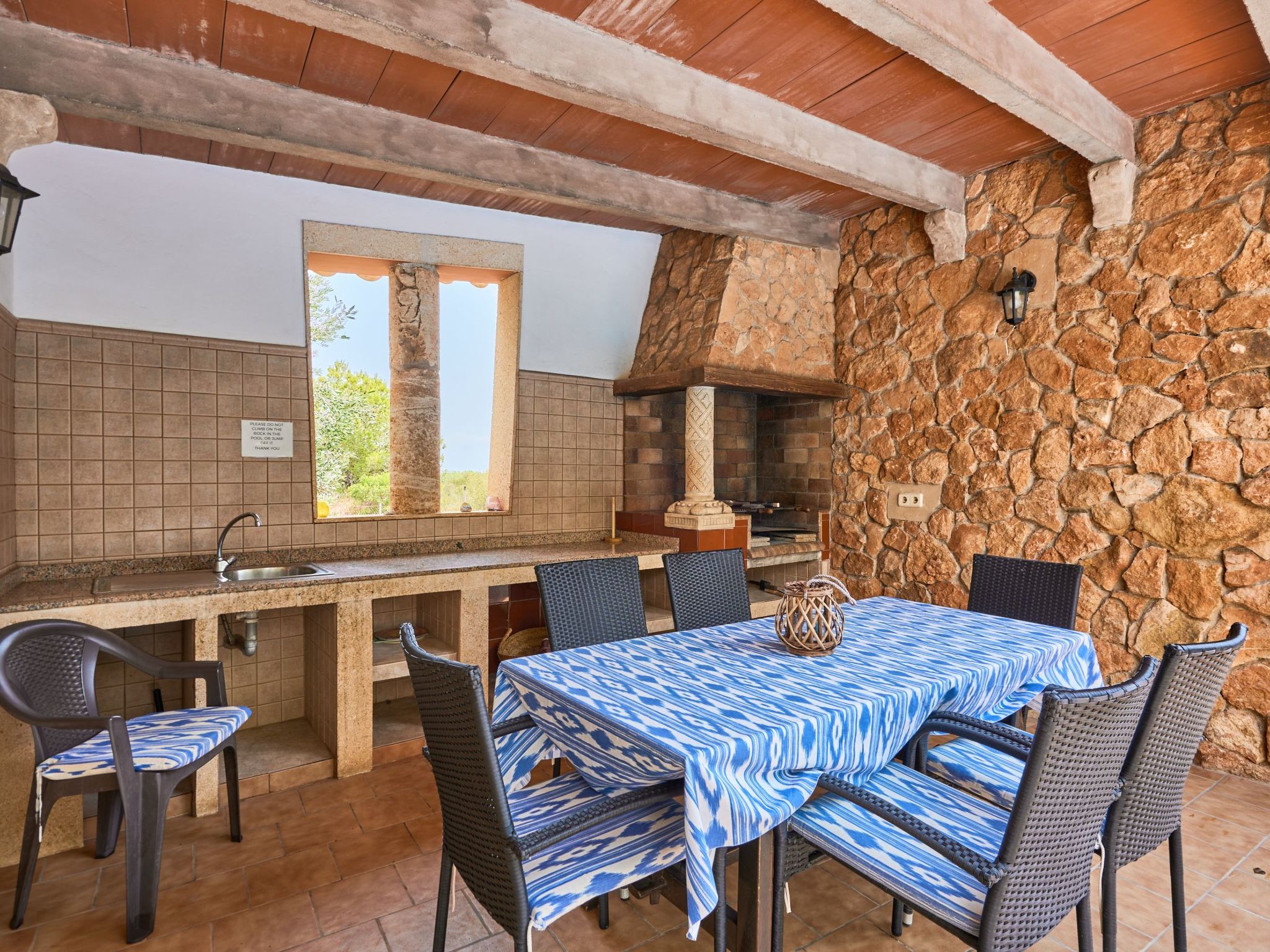 The outdoor area is equipped with a further dining table for 10 people and a cosy chill-out corner. A barbecue hut with a brick barbecue, sink and storage table is available for cosy barbecue evenings. Surrounded by the Mediterranean garden is the large private pool with sun loungers. There are plenty of sunny or shady spots to choose from.