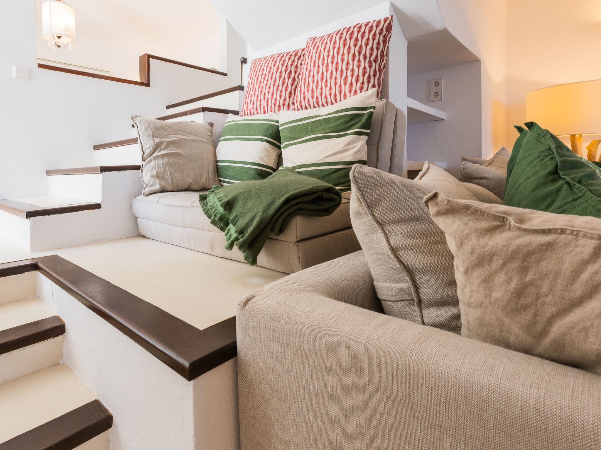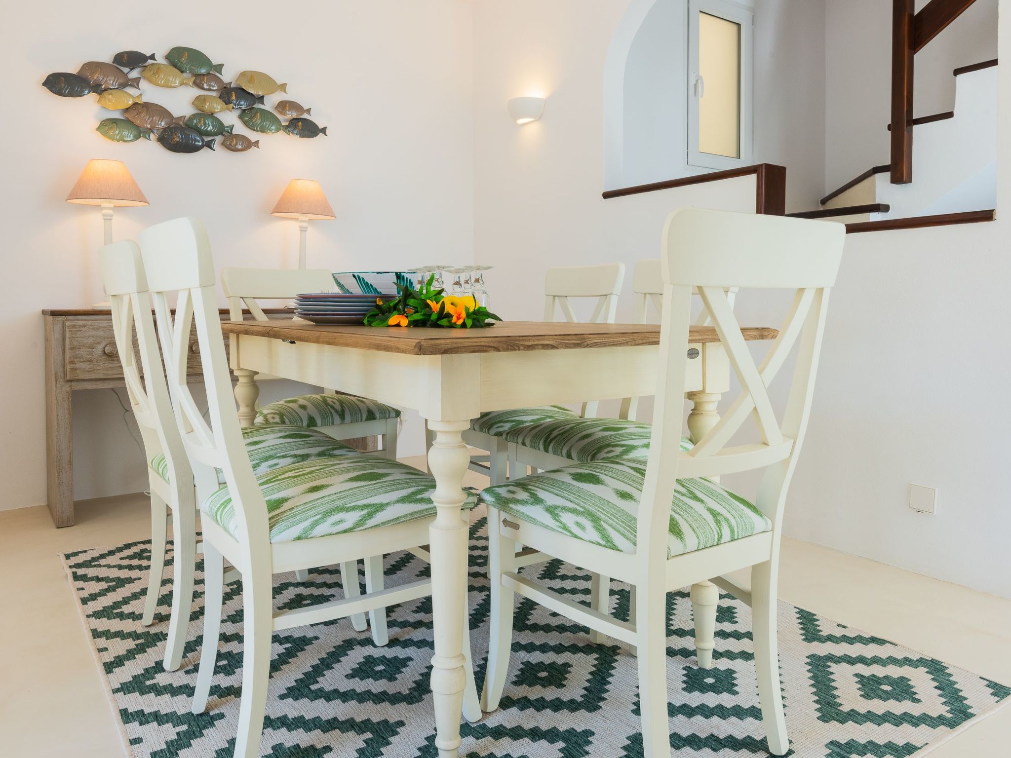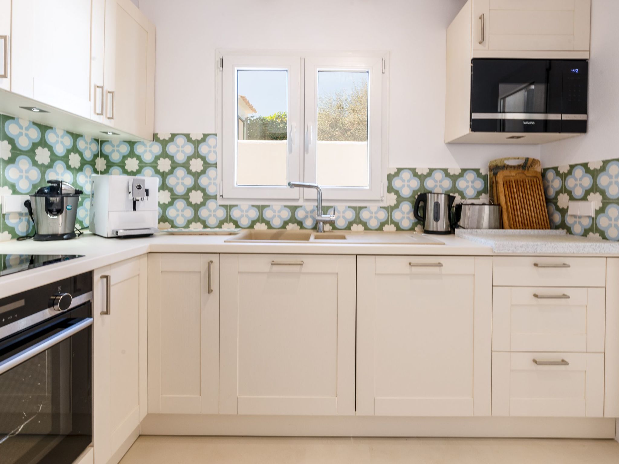 The house is spread over two floors, the furniture in neutral colours with accentuated splashes of colour gives the interior of the house a cosy, relaxing atmosphere. The bathrooms and kitchen have a vintage style and the ground floor has a kitchen with pantry, where the washing machine and tumble dryer are located. The dining room offers access to a terrace overlooking the garden. The living area is very cosy and has a reading corner, both offer access to the main covered terrace with views of the pool and the sea. A guest toilet completes the ground floor. There are three double bedrooms on the floor. One of them offers an en suite shower room and a private balcony with incredible sea views. The other two bedrooms share a separate bathroom with bathtub and access to a balcony overlooking the garden.