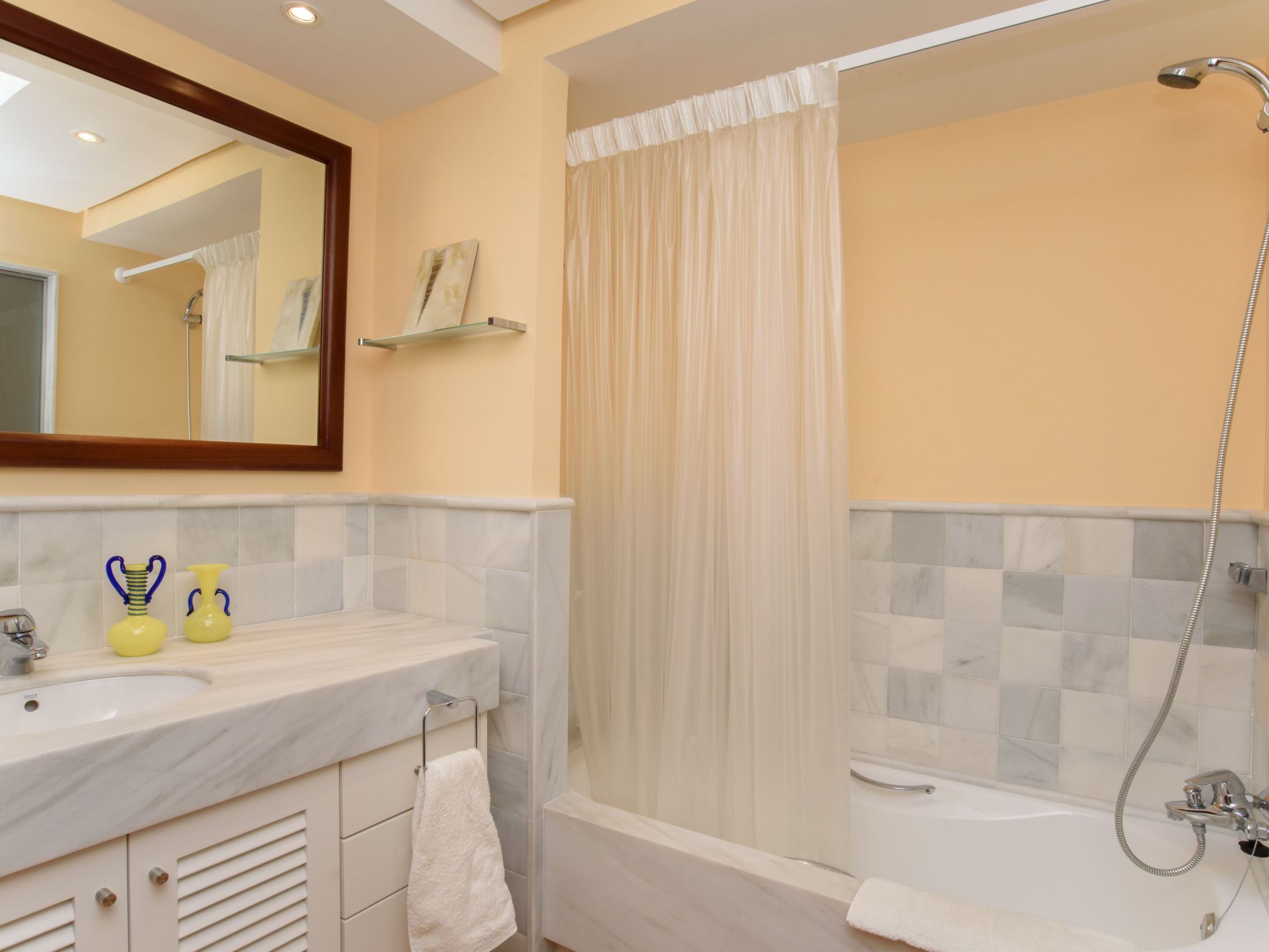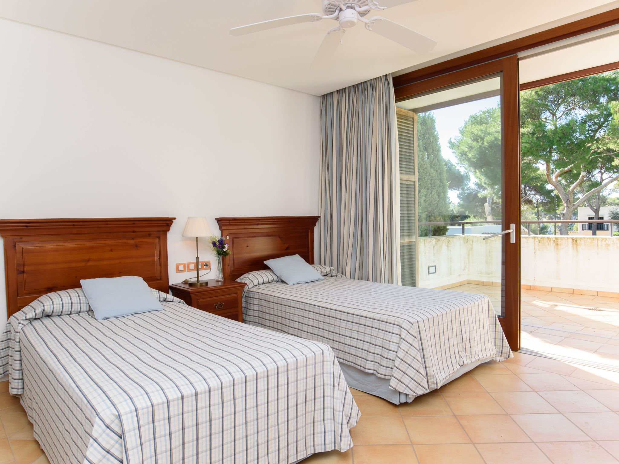 Villa Samar is generously constructed on two floors. The entrance area leads to the left into the open, very spacious living room with large sliding glass doors that open onto the covered terrace and the garden/pool area. The living room flows into the open-plan dining room. Behind it is the fully equipped kitchen with access to the terrace. To the right of the entrance, a corridor leads to two bedrooms, each with two single beds, both with access to the garden and pool and each with a full bathroom en suite. There is also a guest toilet on the ground floor. On the floor there are two further bedrooms, each with two single beds, access to a large shared balcony/terrace and both with a full bathroom en suite.