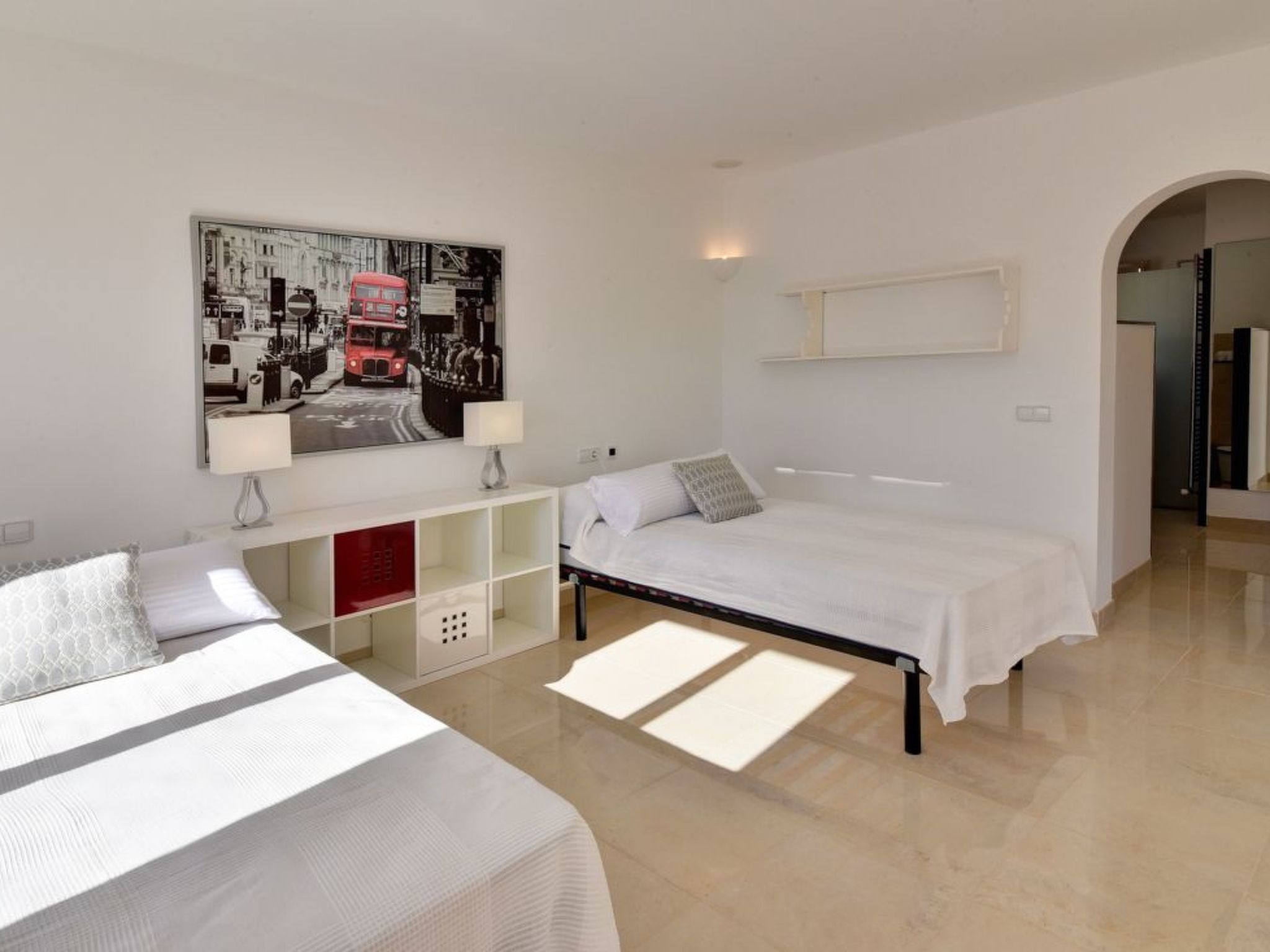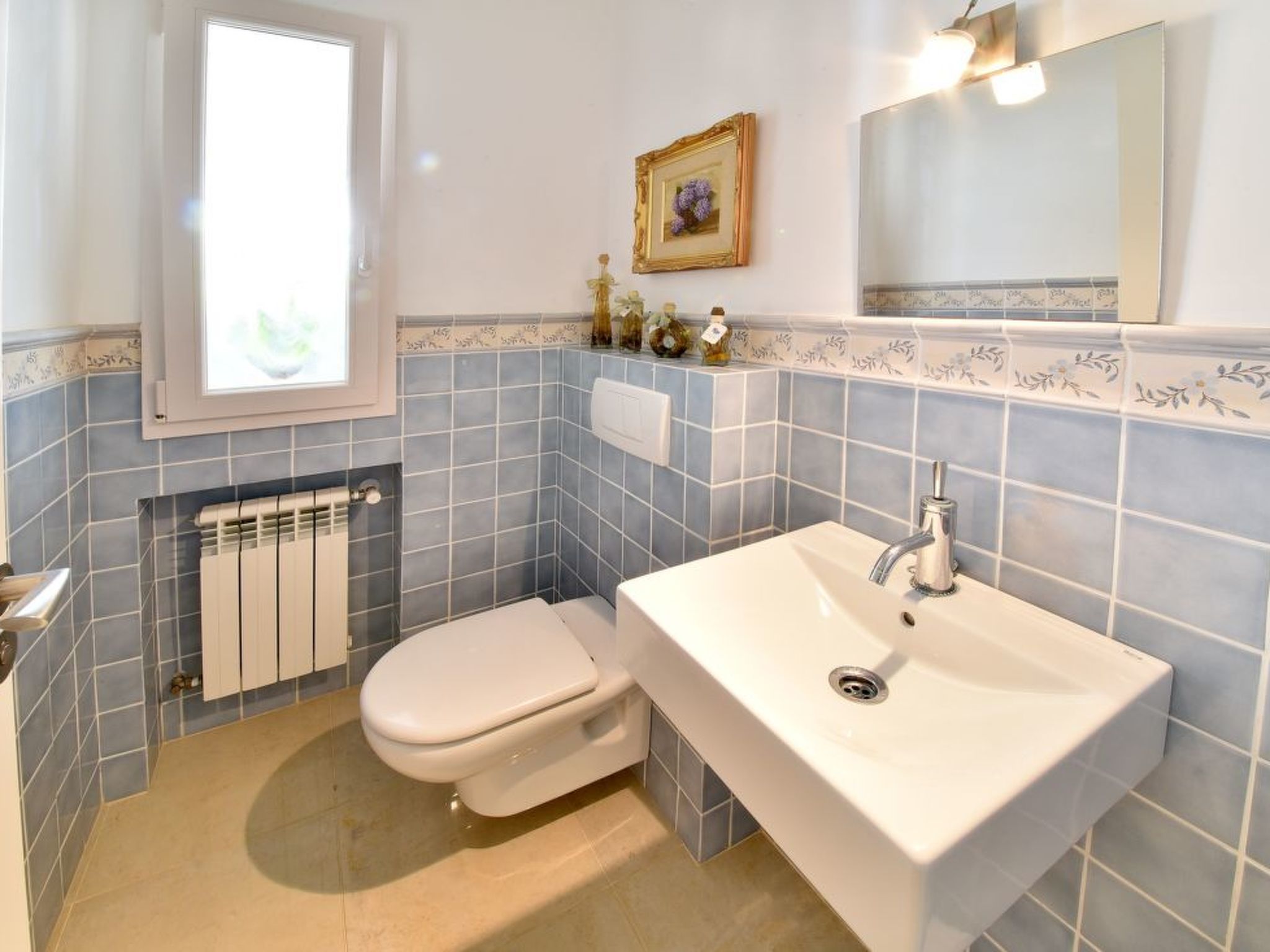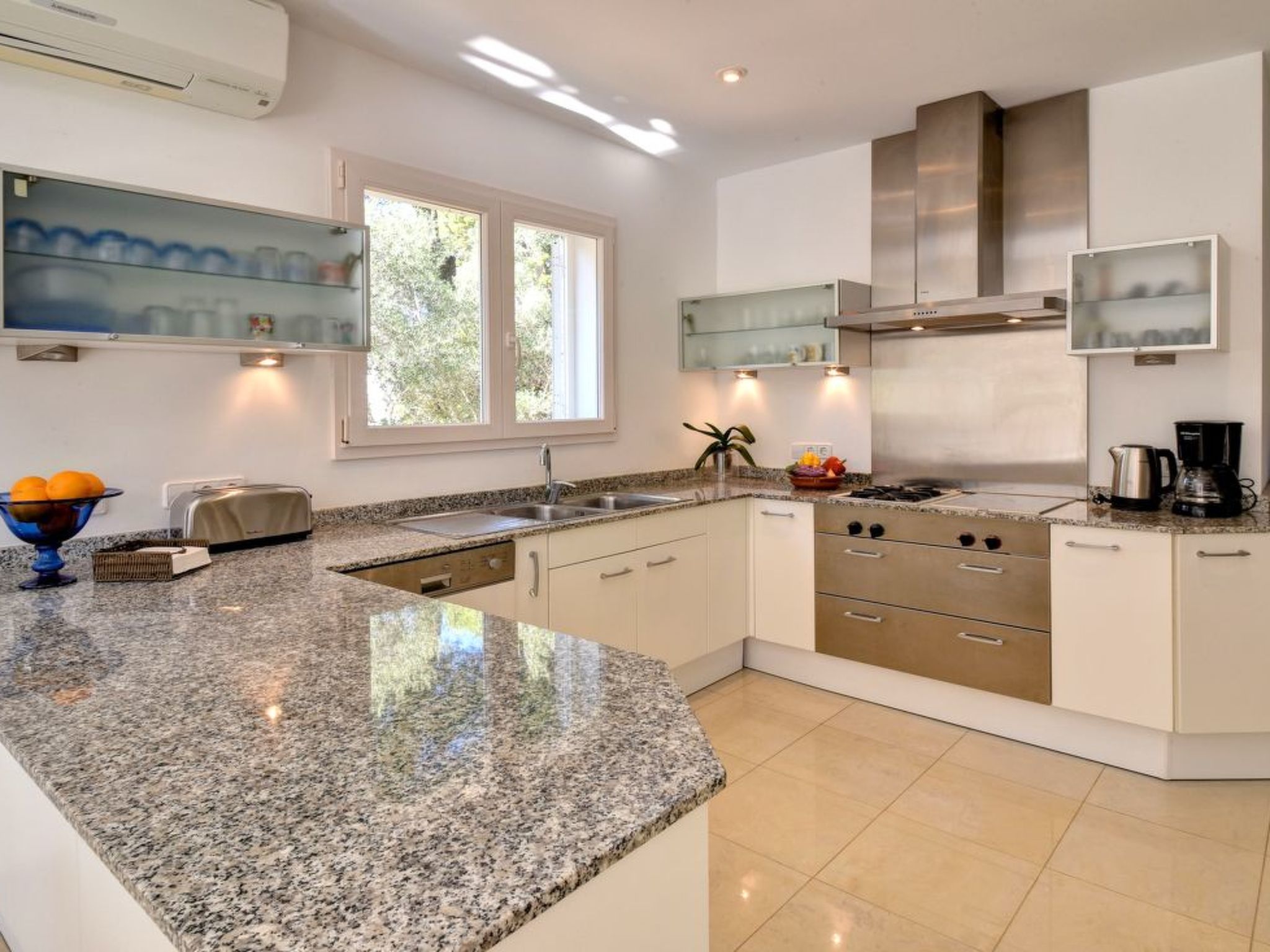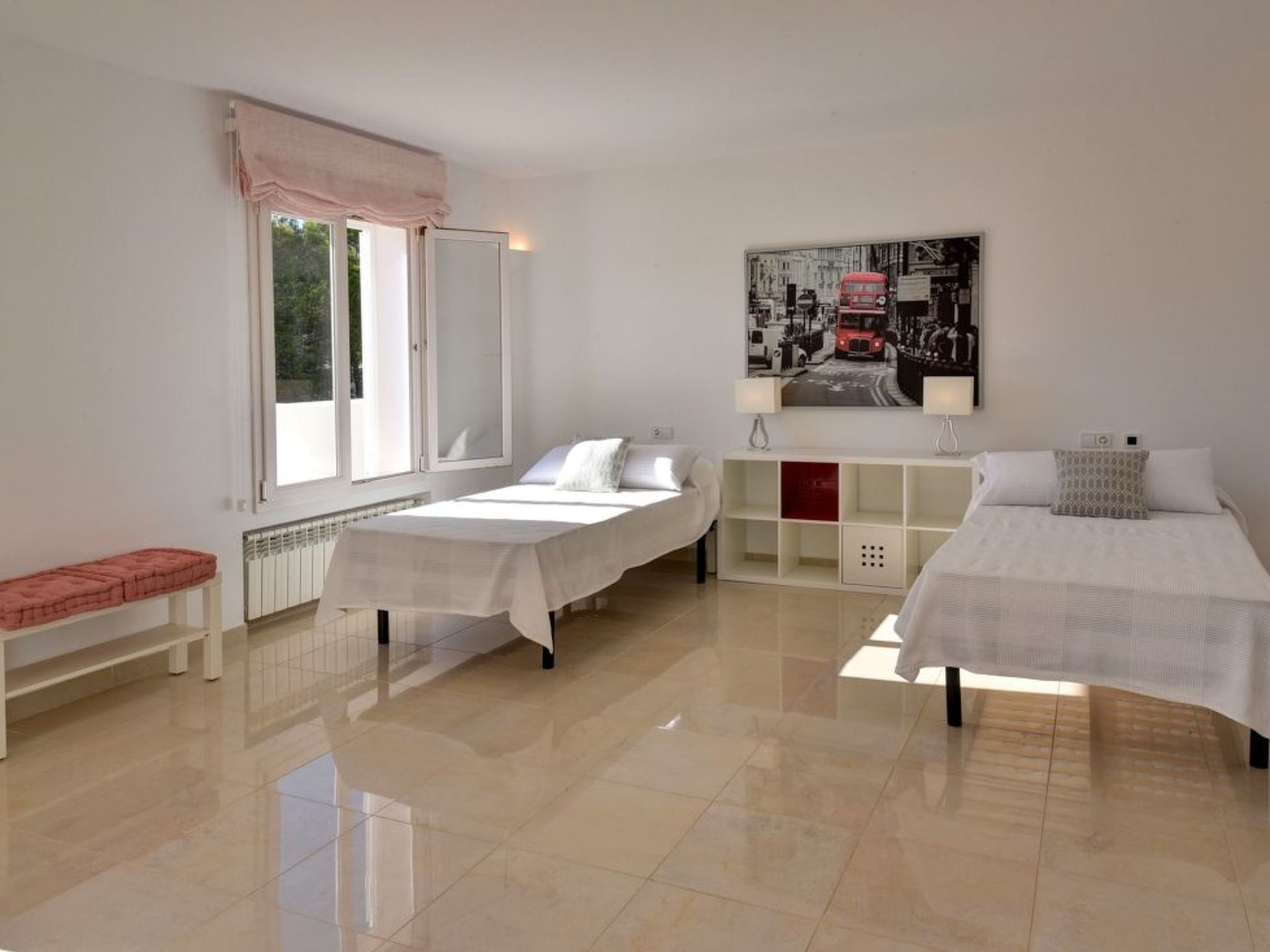 This spacious, light and airy villa consists of several levels. On the street level there is a spacious open-plan living/dining room with access to the covered terrace overlooking the lower pool area - this terrace also offers a vertical awning. The modern and large kitchen is equipped with a further dining table. Utility room and guest WC available. There is also the master bedroom with a double bed and en suite bathroom with separate bath and shower, as well as two twin bedrooms sharing a separate bathroom. On the upper floor there is a very spacious twin bedroom with an open-plan bathroom with shower. This bedroom has its own terrace with a lovely chill-out area and a side view of the small sandy bay of Cala Dor.