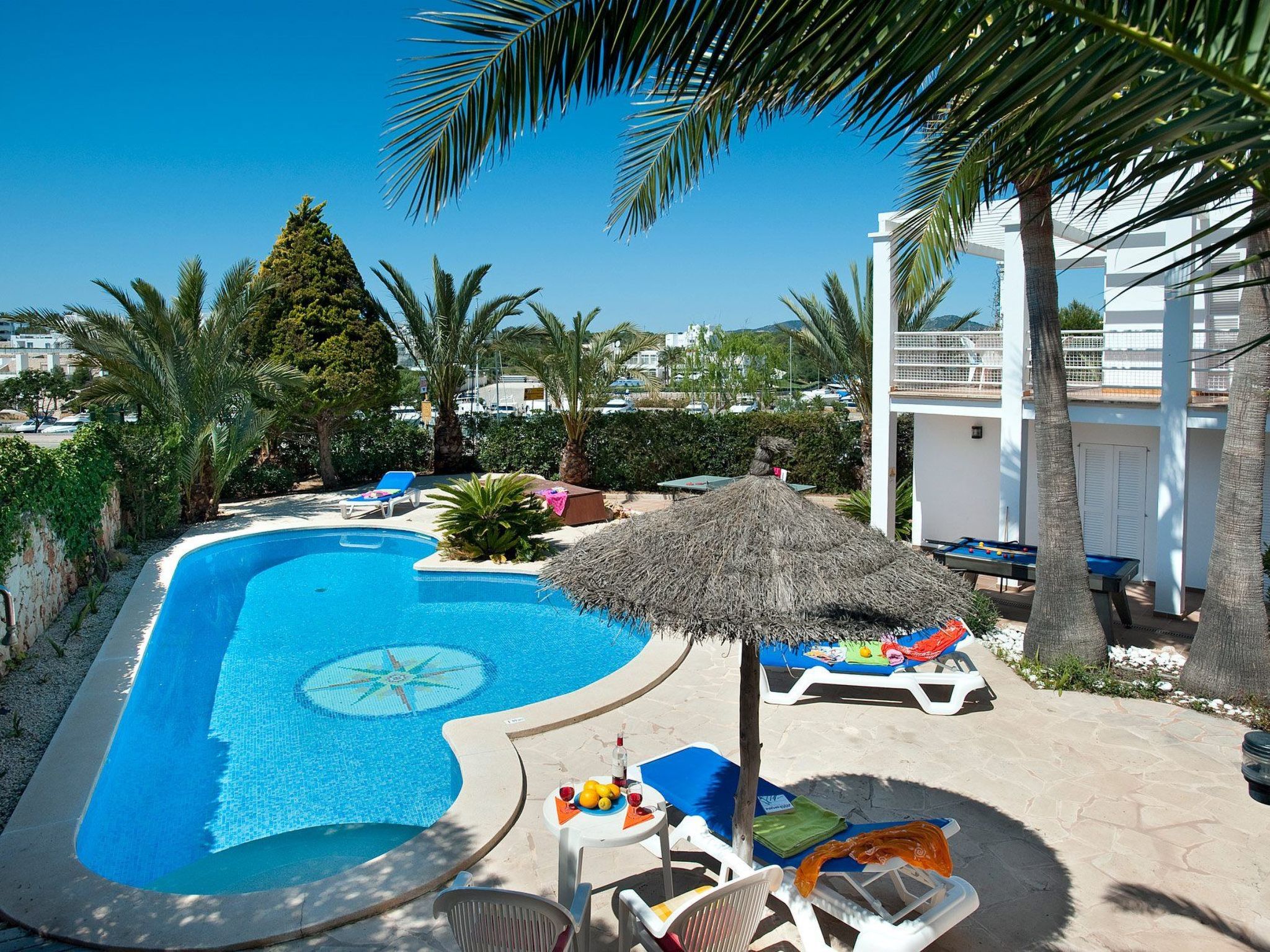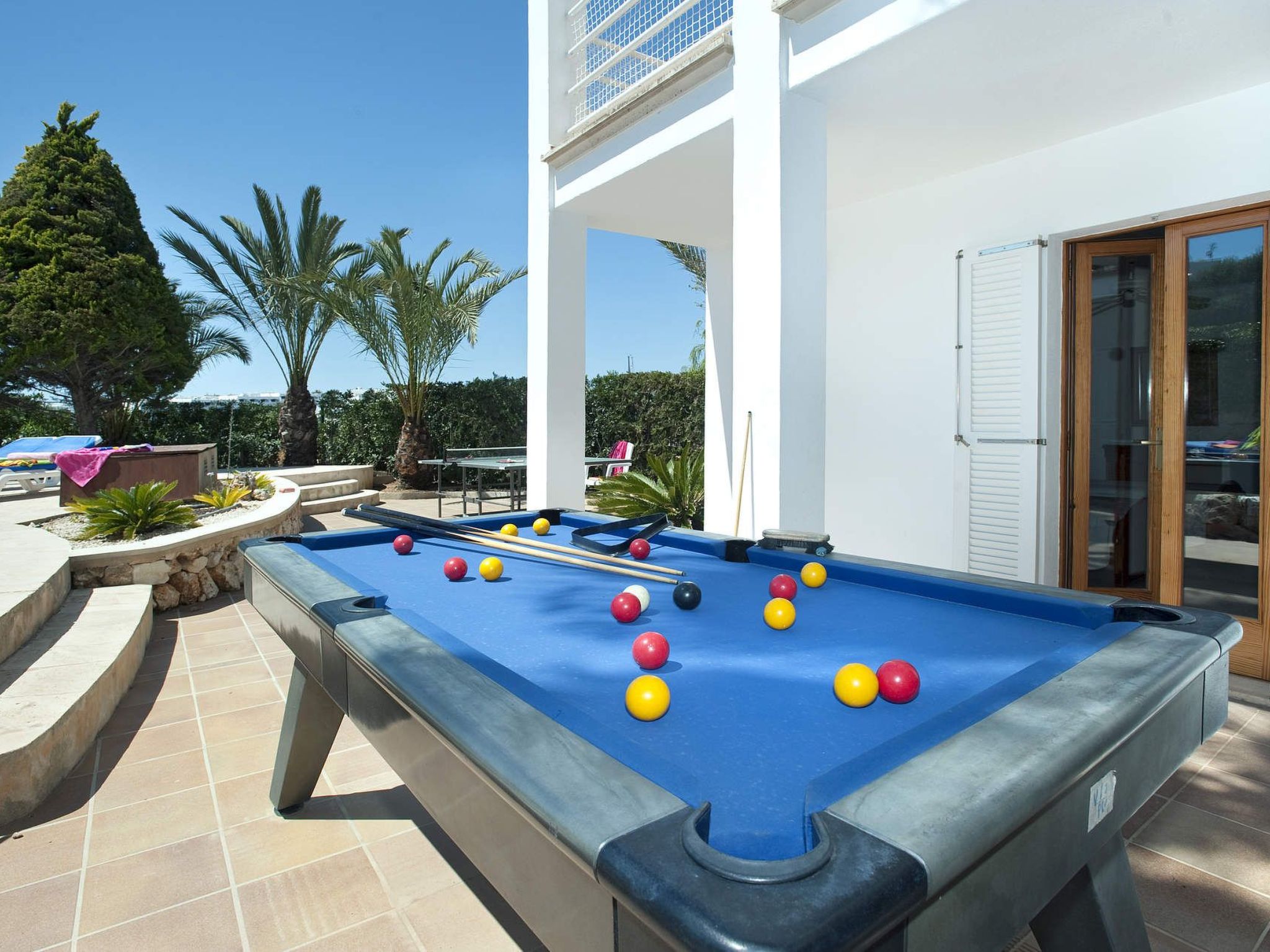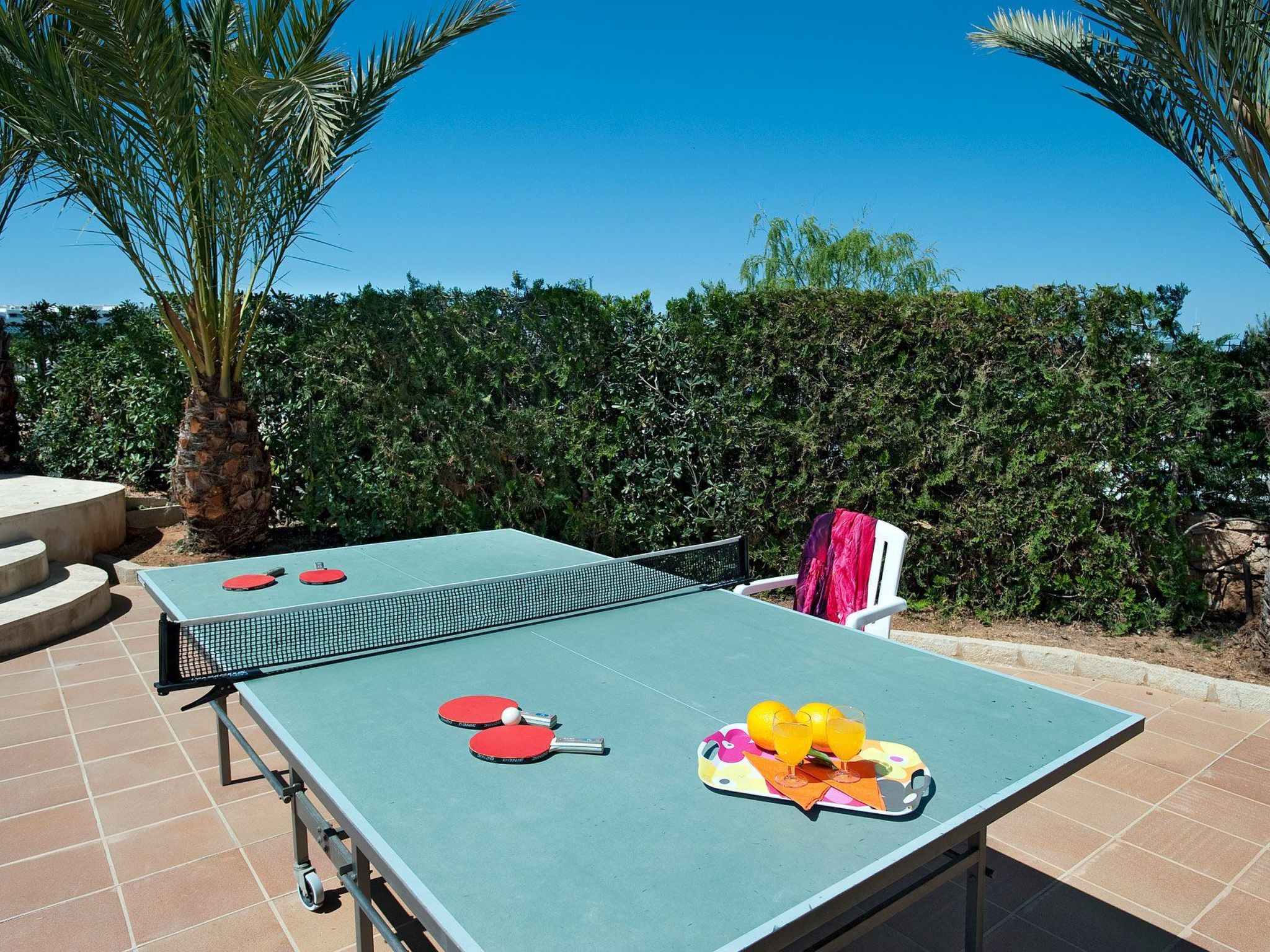 The pool is surrounded by a spacious terrace with palm trees and bushes. The ideal place to sunbathe and relax. There is a pool table, a table tennis table and a brick barbecue.