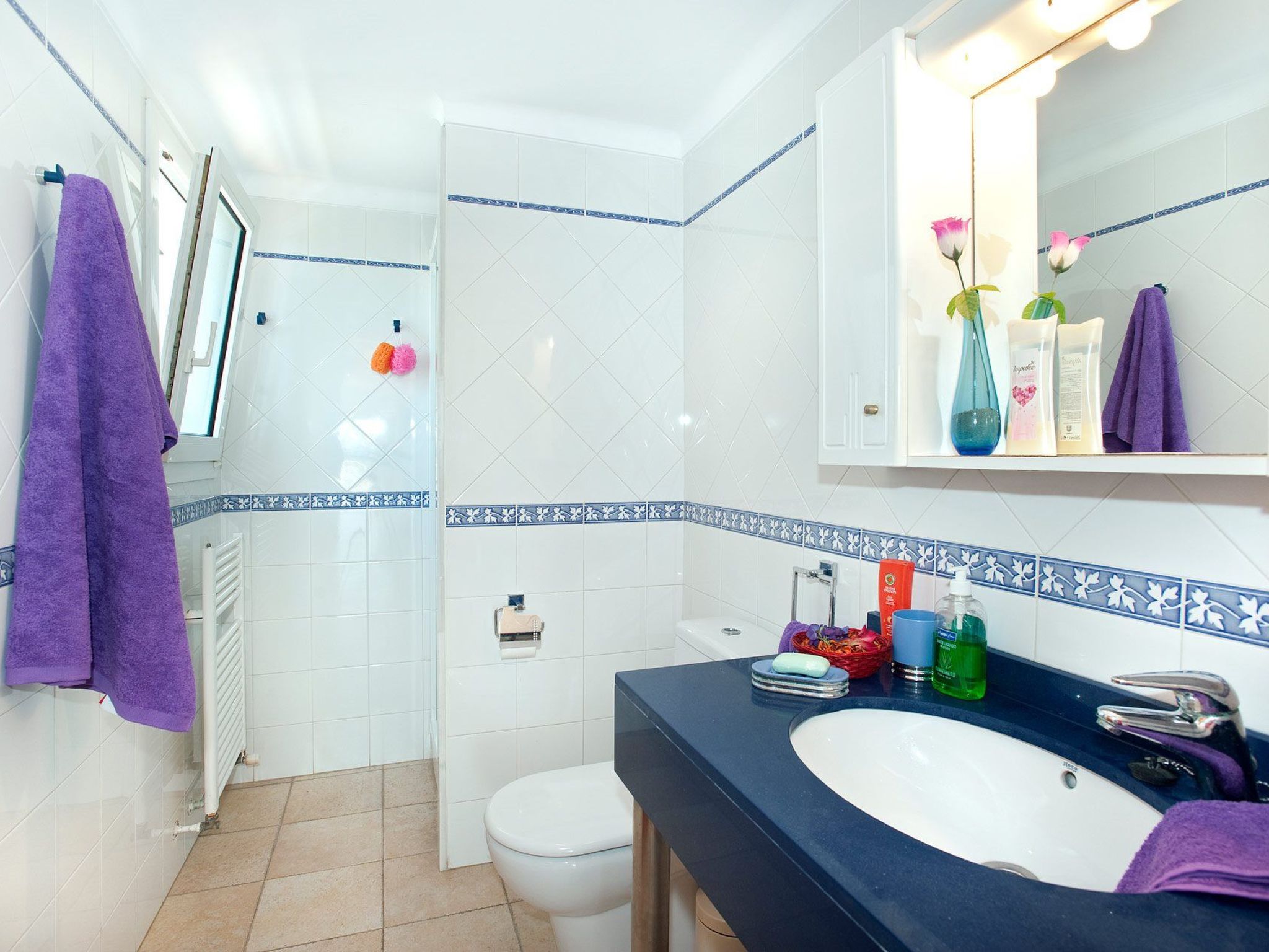 Villa on two floors. On the upper floor is the living room with panoramic windows and views of the marina of Cala D'or and the dining area with access to the terrace. The kitchen is located next to the dining area. There is a table for al fresco dining on the marvellous terrace. A shower room completes this floor. On the ground floor there are 4 bedrooms, 3 of them with 2 single beds each, one with a double bed and each of the rooms has access to the pool terrace. The bedrooms share 2 bathrooms with baths and showers.