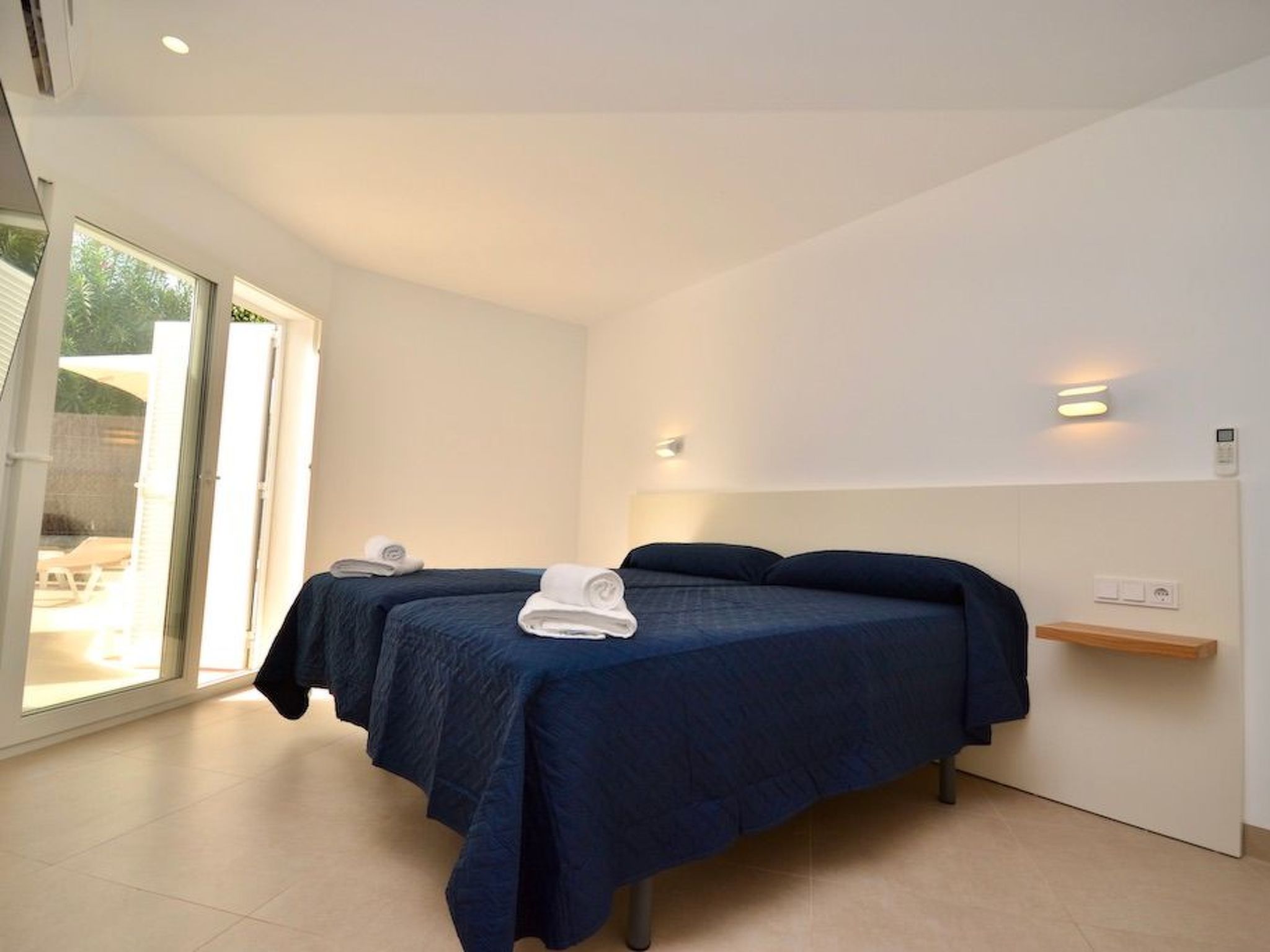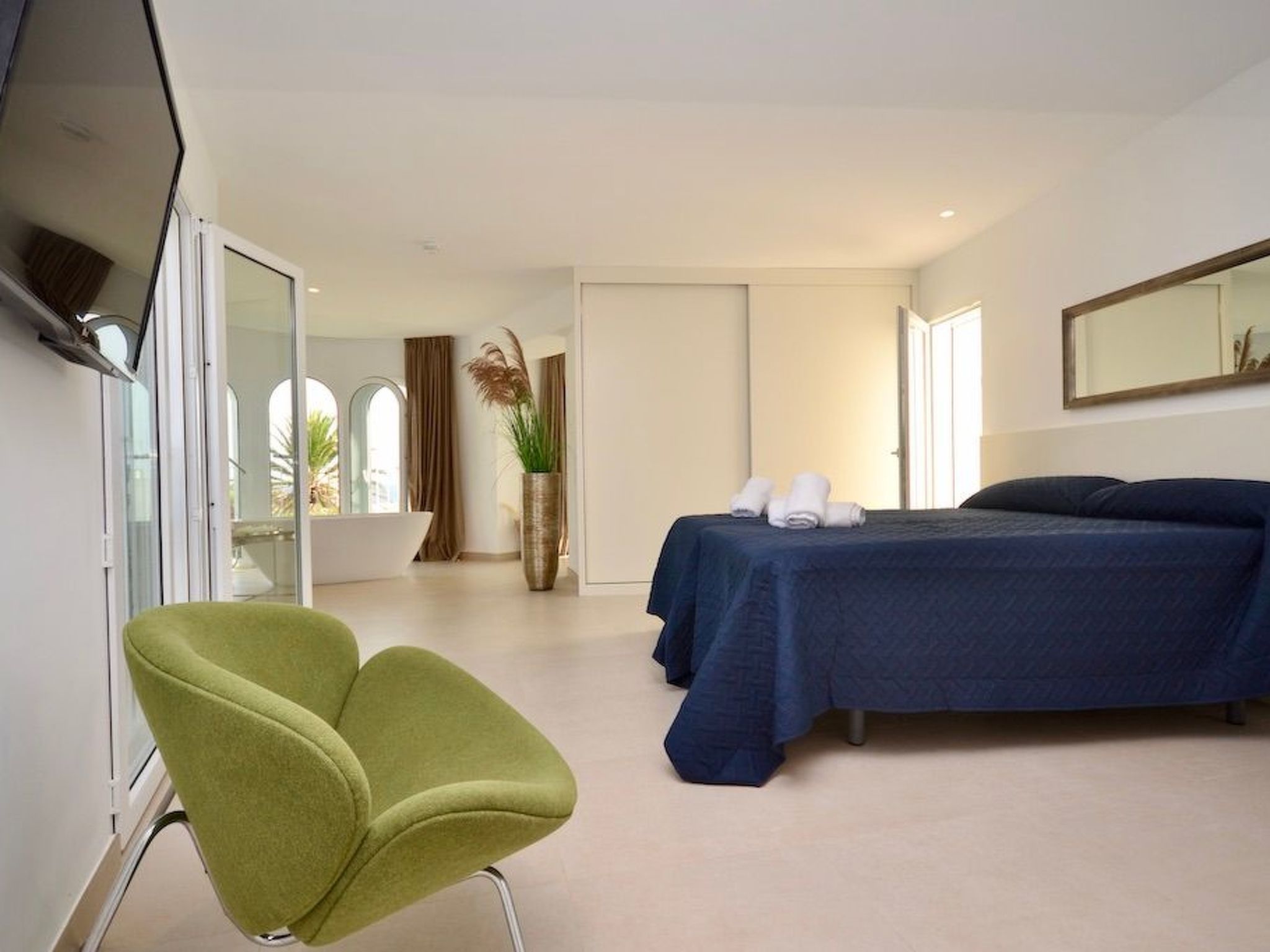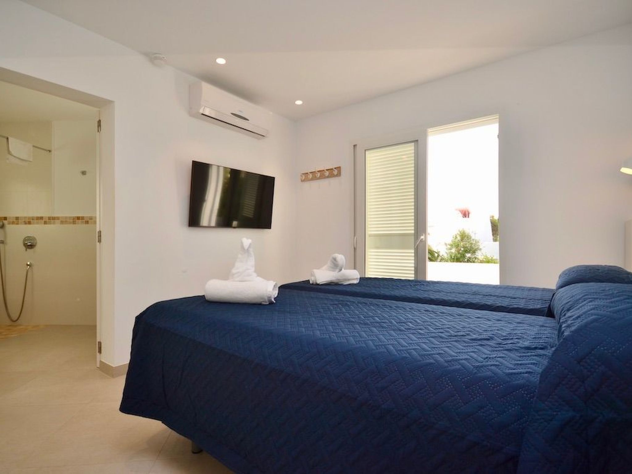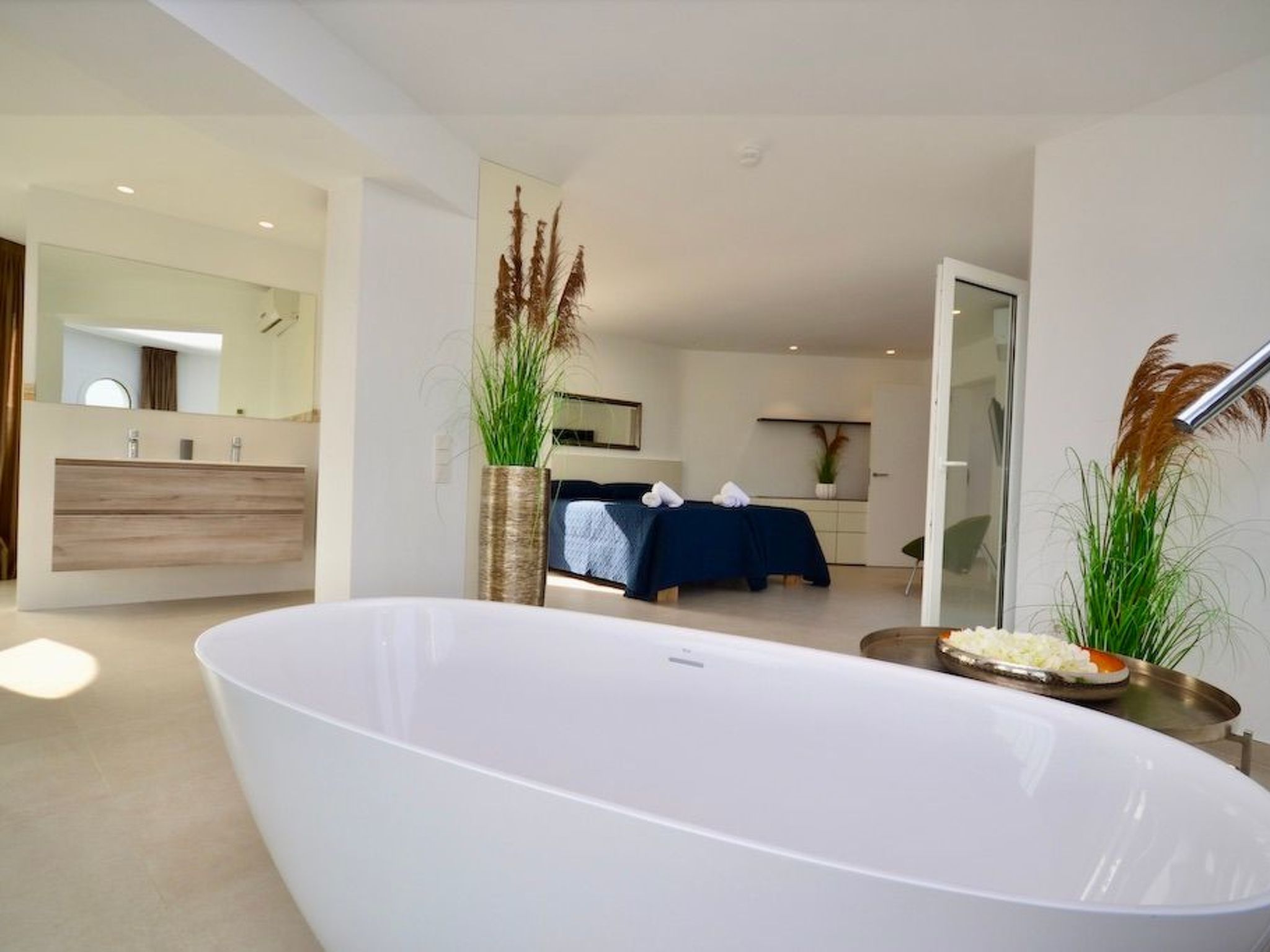 Depuis le jardin, on accède au premier étage par un escalier extérieur. Nous entrons dans la chambre à coucher principale, lumineuse et spacieuse, qui offre une vue partielle sur la mer via la baie semi-circulaire avec baignoire moderne. La salle de bain est entièrement intégrée. À ce niveau, nous trouvons deux autres chambres à coucher avec salle de bain en suite. L'une d'entre elles dispose d'un balcon.